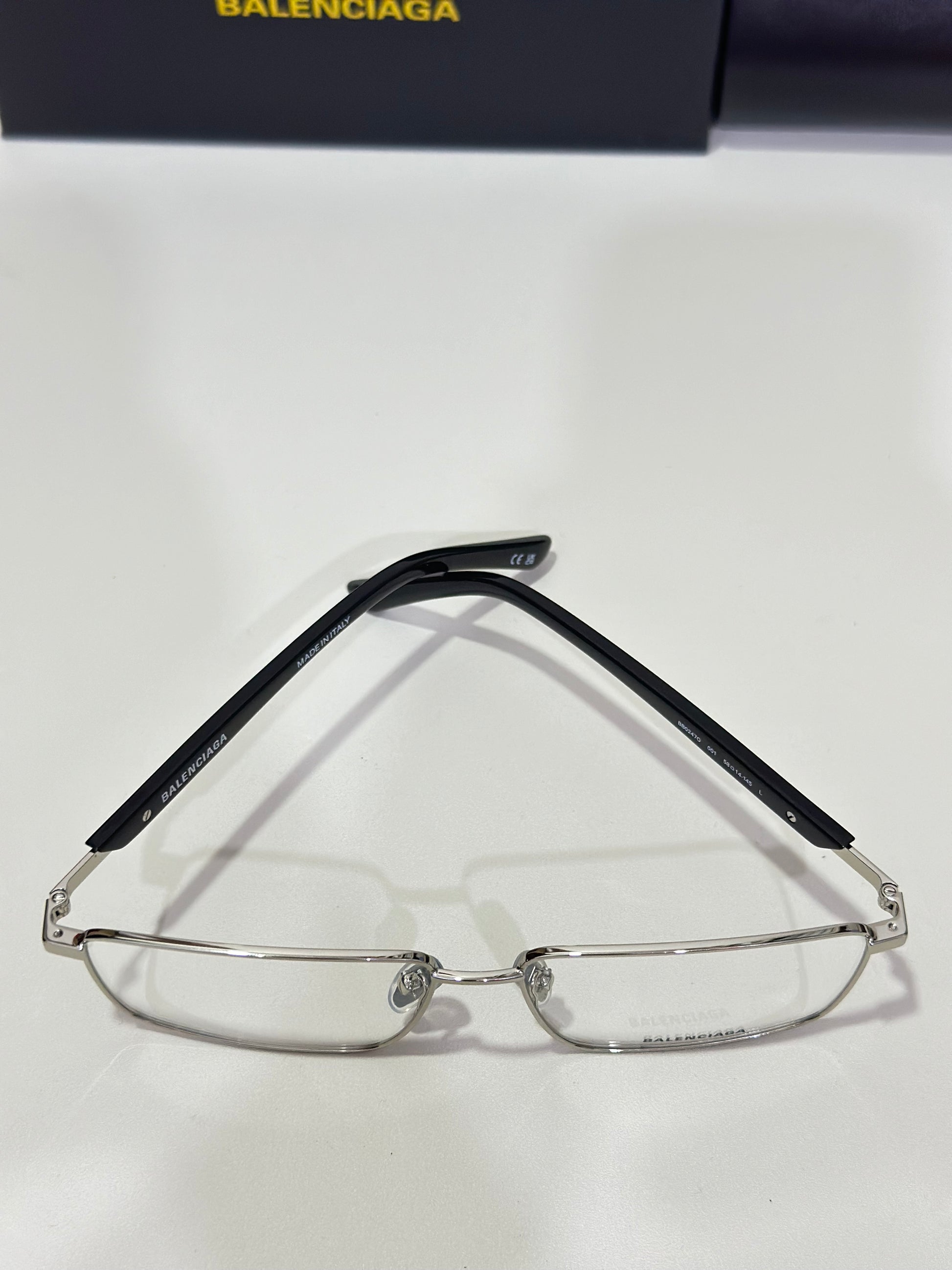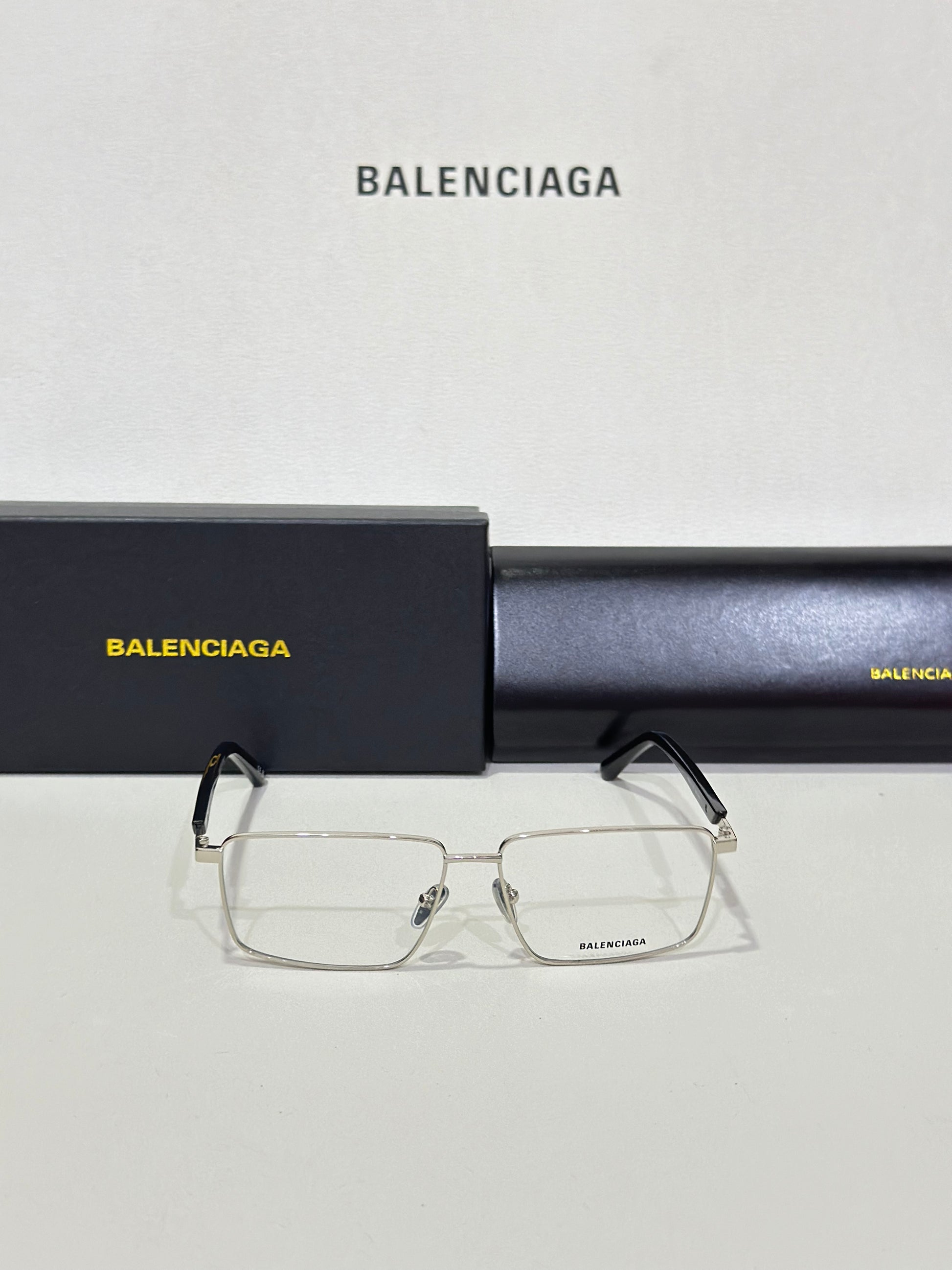 Balenciaga Everyday optical collection model BB0247O 001 featuring shiny silverframe and black temple.