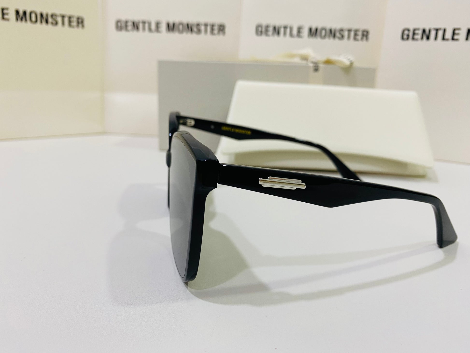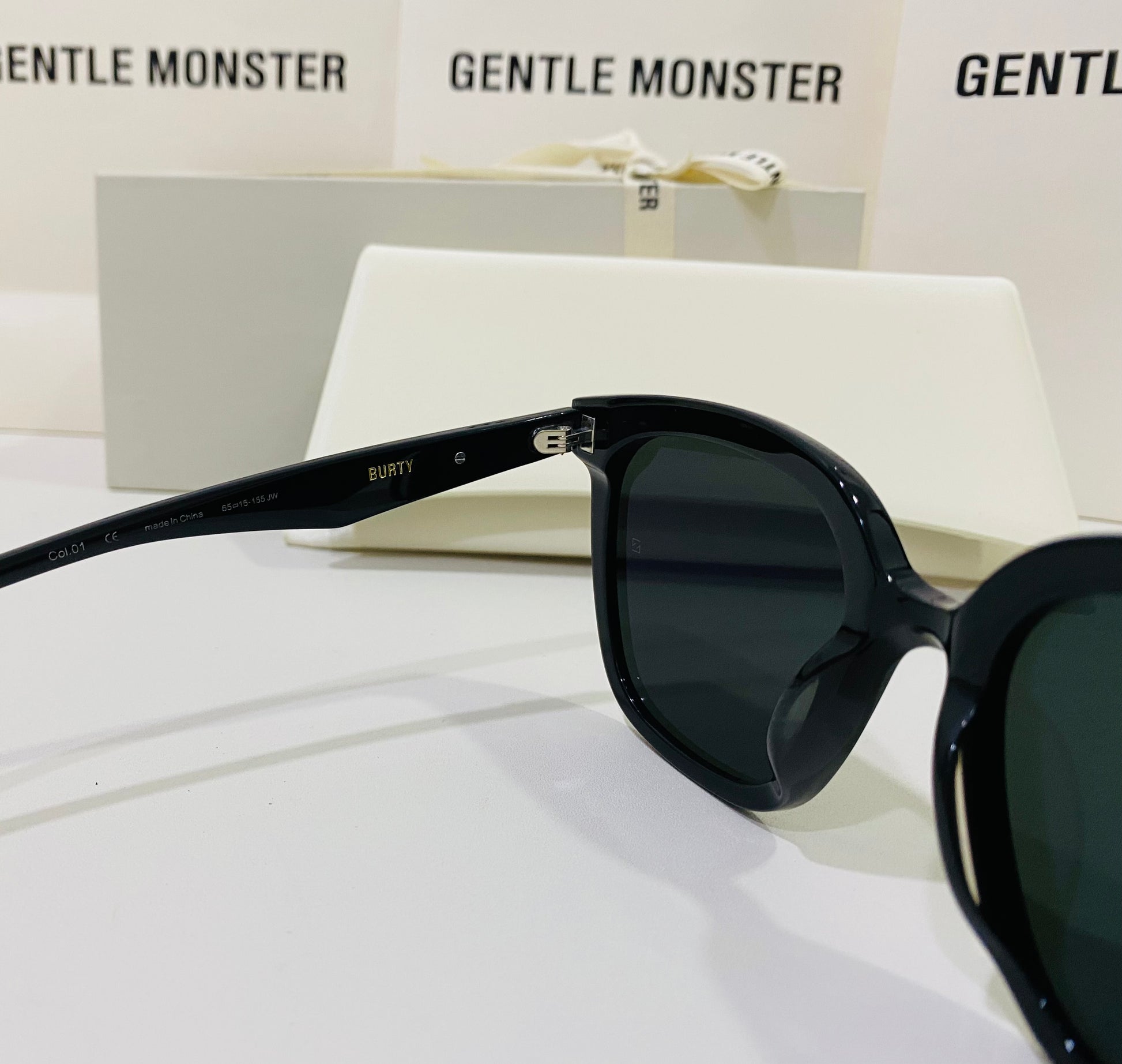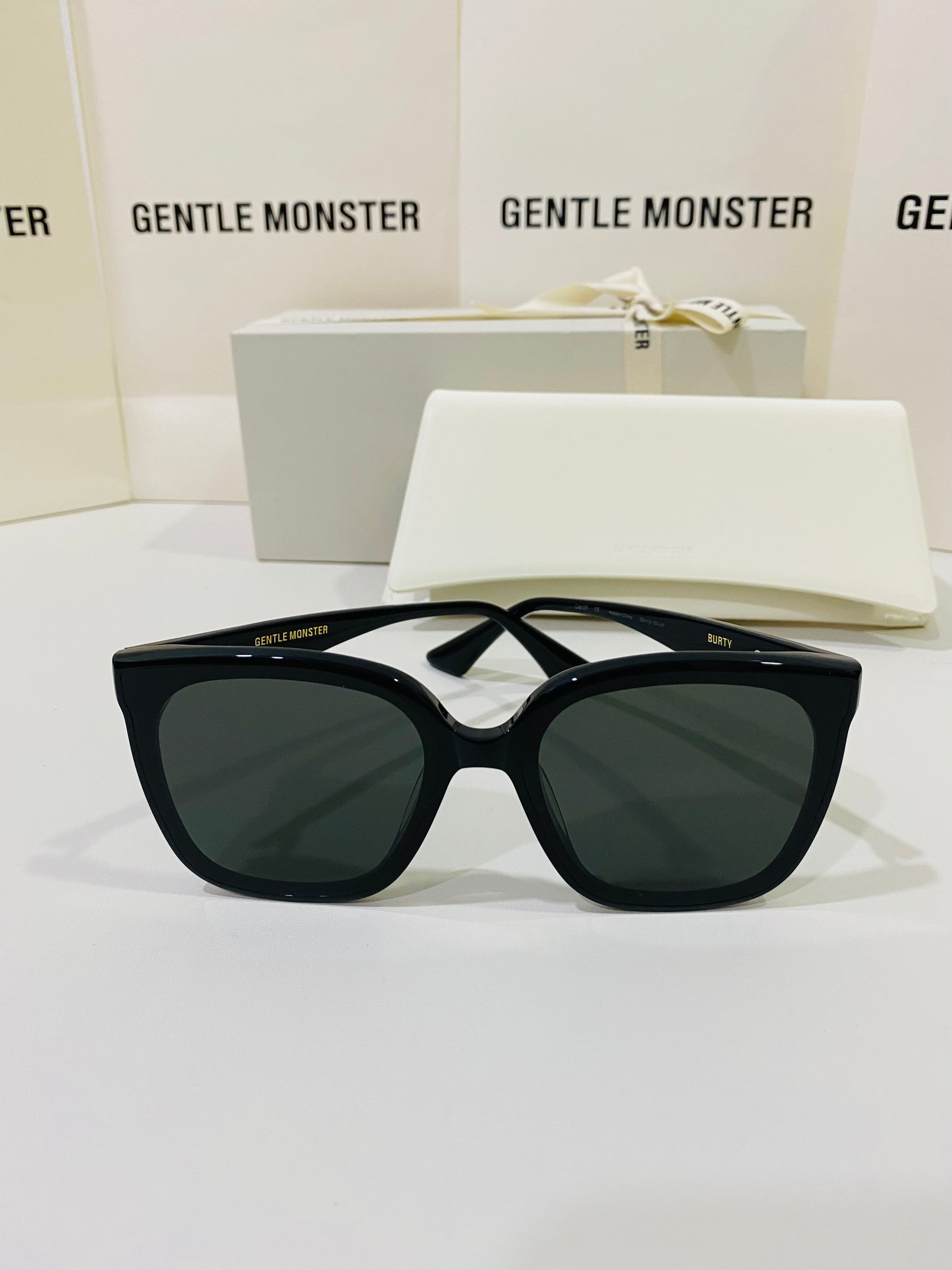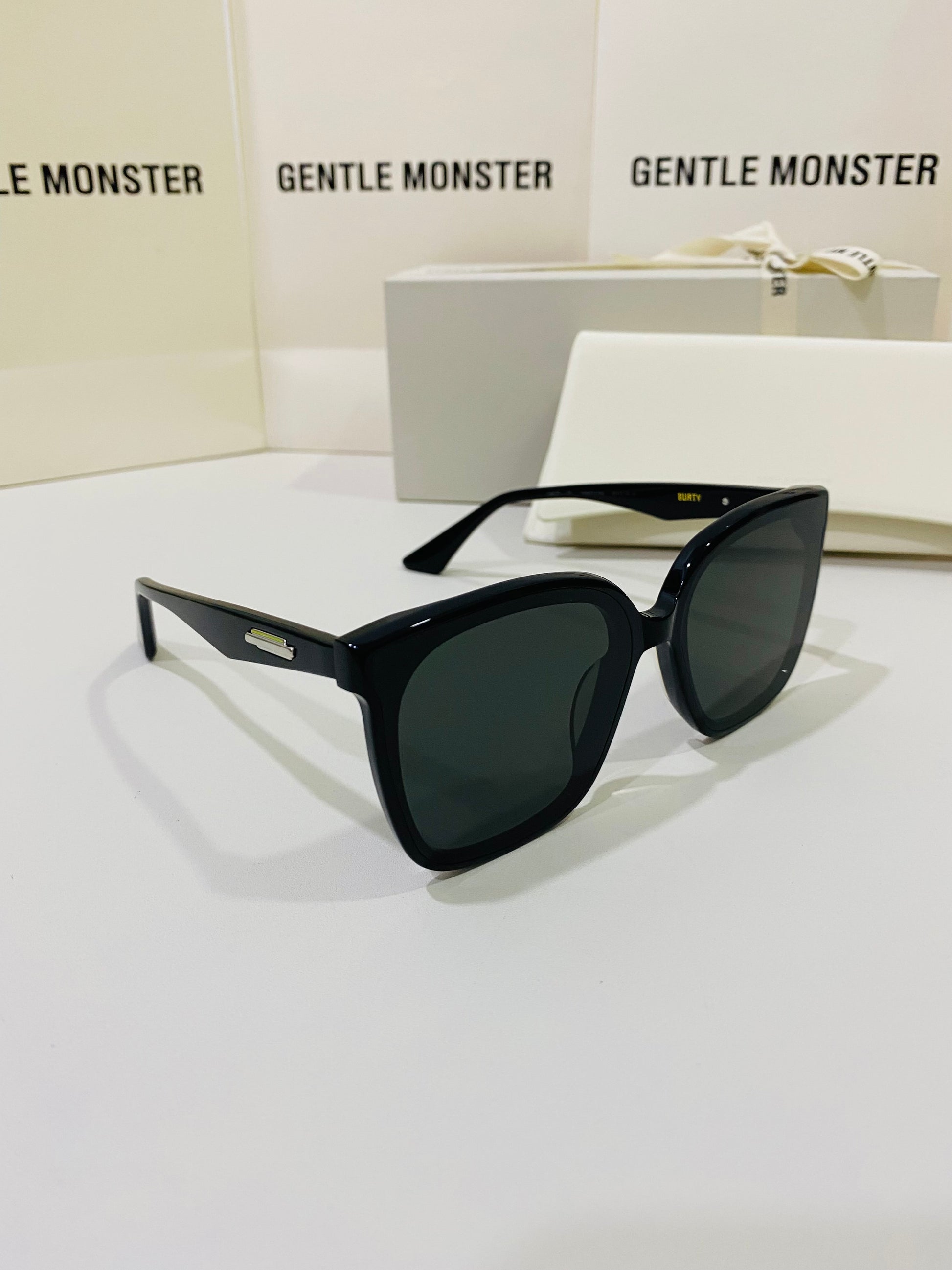 Burty 01 is an oversized black Flatba frame. The beveled curves are joined together by the bridge to create a unified and sophisticated design. The temples feature unique metal details and the frames are complemented by black lenses with 99.9% UV protection.