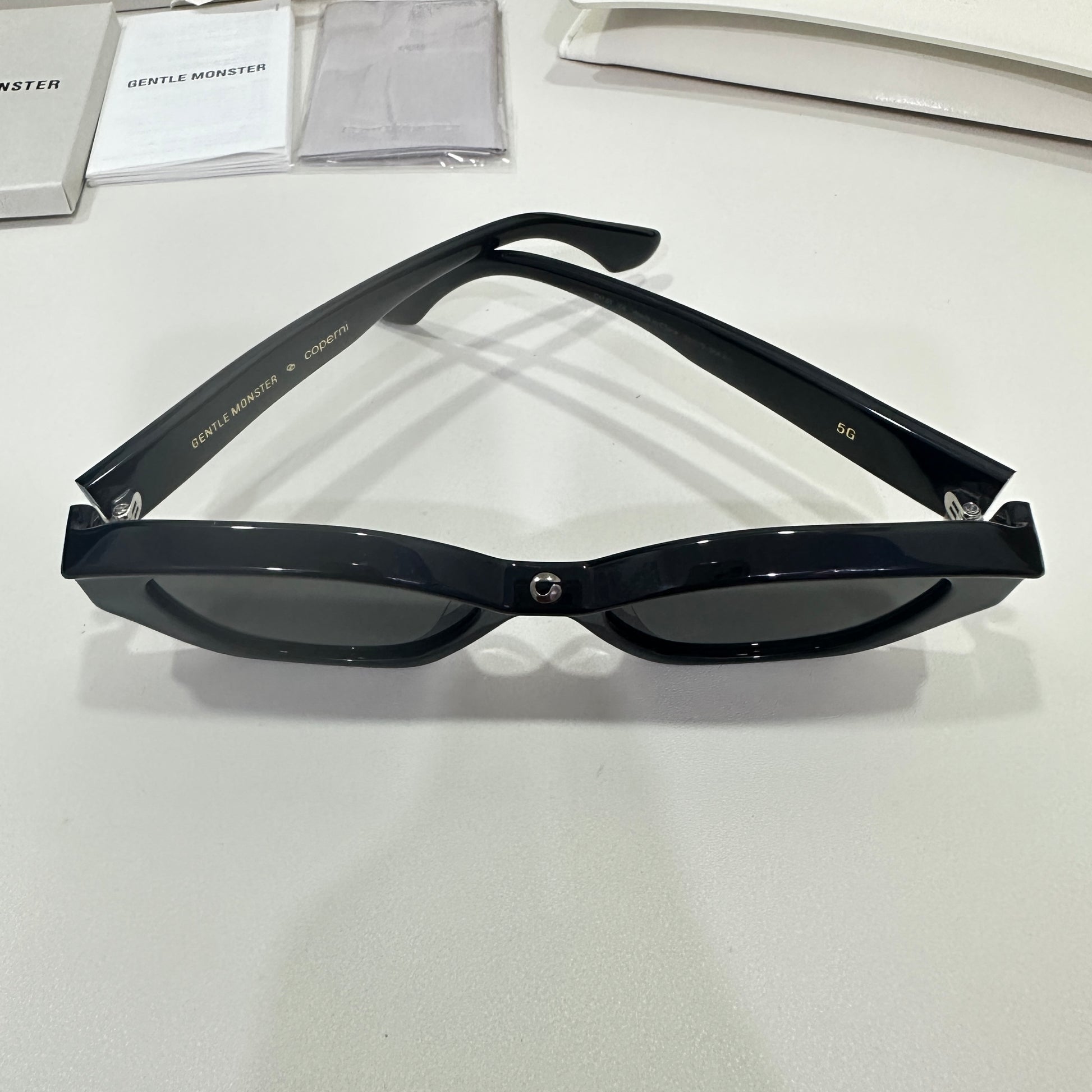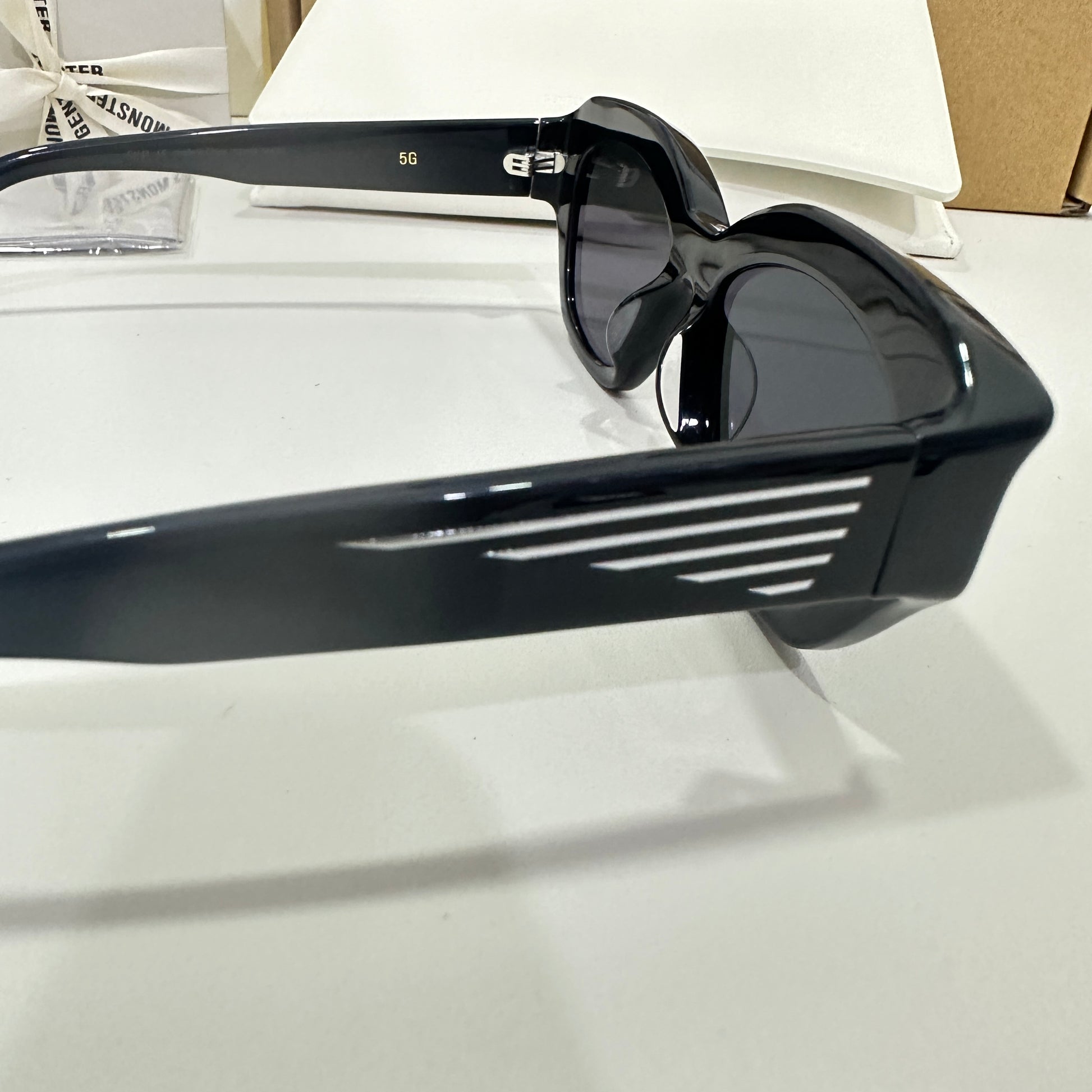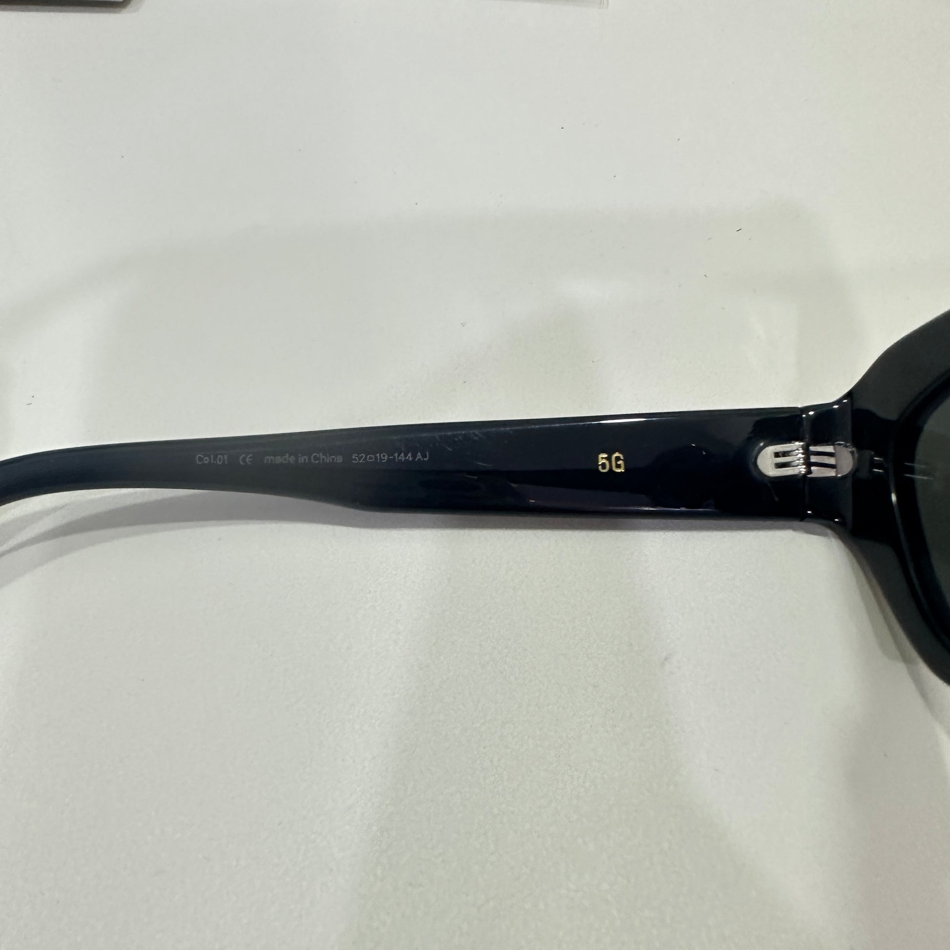 Crafted in collaboration with Coperni, 5G 01 is a black, cat-eye silhouetted acetate frame with 99.9% UV protected black lenses. The bold design, highlighted by the voluminous curves, is embellished with the Coperni logo on the nose bridge and refined line details on the temples
