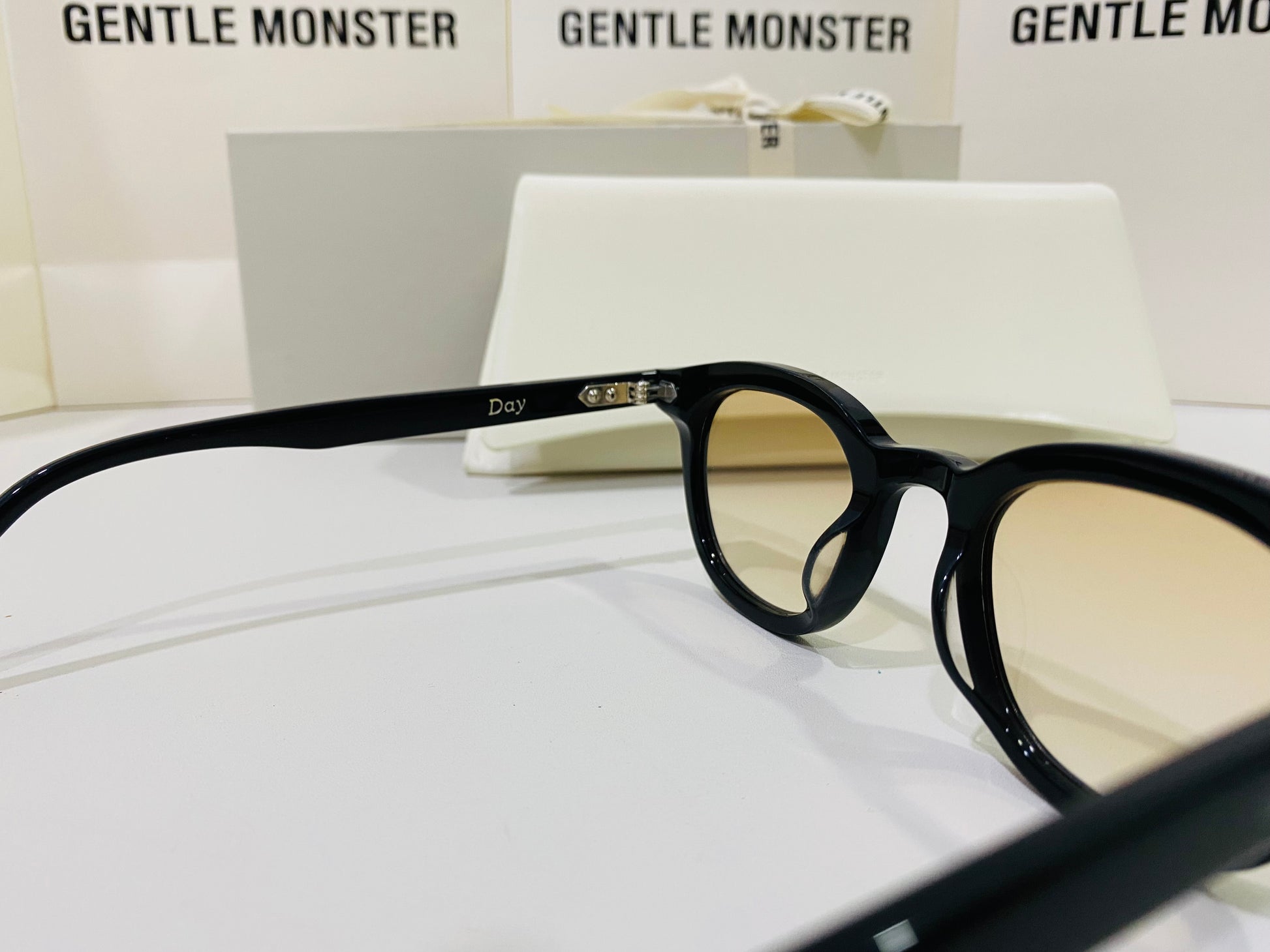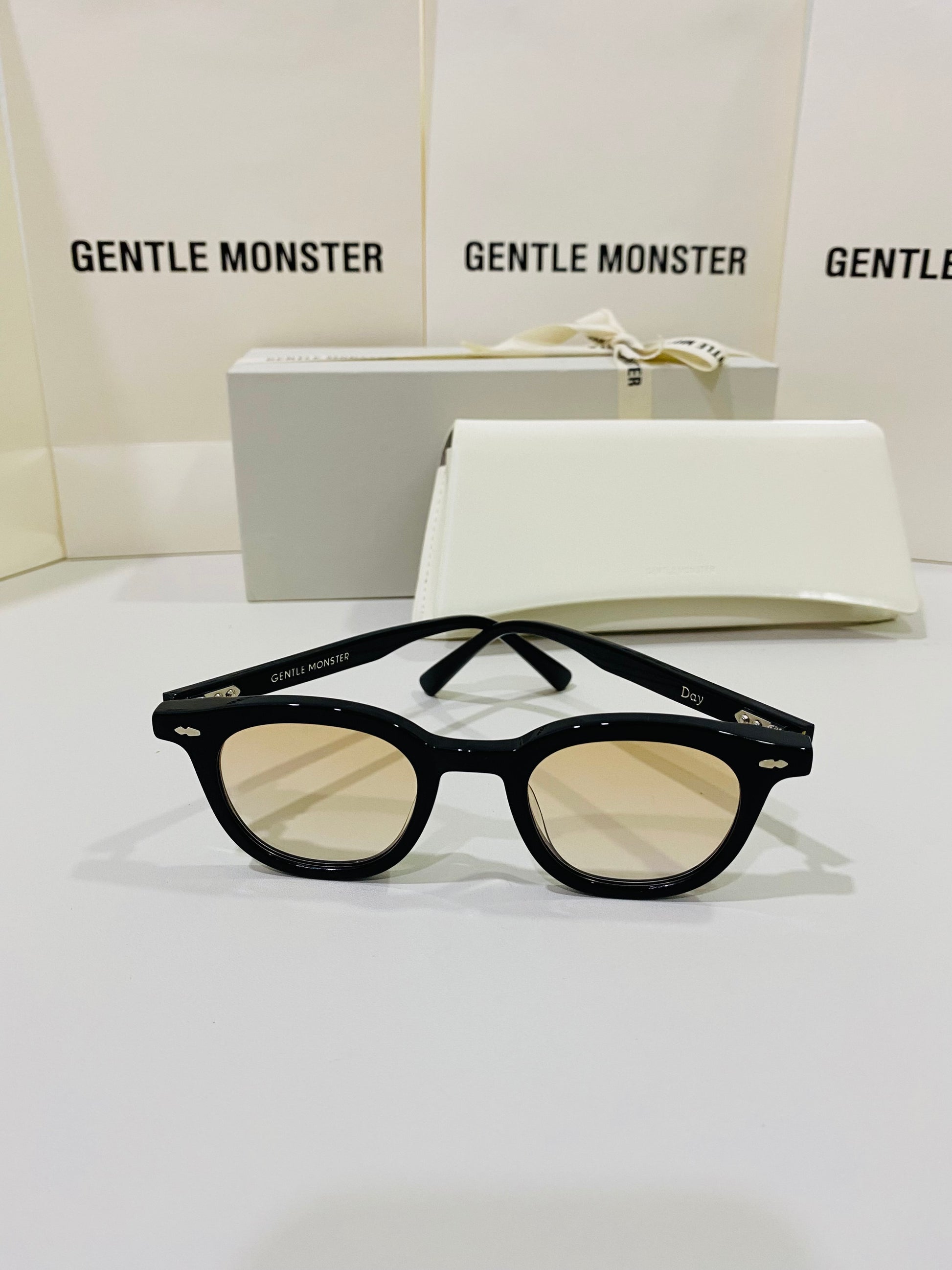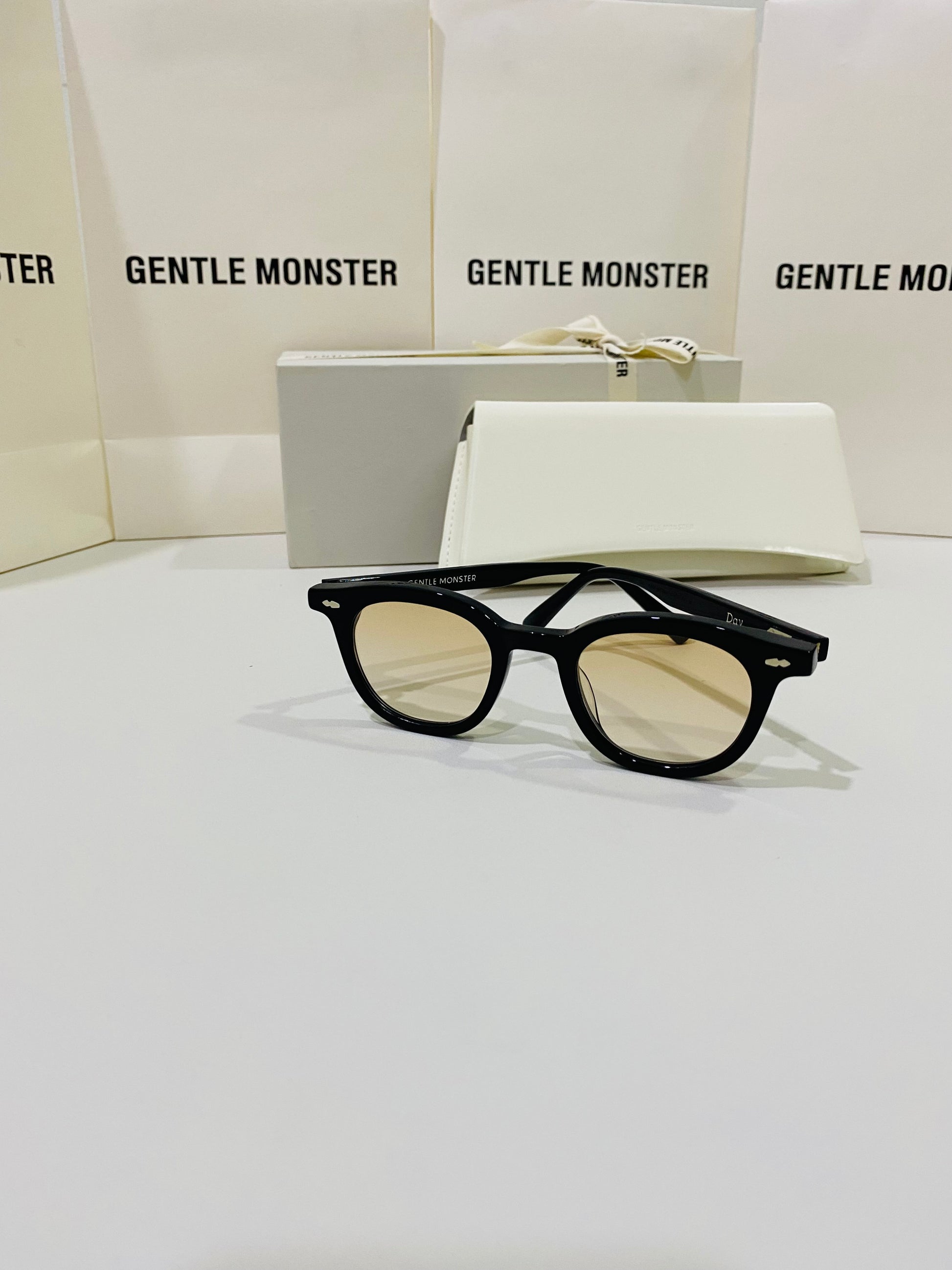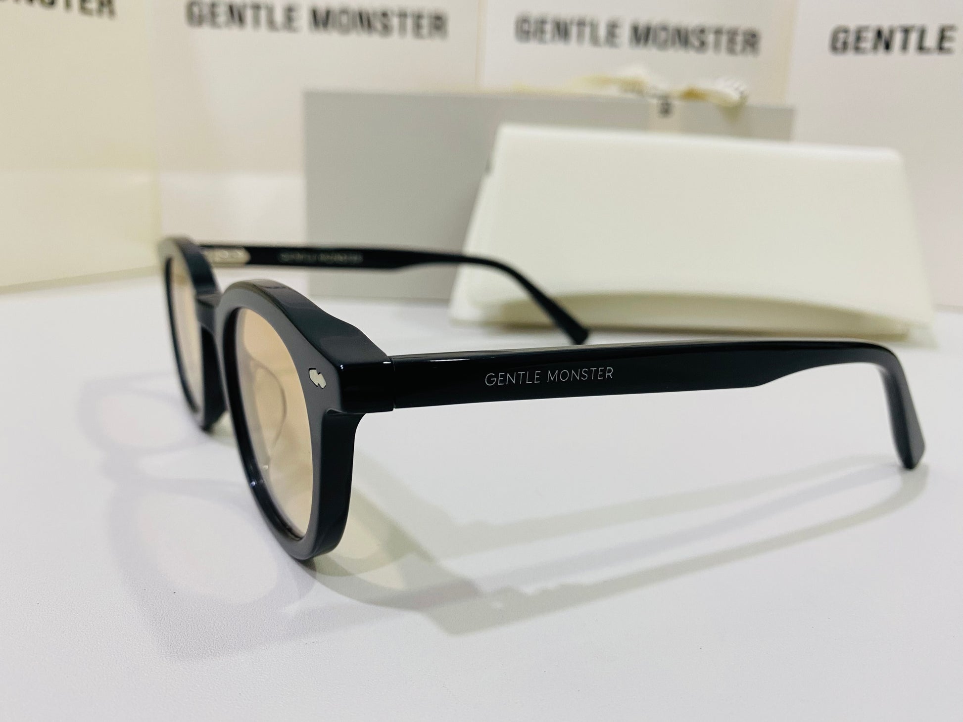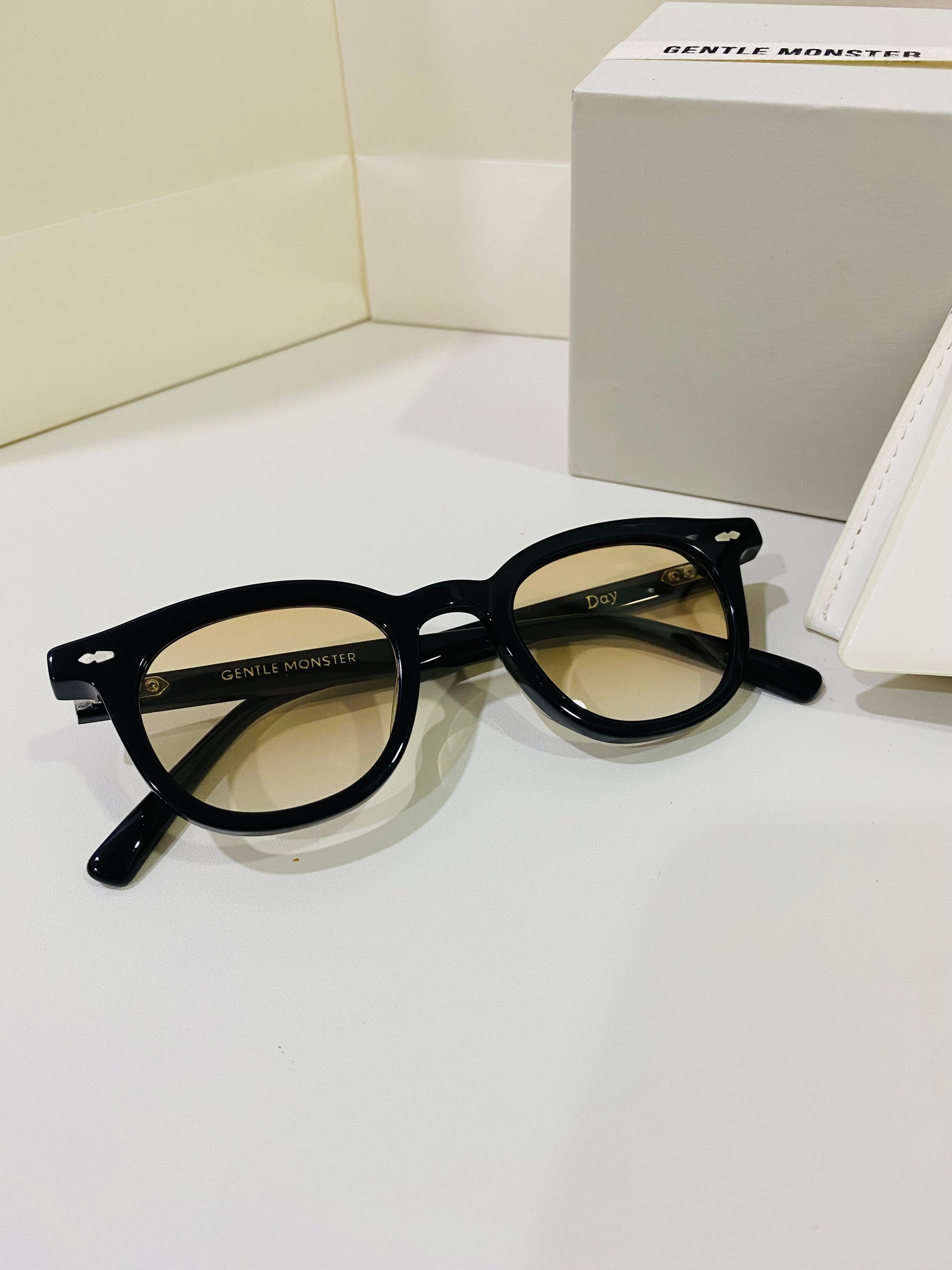 DAY 01(OG) presents a square acetate frame in yellow lens. This classic all-black design is accented with arrow shaped studs at each corner, complemented with temples engraved with Gentle Monster.