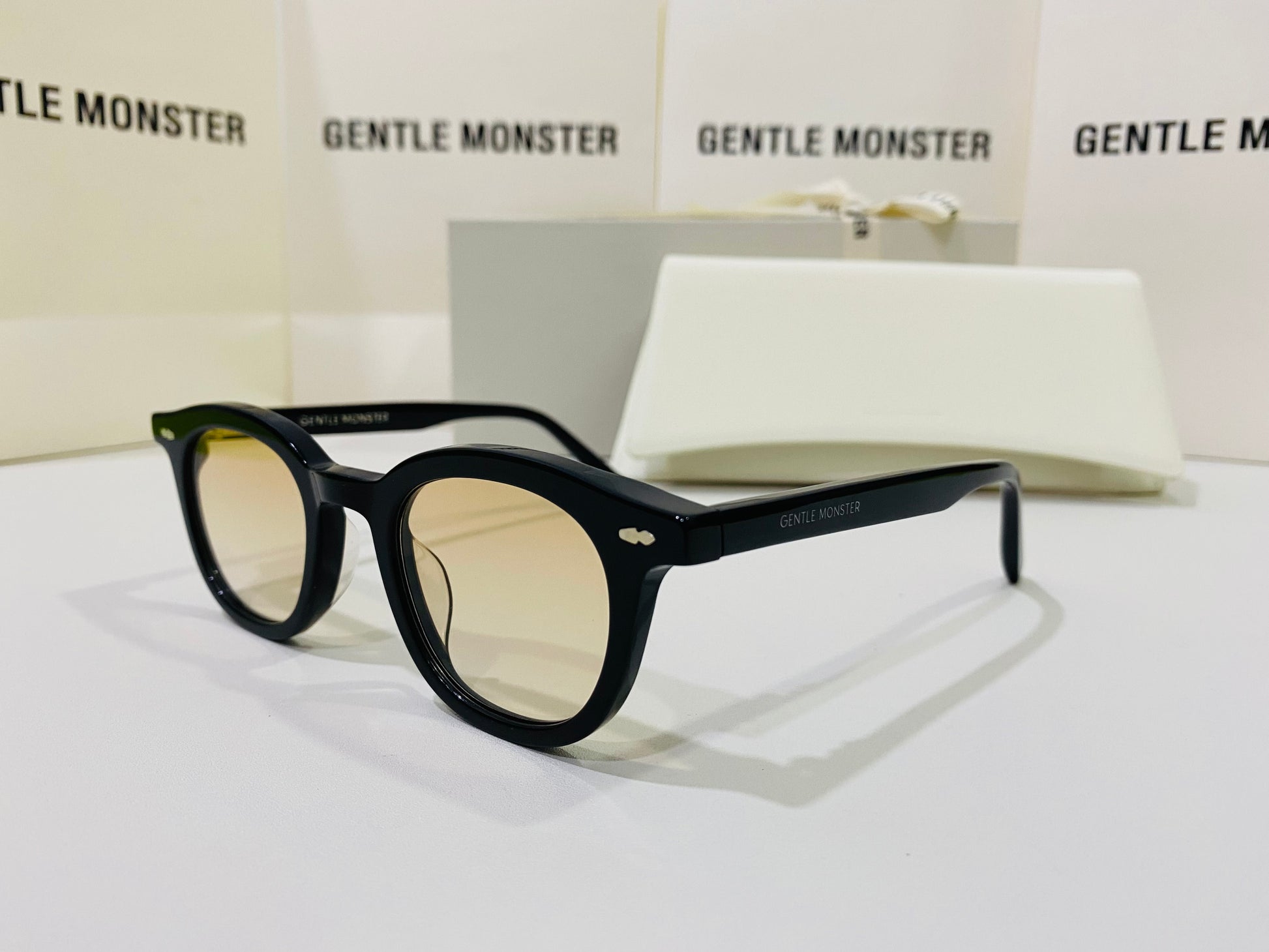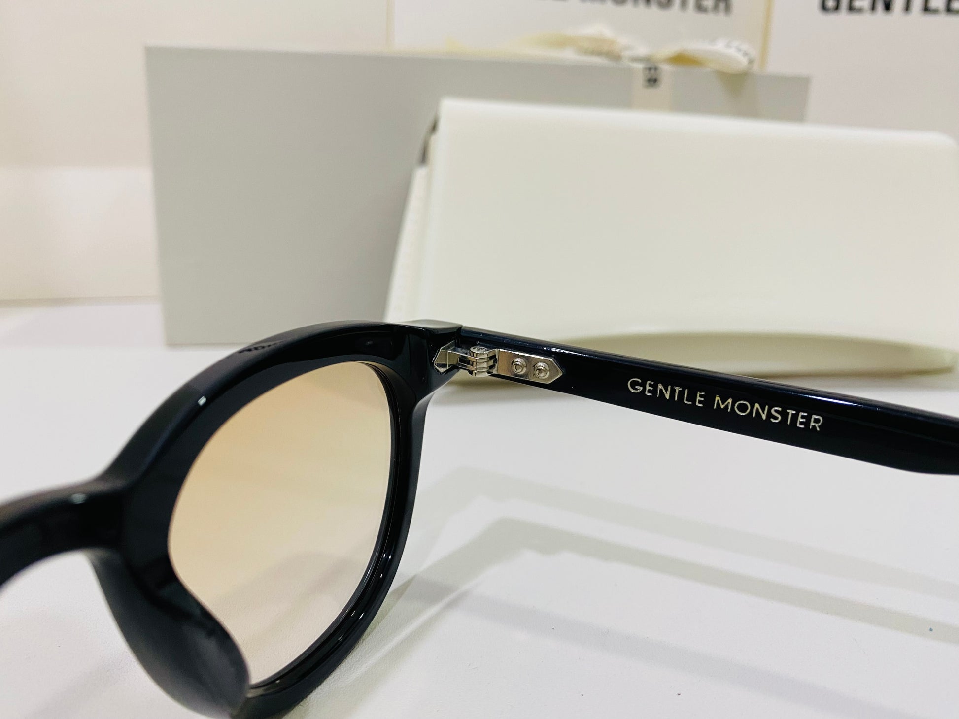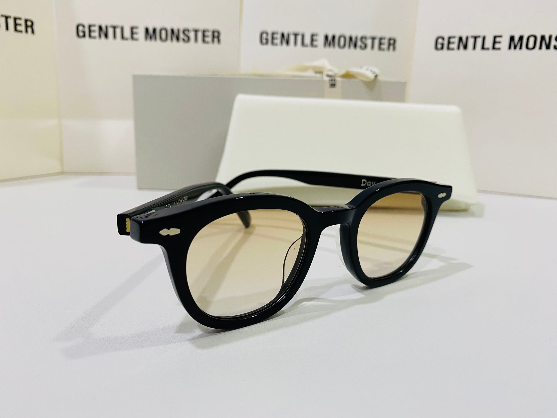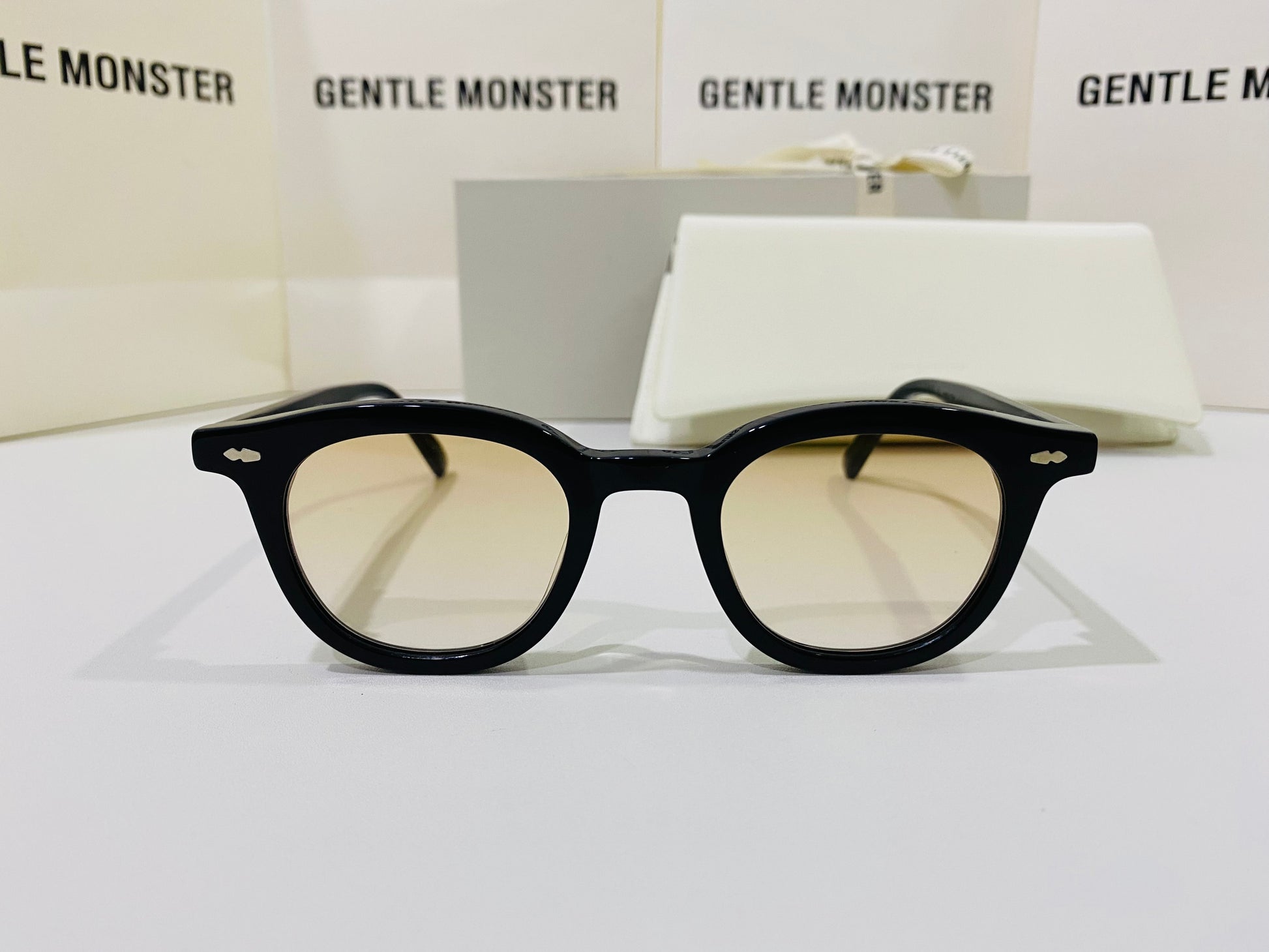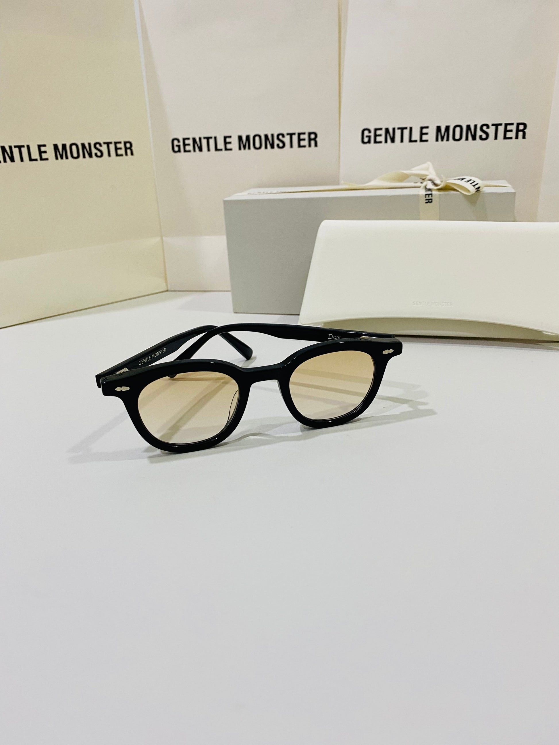 DAY 01(OG) presents a square acetate frame in yellow lens. This classic all-black design is accented with arrow shaped studs at each corner, complemented with temples engraved with Gentle Monster.