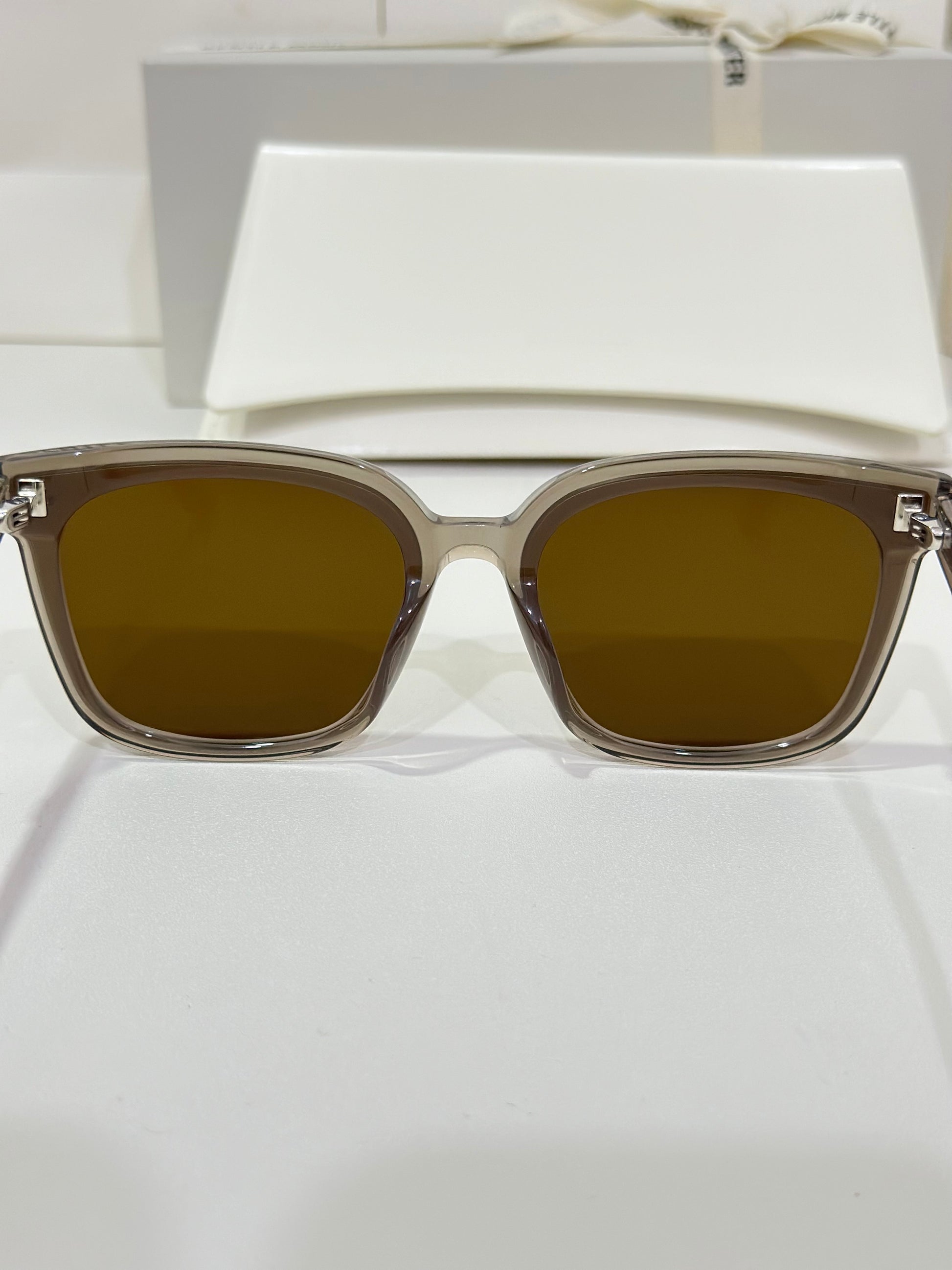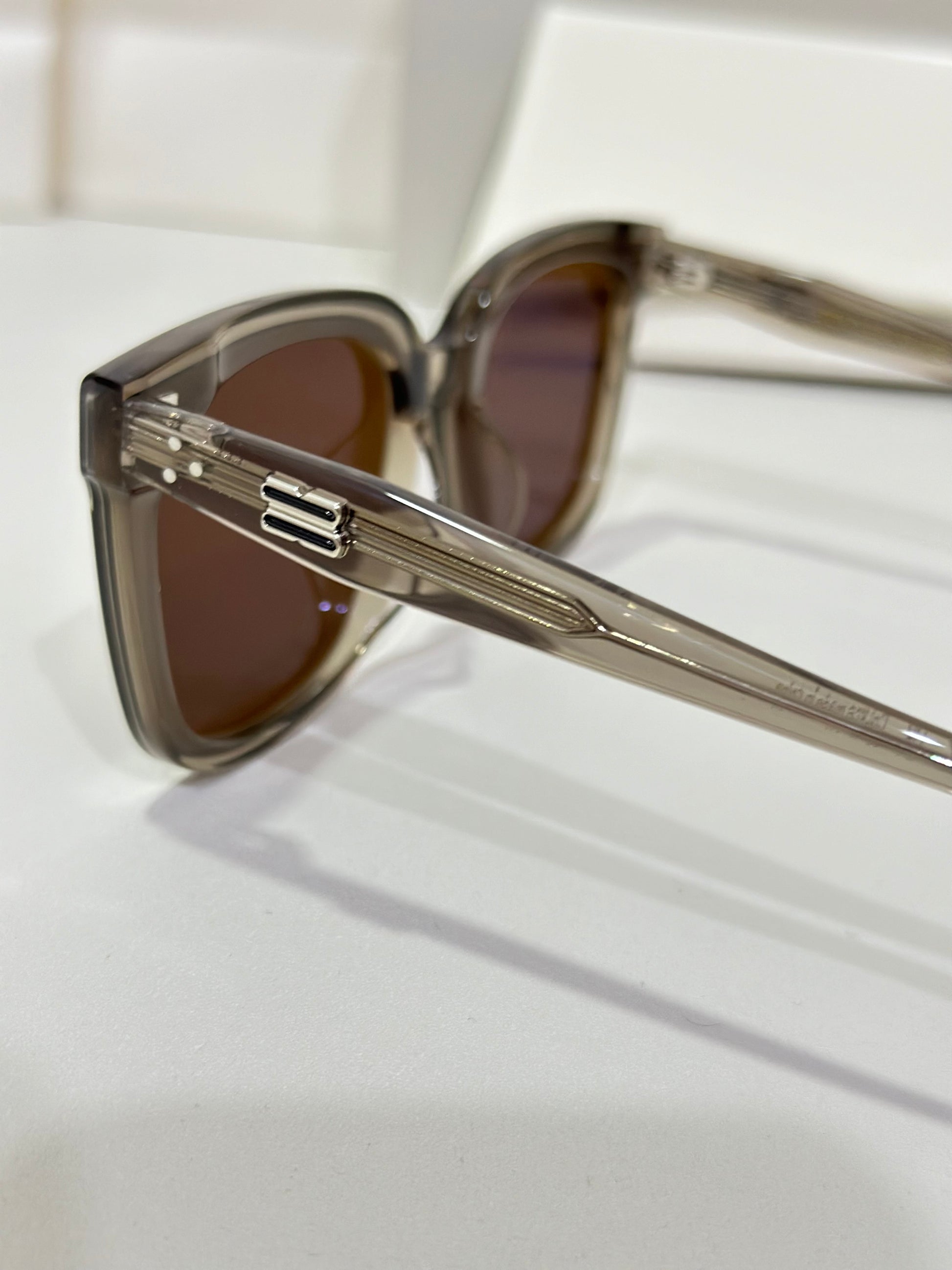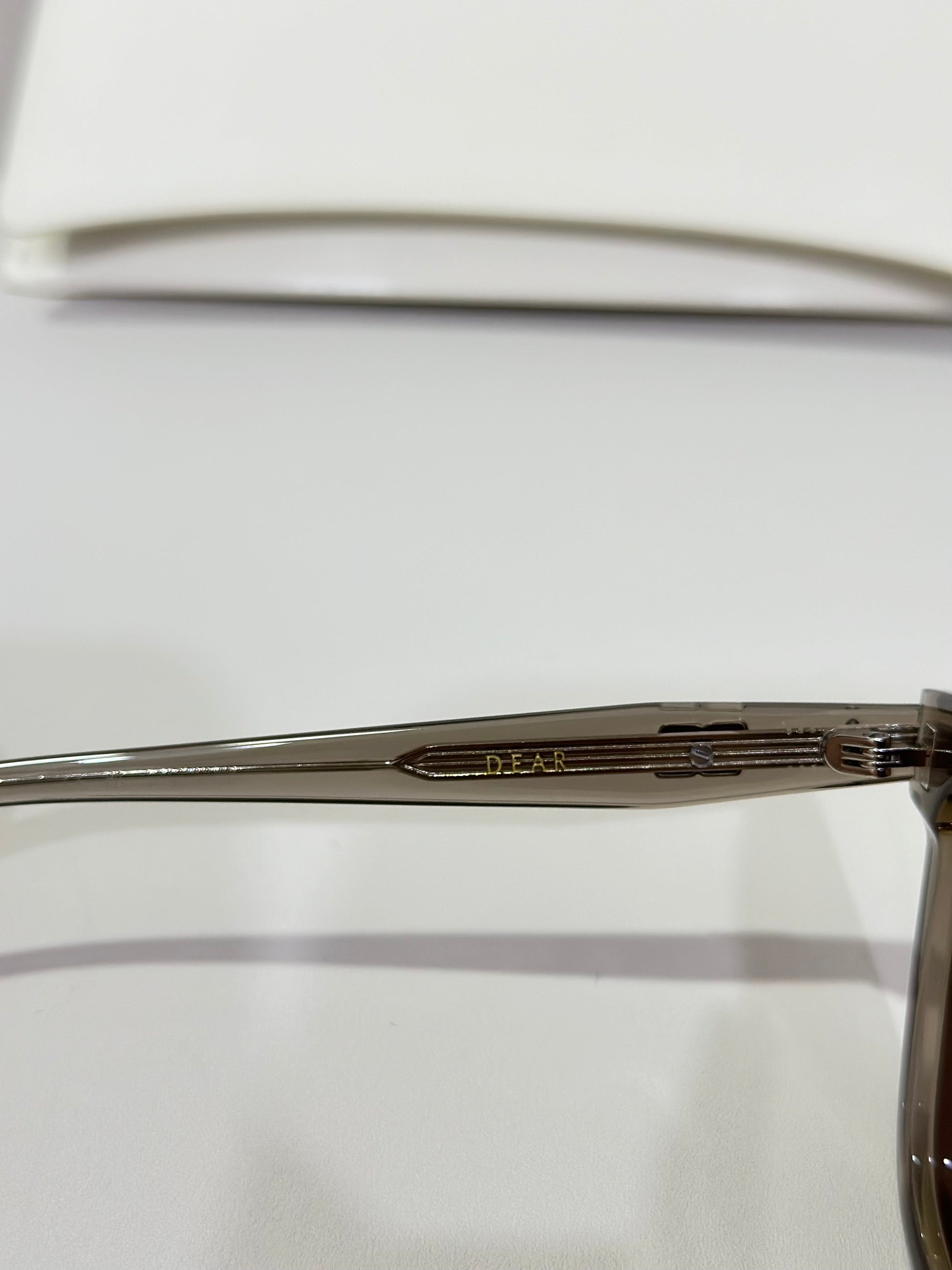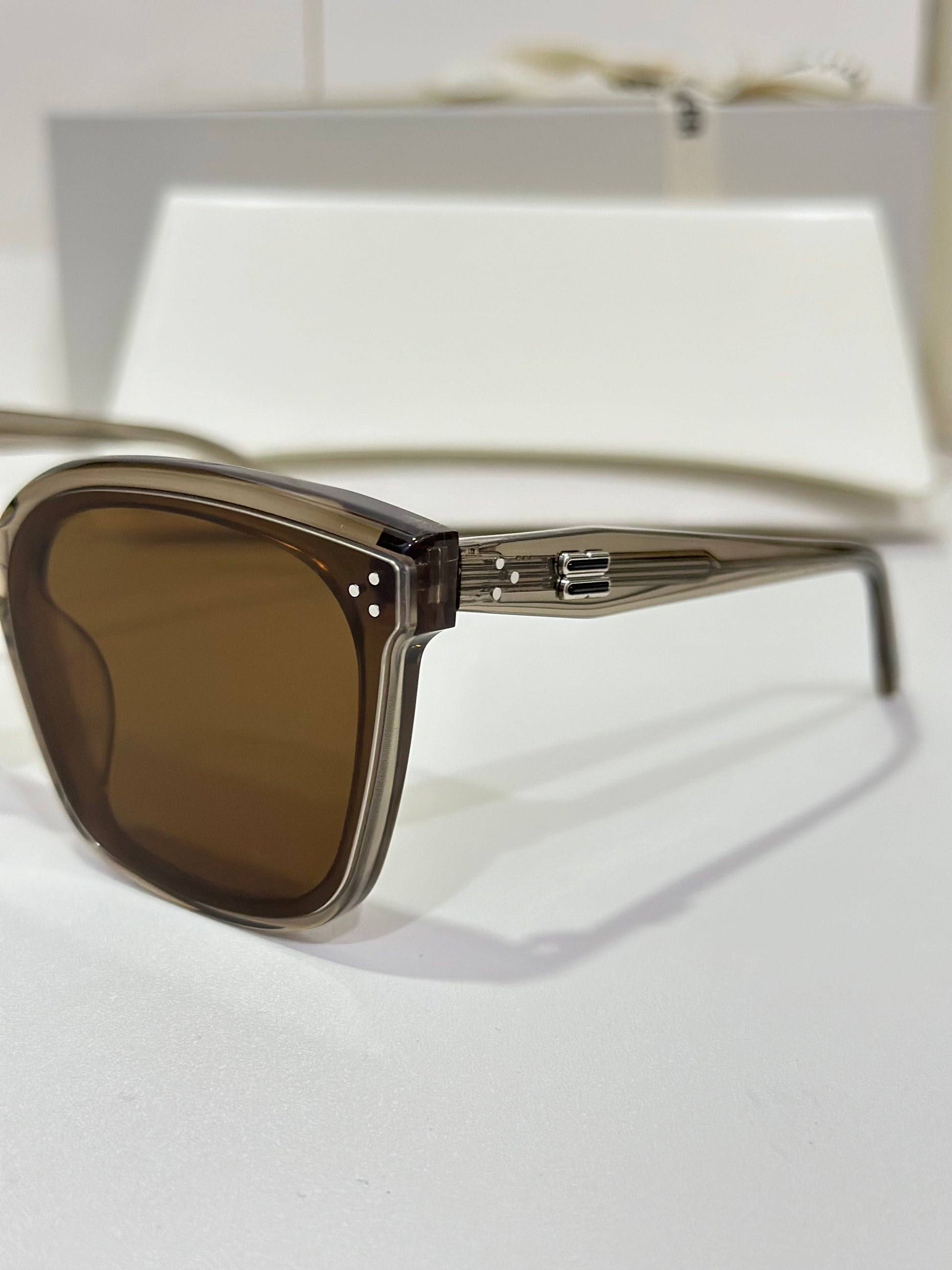 Translucent khaki acetate frameBrown lensesSquare shapeIconic metal detail on the templesFrame Front: 148.7mm, Frame Side: 147.1mm