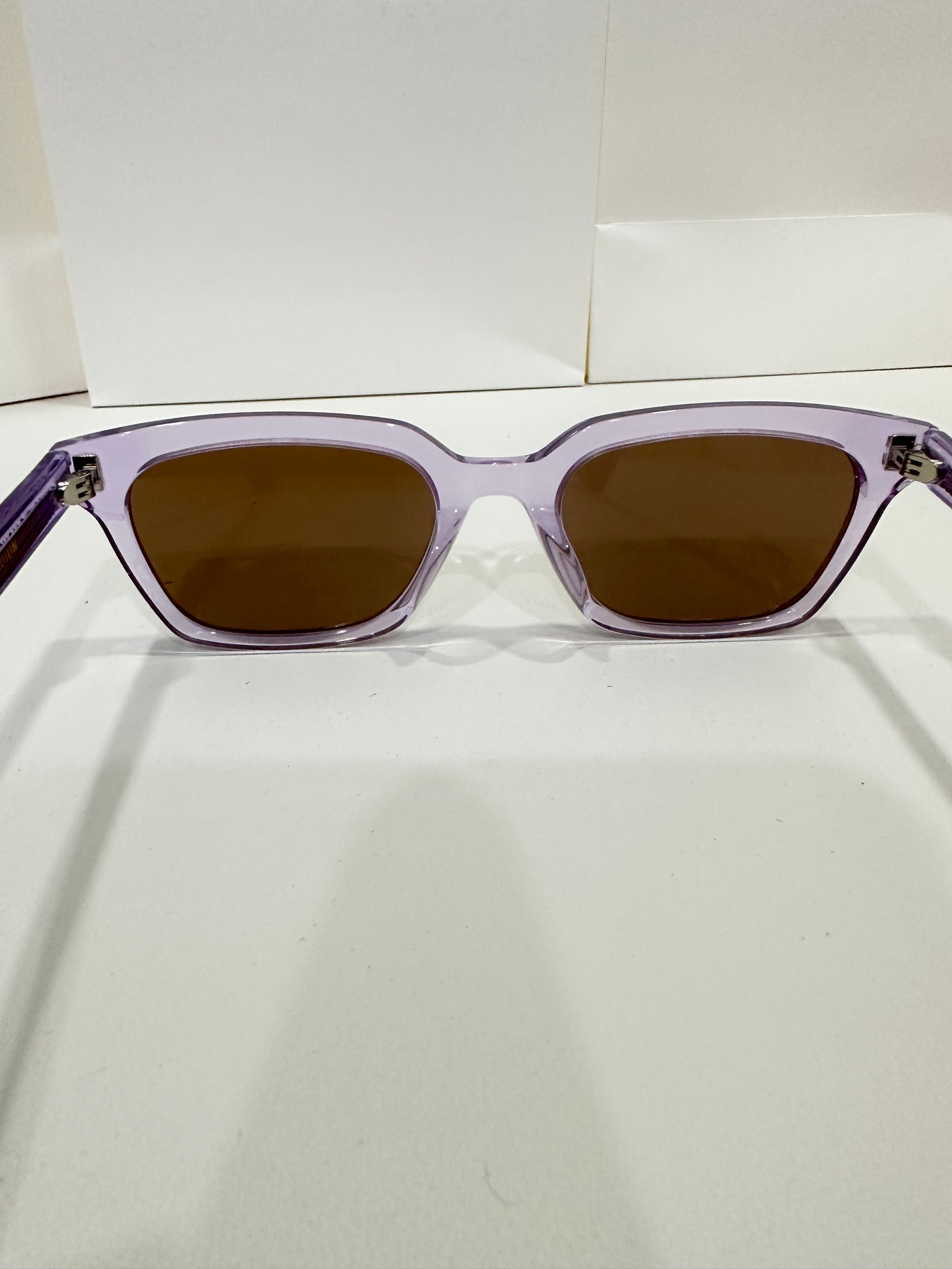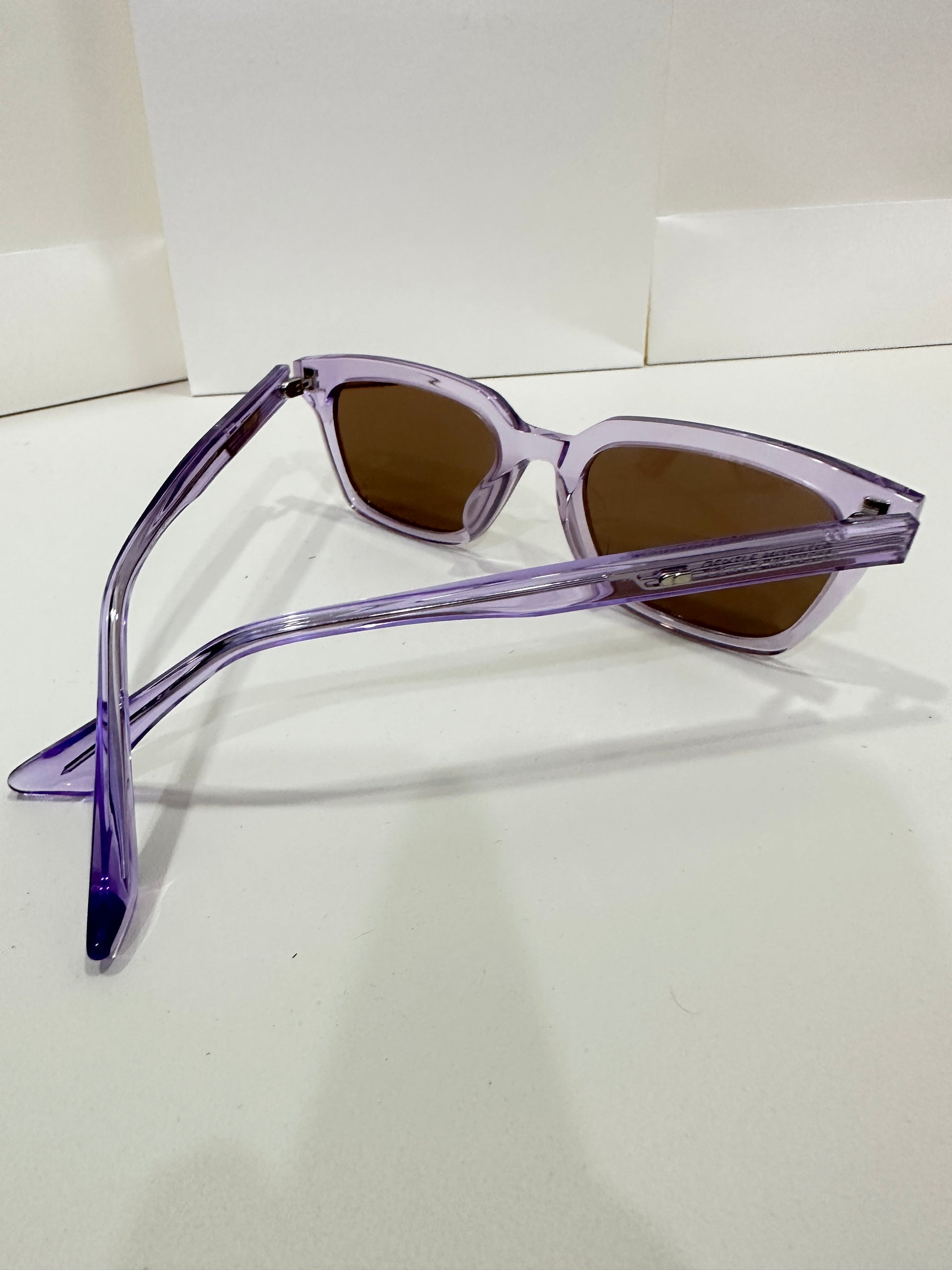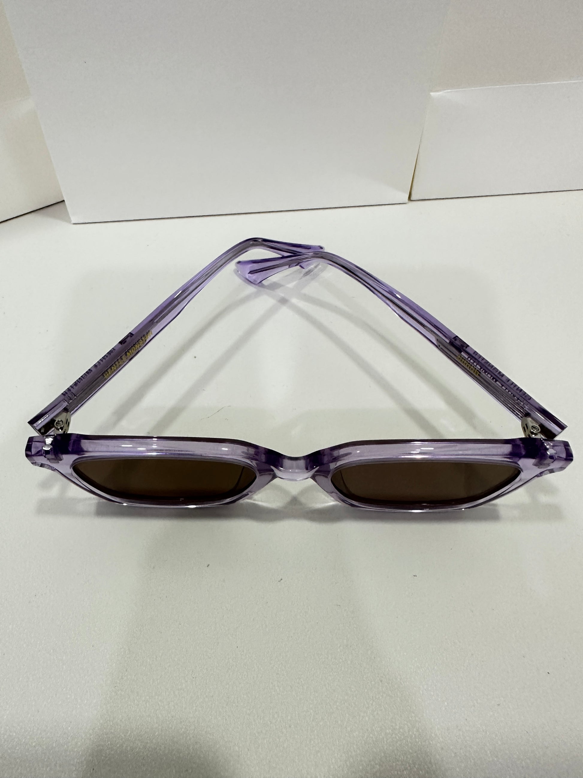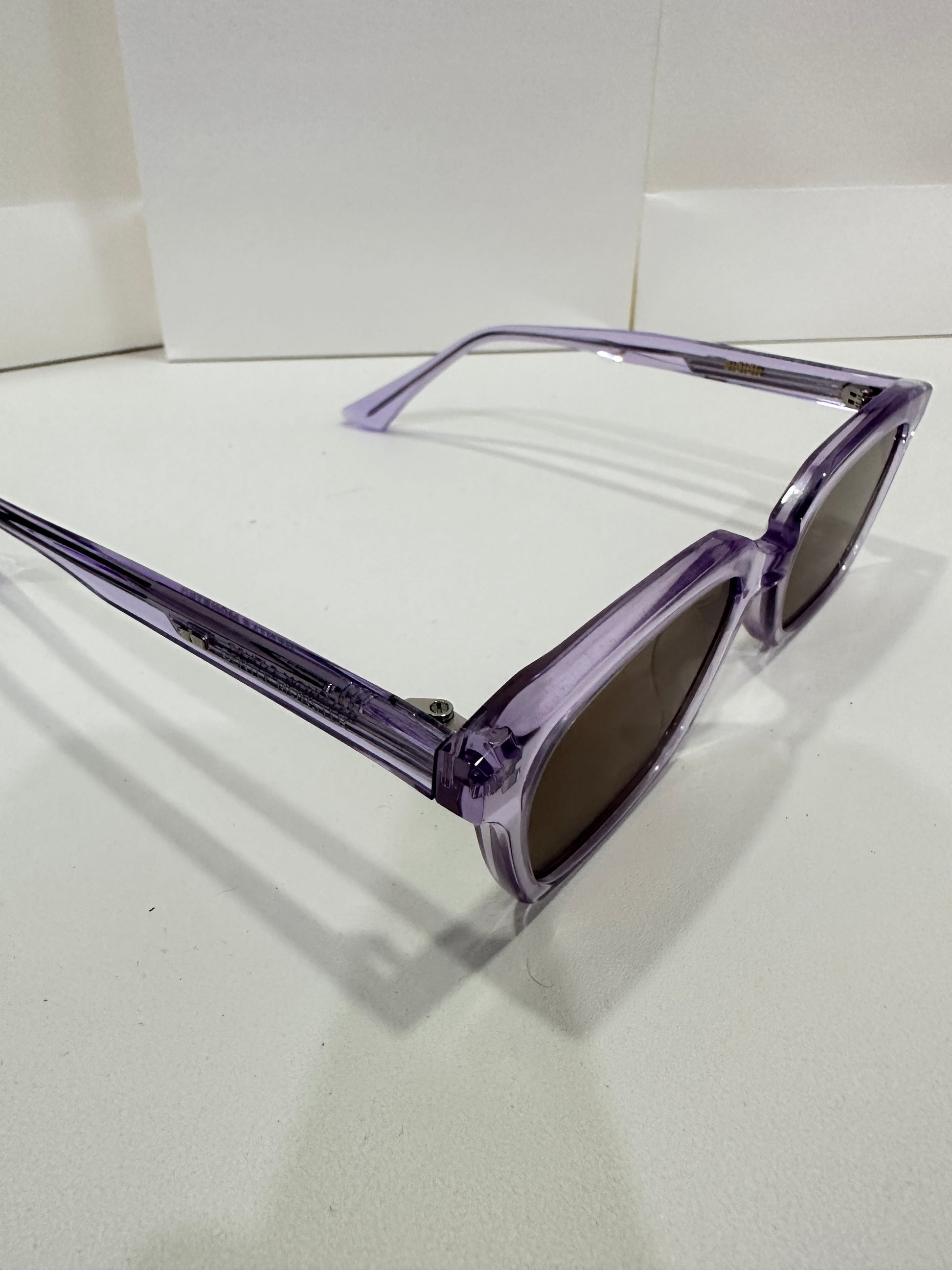 Didion VC1 is a slim rectangular frame crafted of clear violet acetate, fitted with 99.9% UV protected brown lenses. The soft and refined front is balanced by the temples.