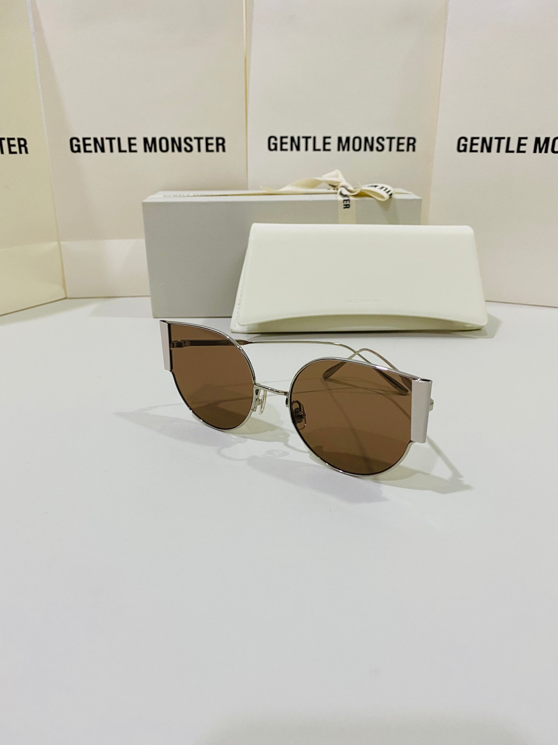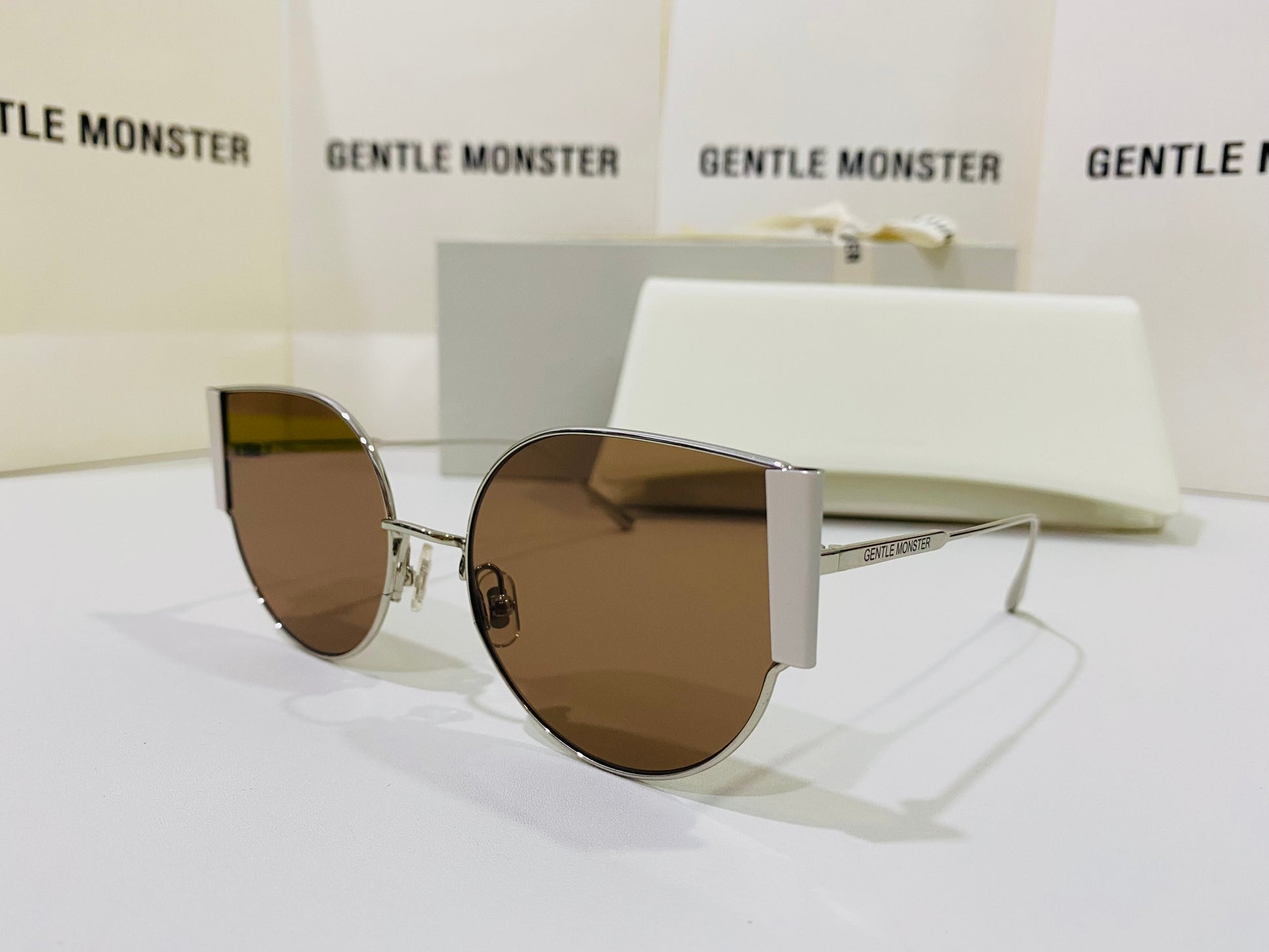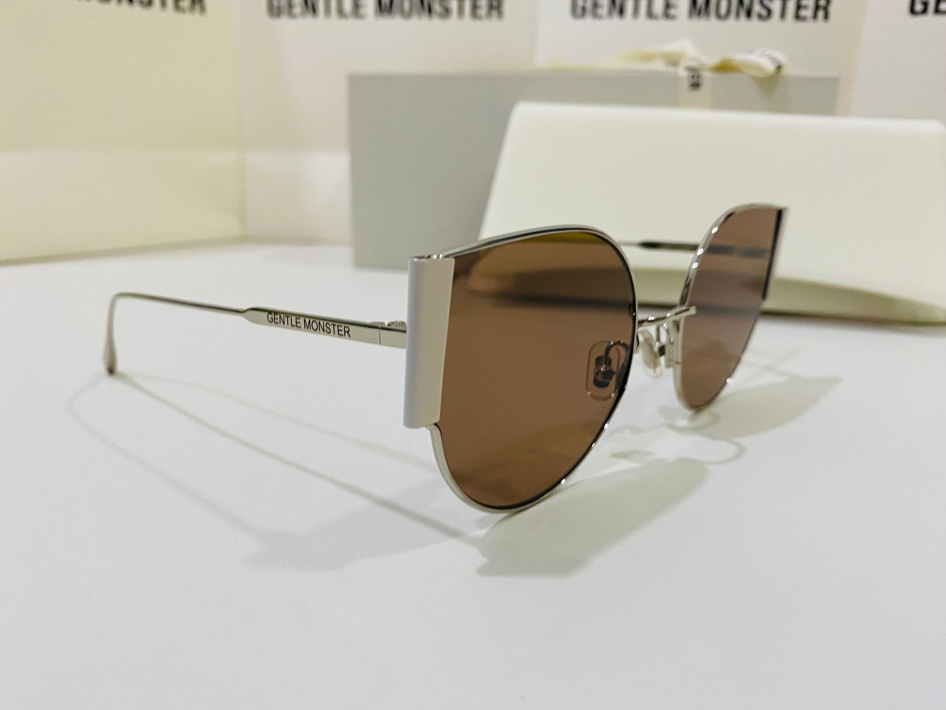 Fran 02 is a thin, silver cat-eye frame with bold metal accents on the sides. These sunglasses are fitted with 99.9% UV protection brown lenses.