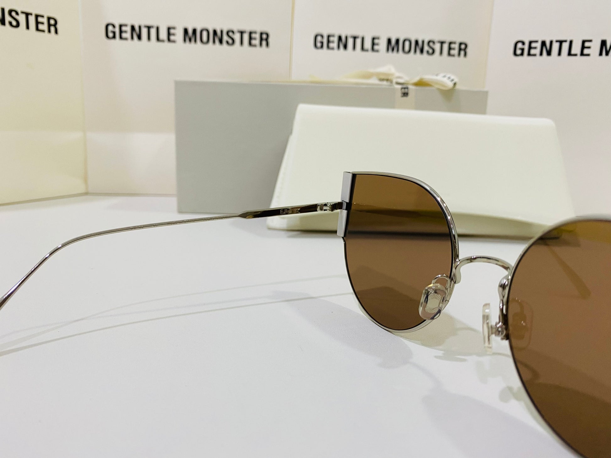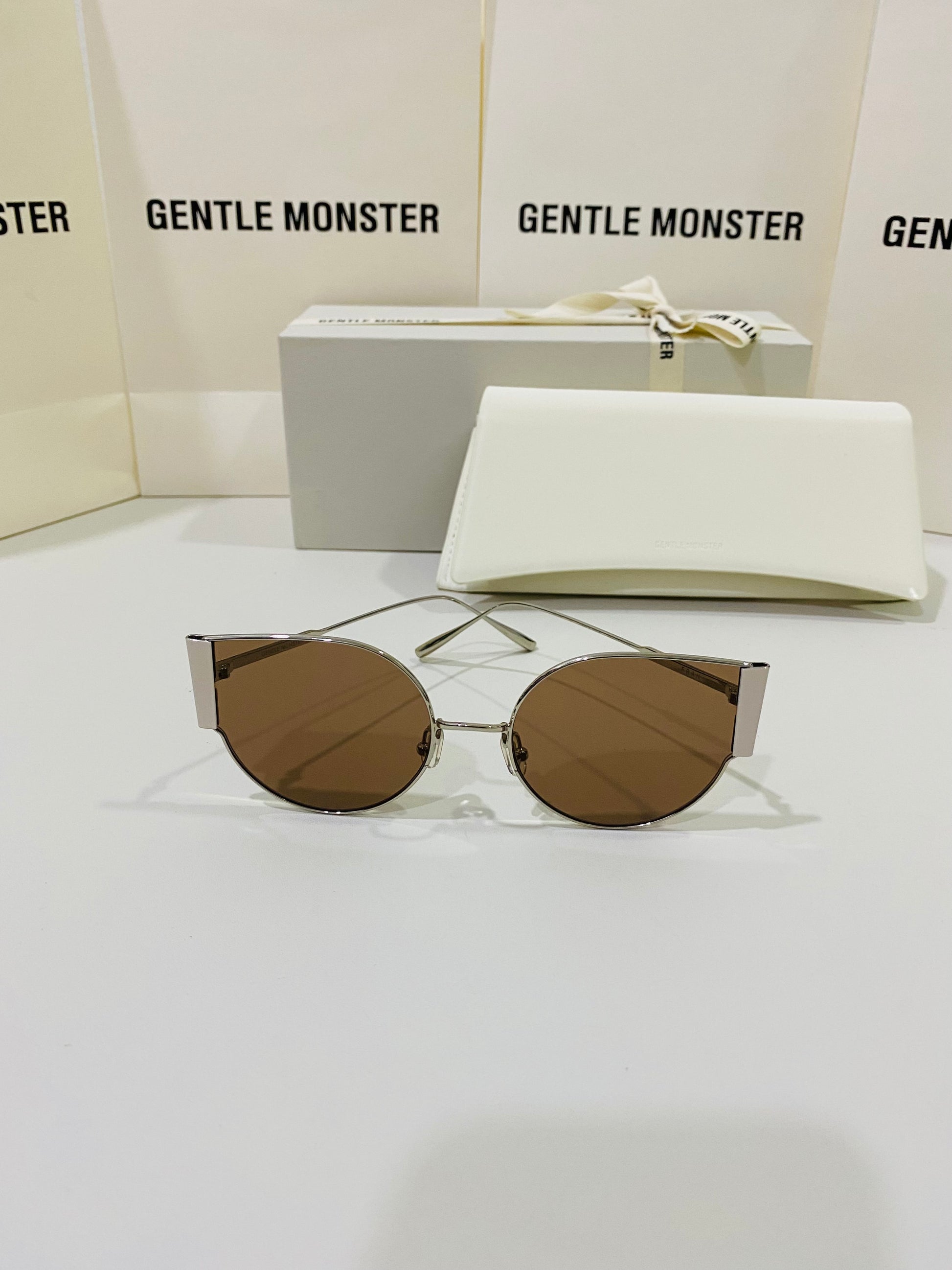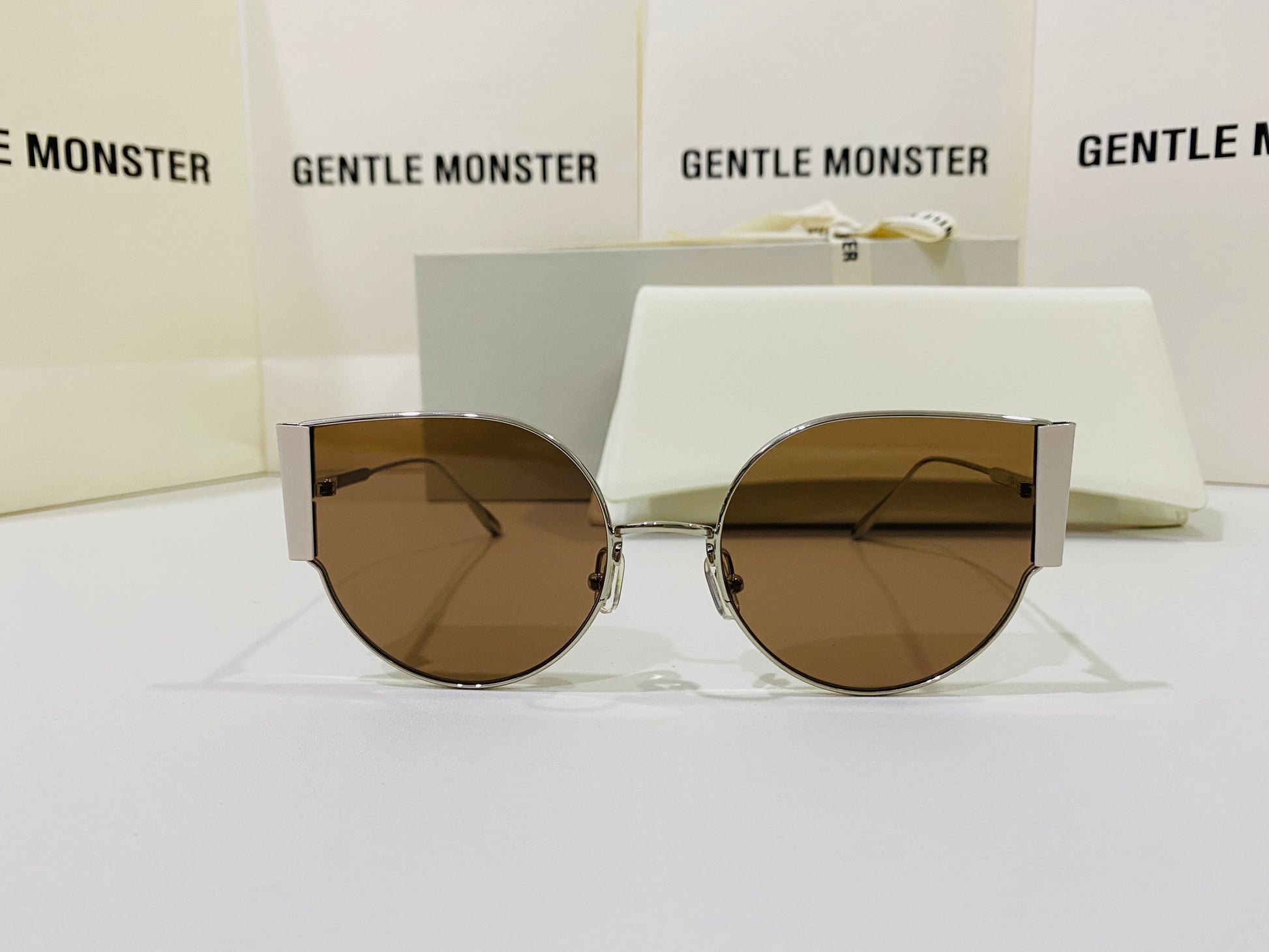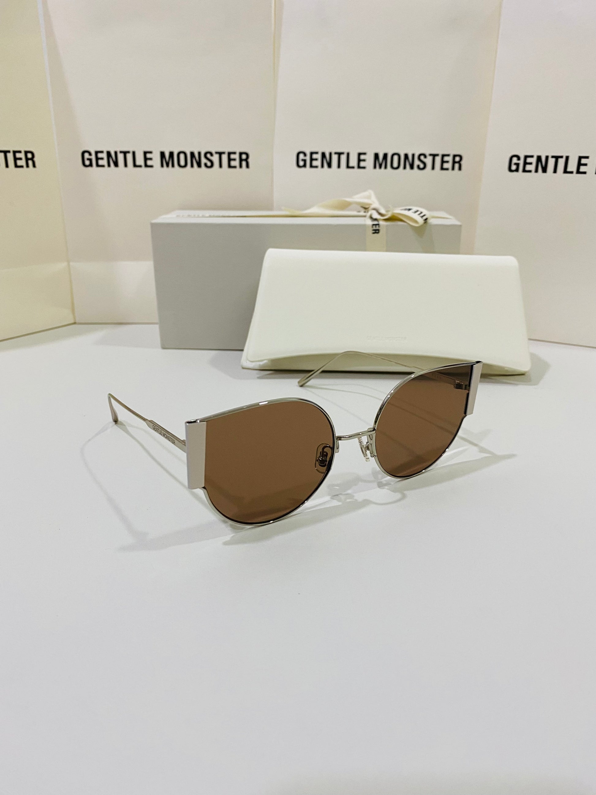 Fran 02 is a thin, silver cat-eye frame with bold metal accents on the sides. These sunglasses are fitted with 99.9% UV protection brown lenses.
