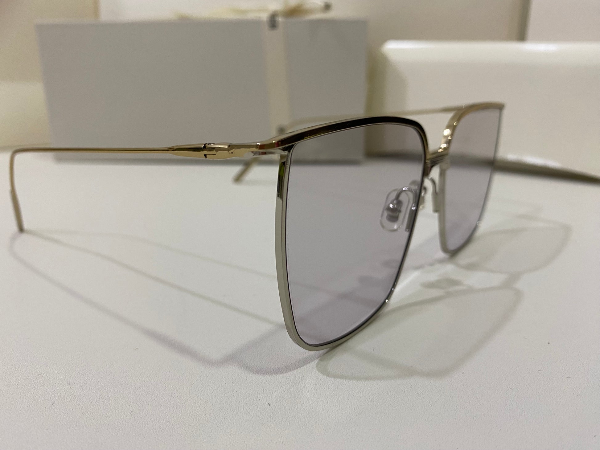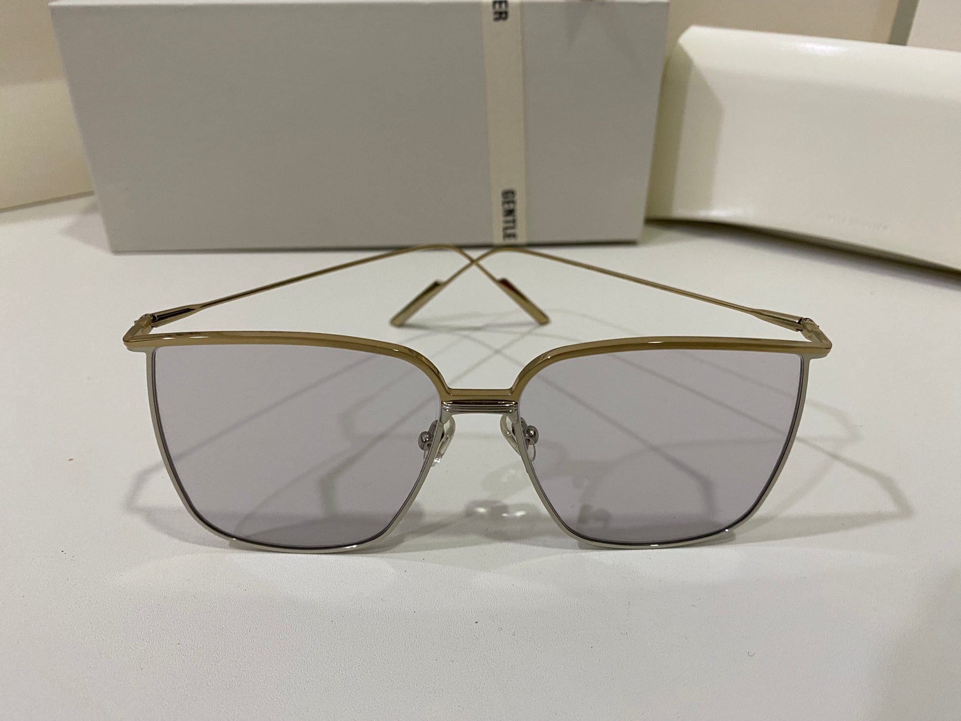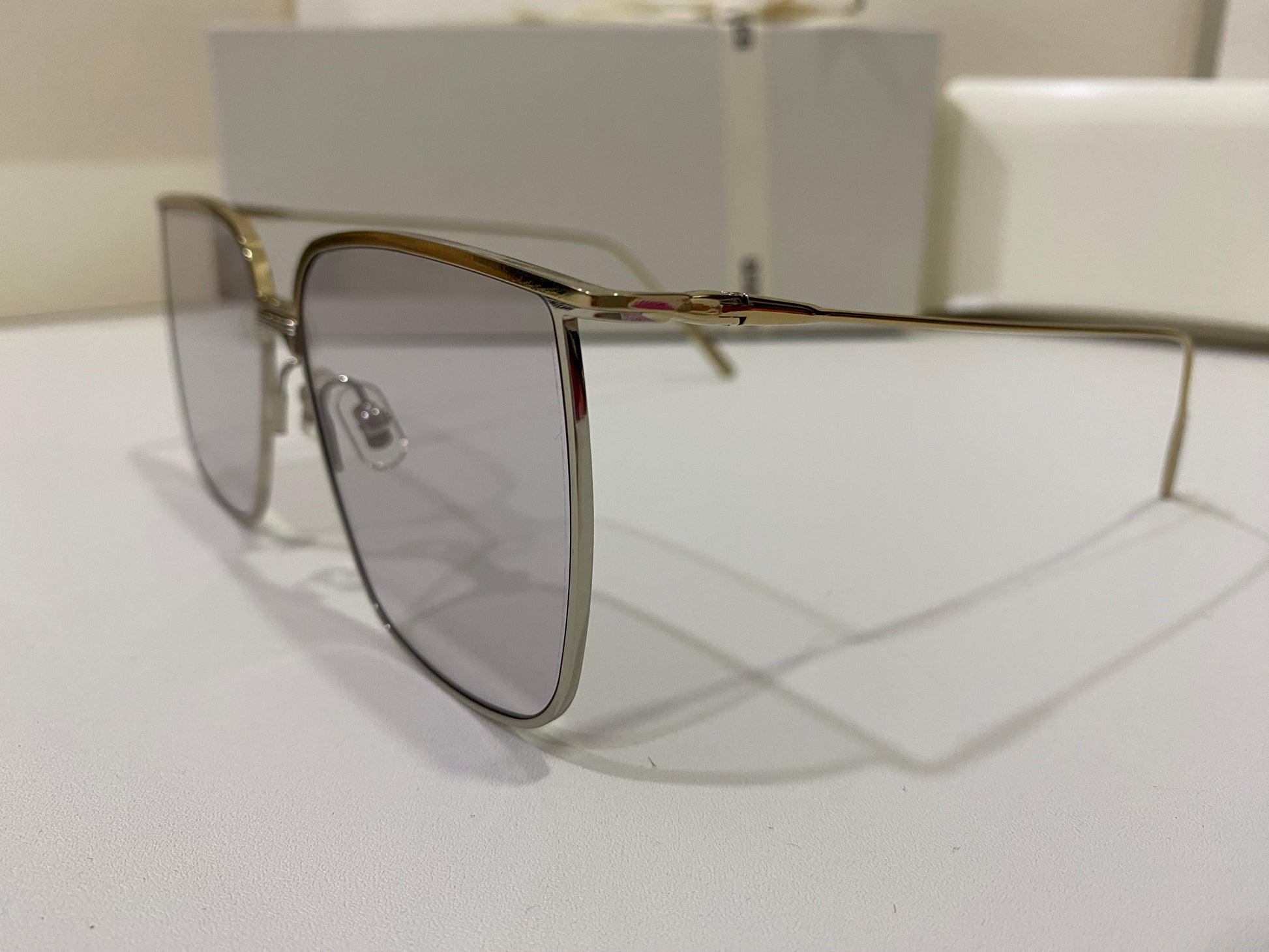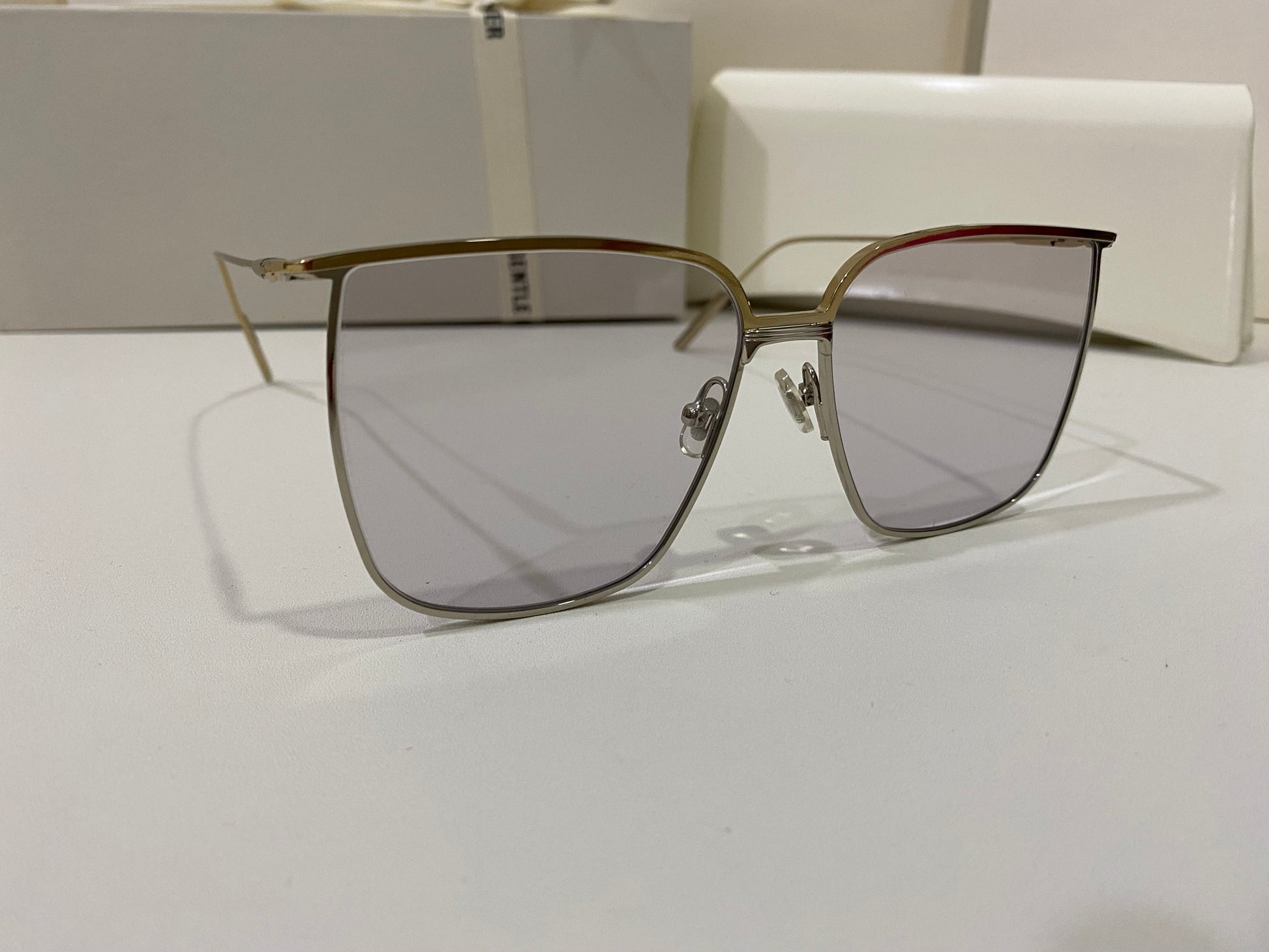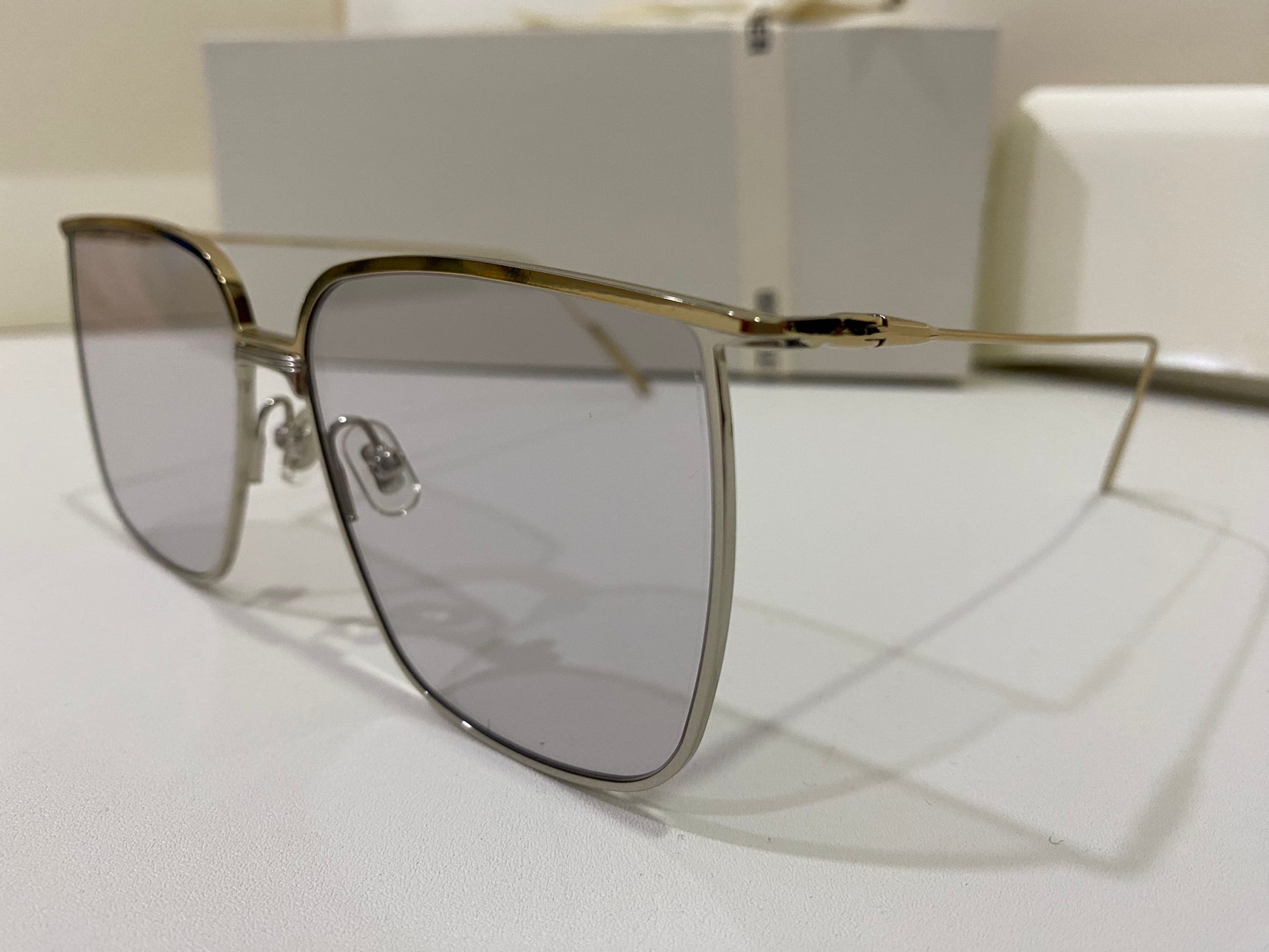 High To Low 032 is an oversized square metal frame. These sunglasses feature a temple tip design newly presented in the 2021 Collection, dual-colored frame front of gold and silver and fitted with 99.9% UV protection blue lenses.