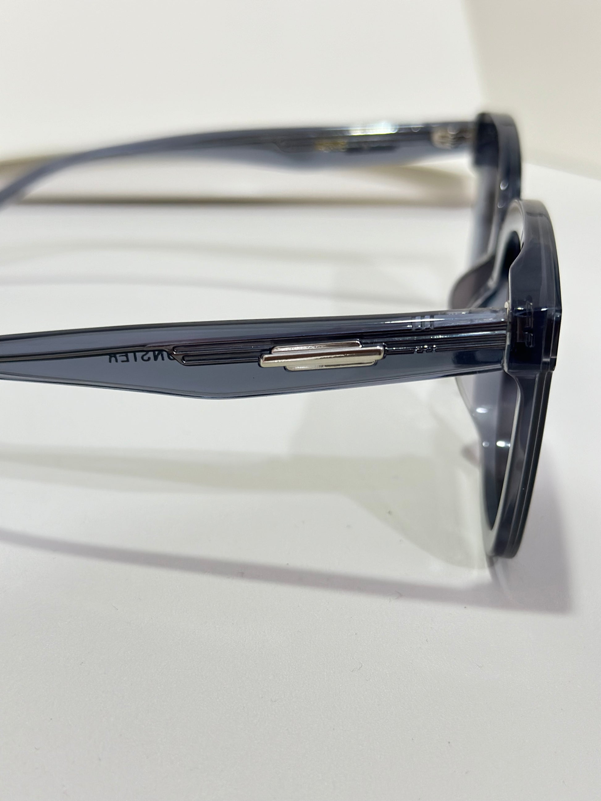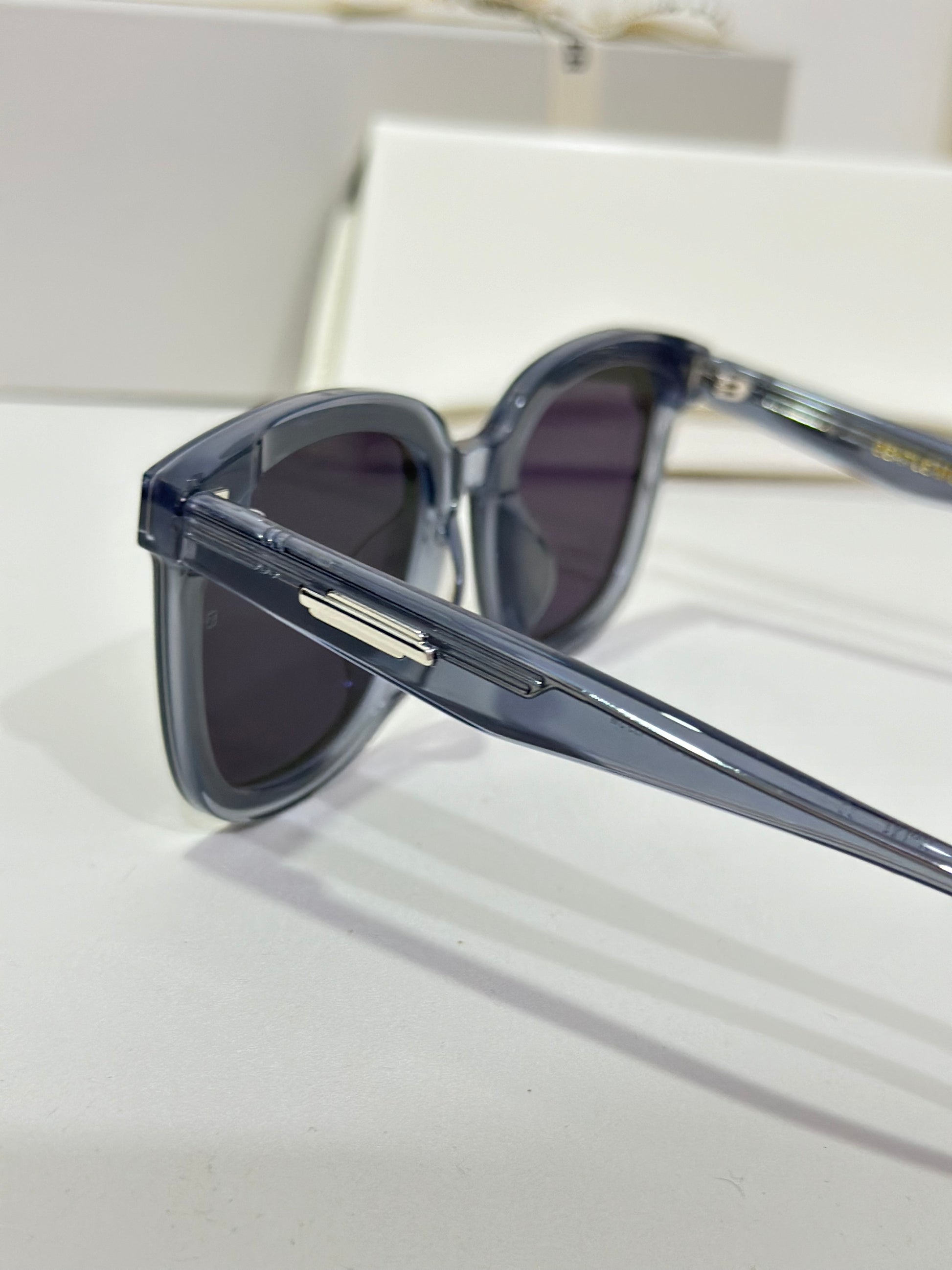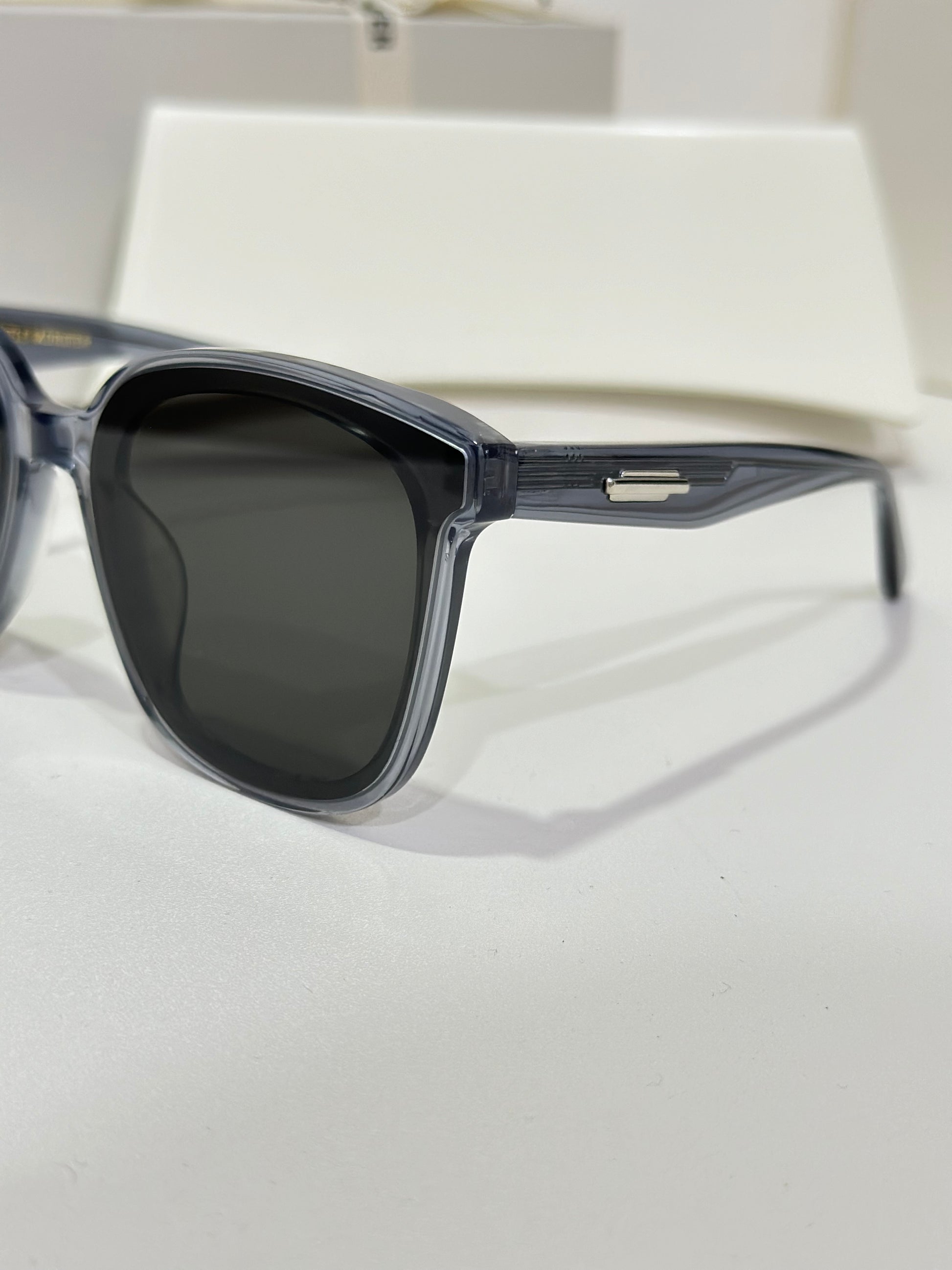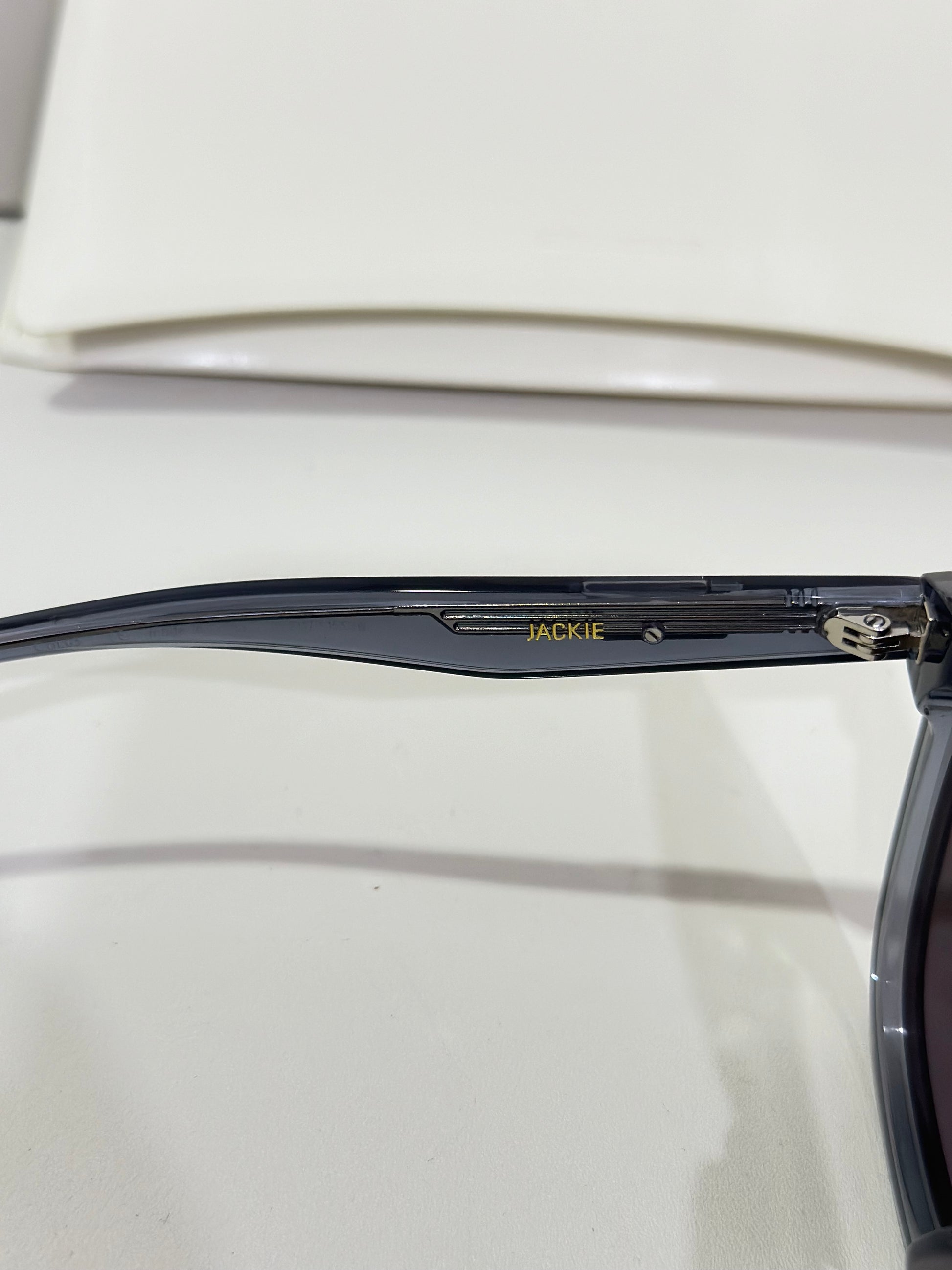 Jackie G3 is a clear grey square acetate Flatba frame with 99.9% UV protected black lenses. This versatile design with soft curves and temples decorated with unique metal details is designed to fit any occasion.