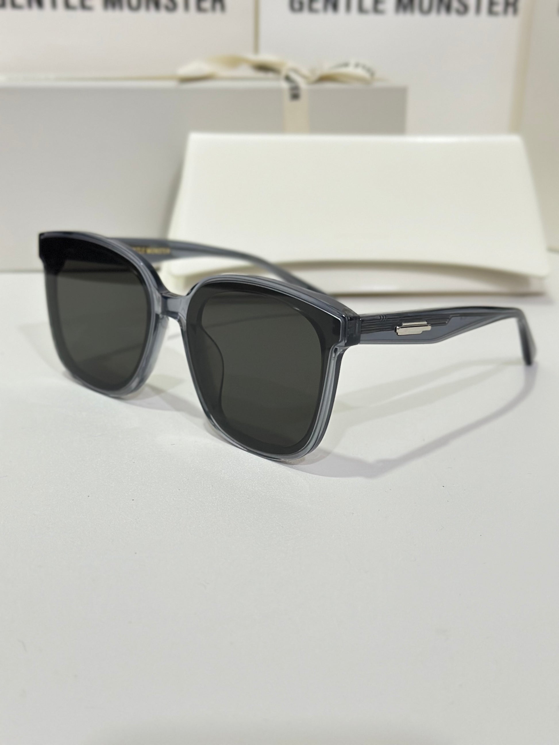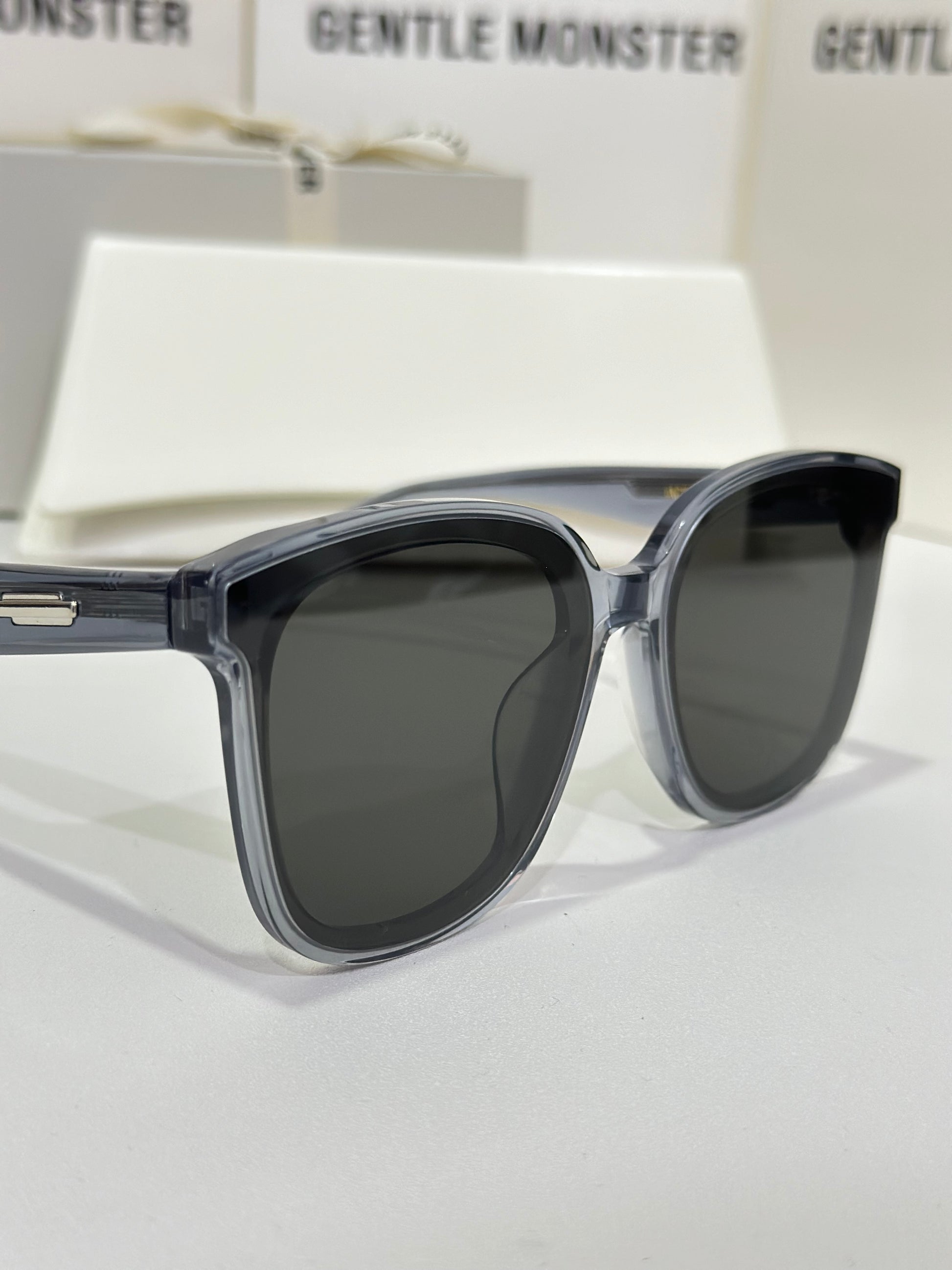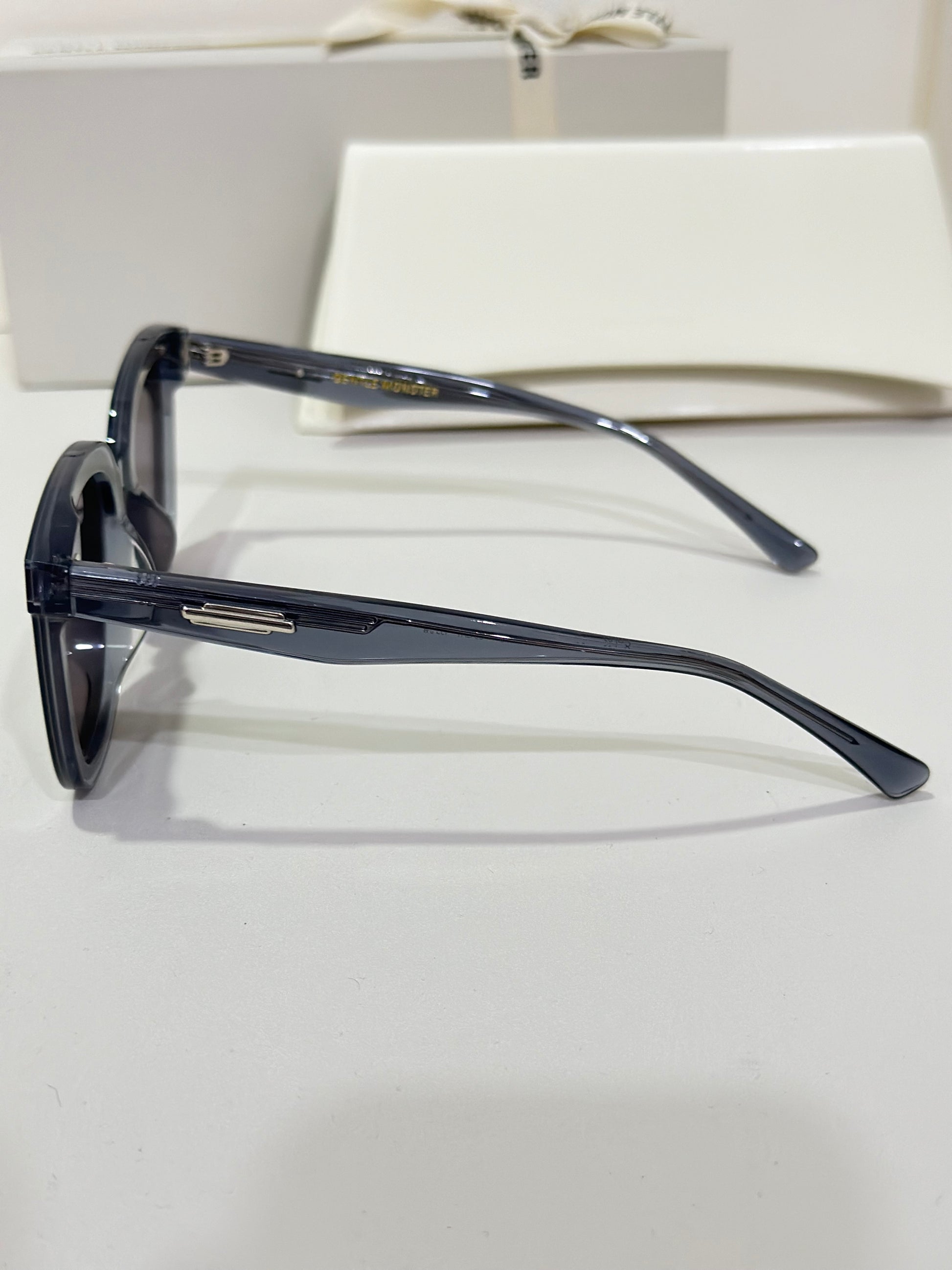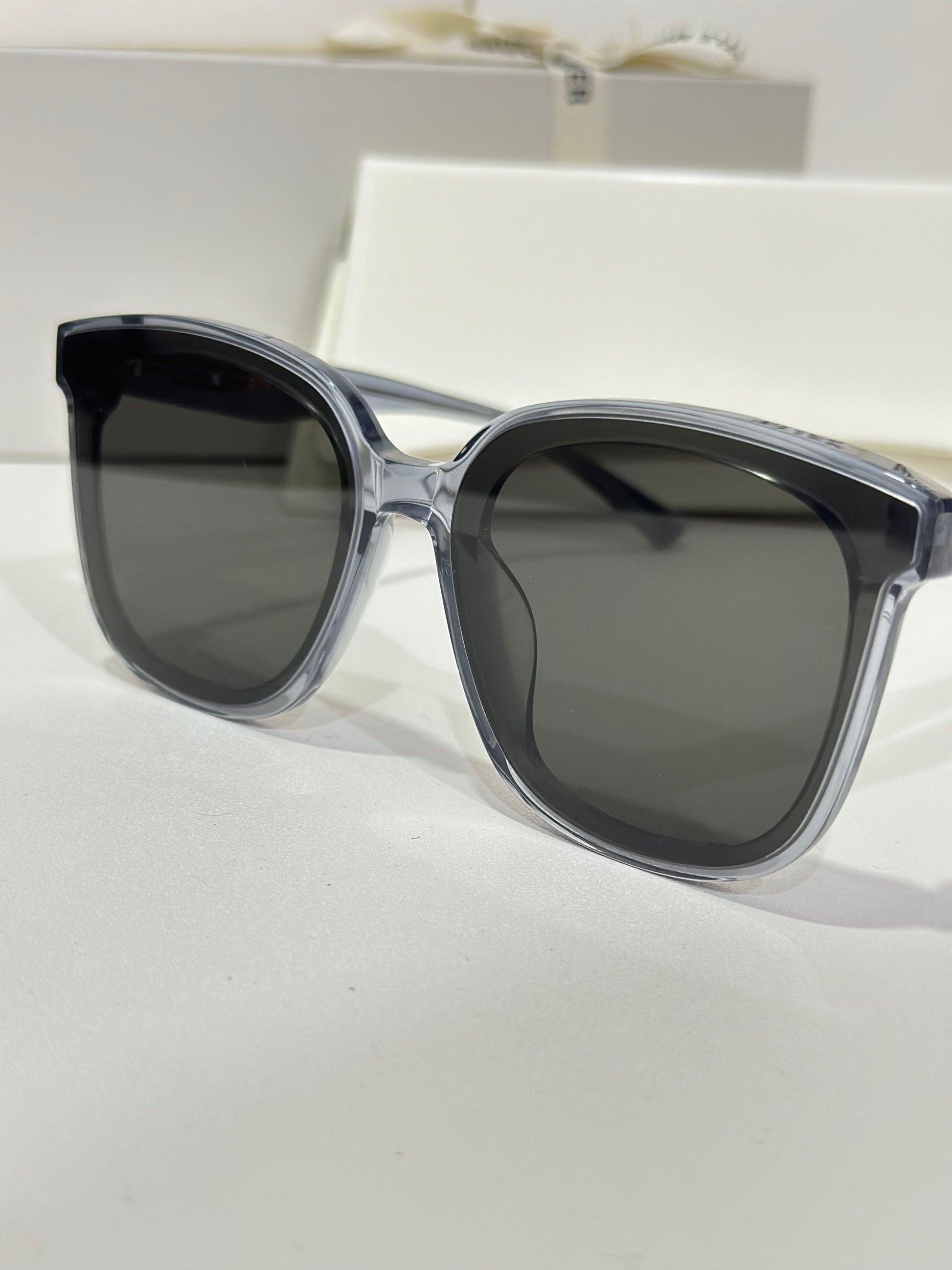 Jackie G3 is a clear grey square acetate Flatba frame with 99.9% UV protected black lenses. This versatile design with soft curves and temples decorated with unique metal details is designed to fit any occasion.