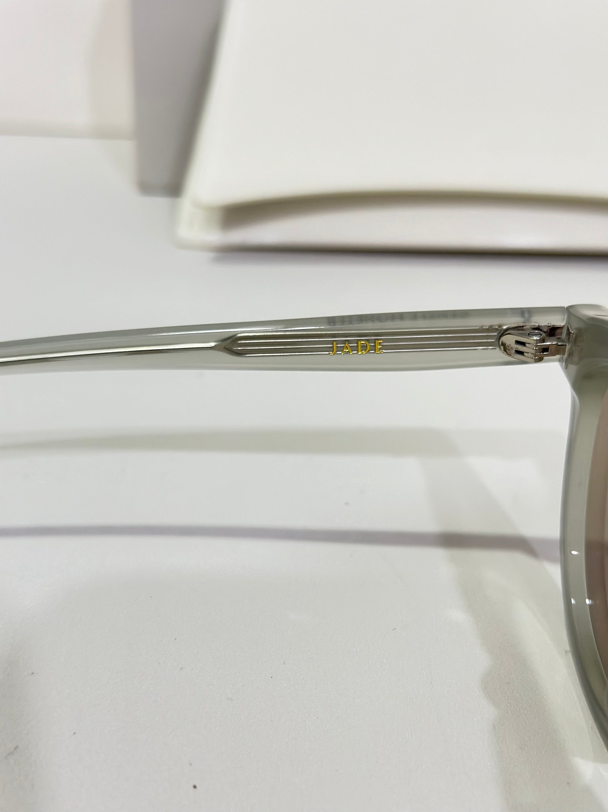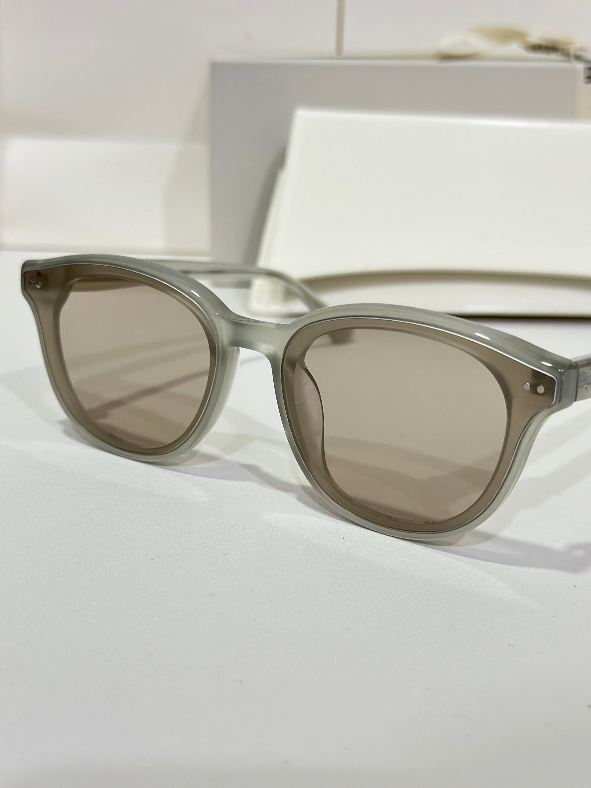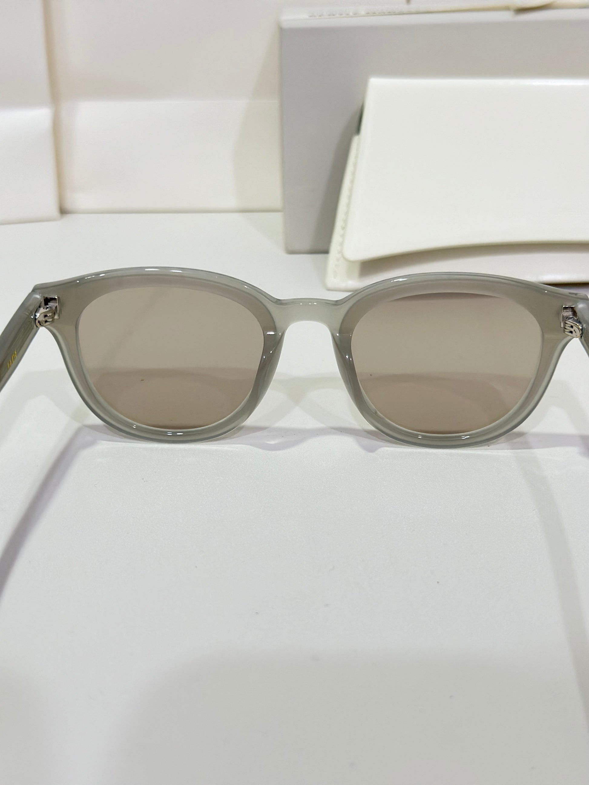 Translucent gray acetate frameBrown mirror lensesRound shapeFrame Front: 140.2mm, Frame Side: 148.9mm
