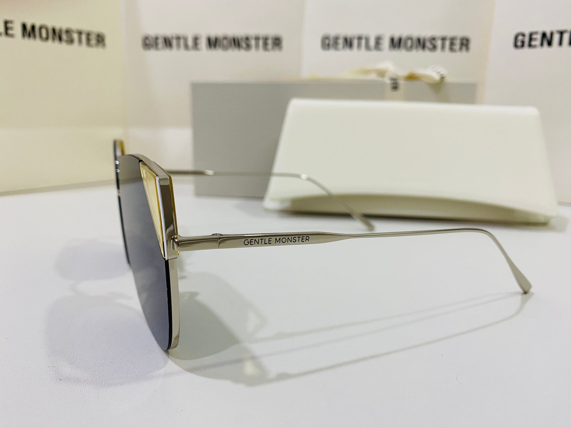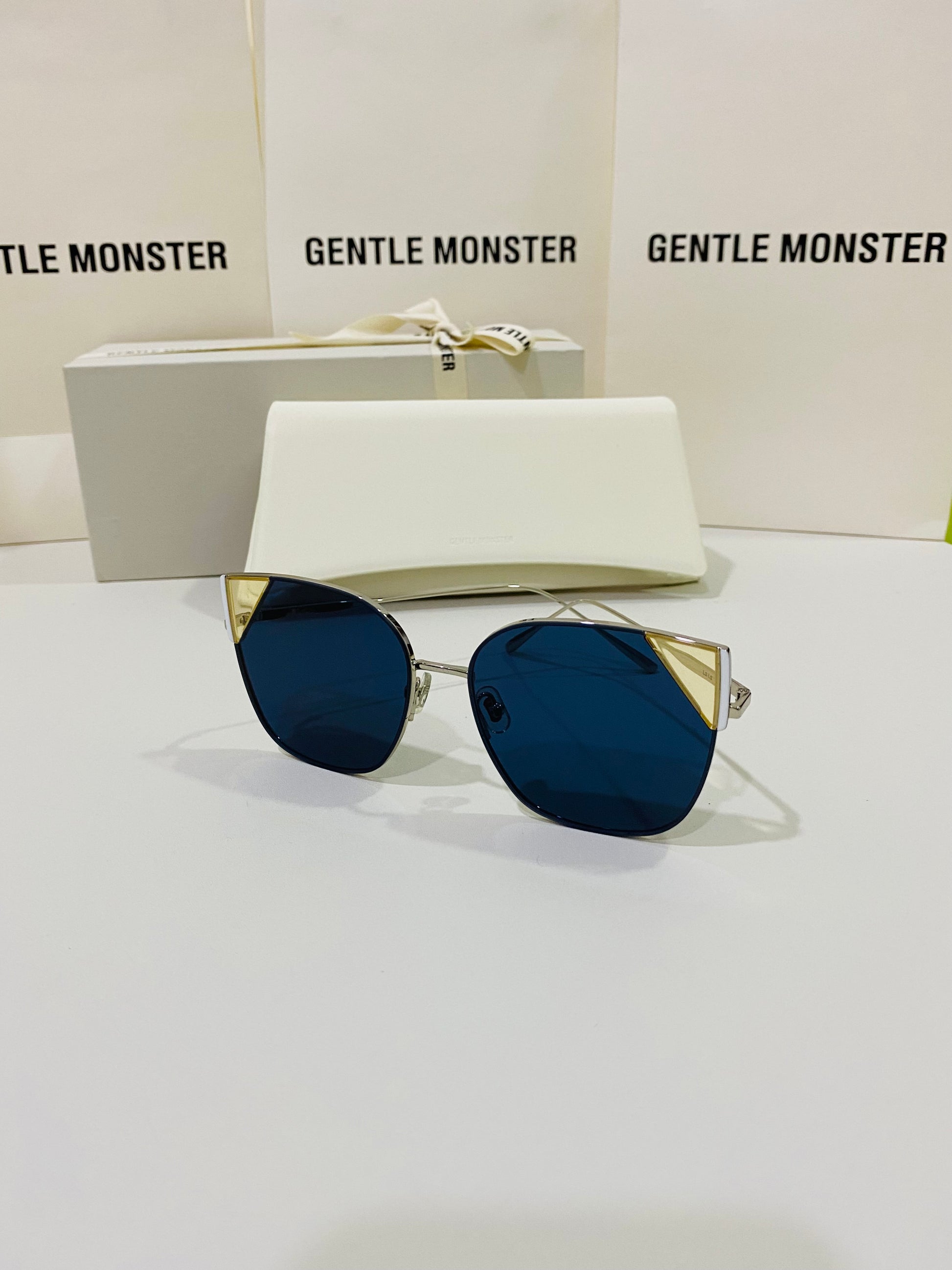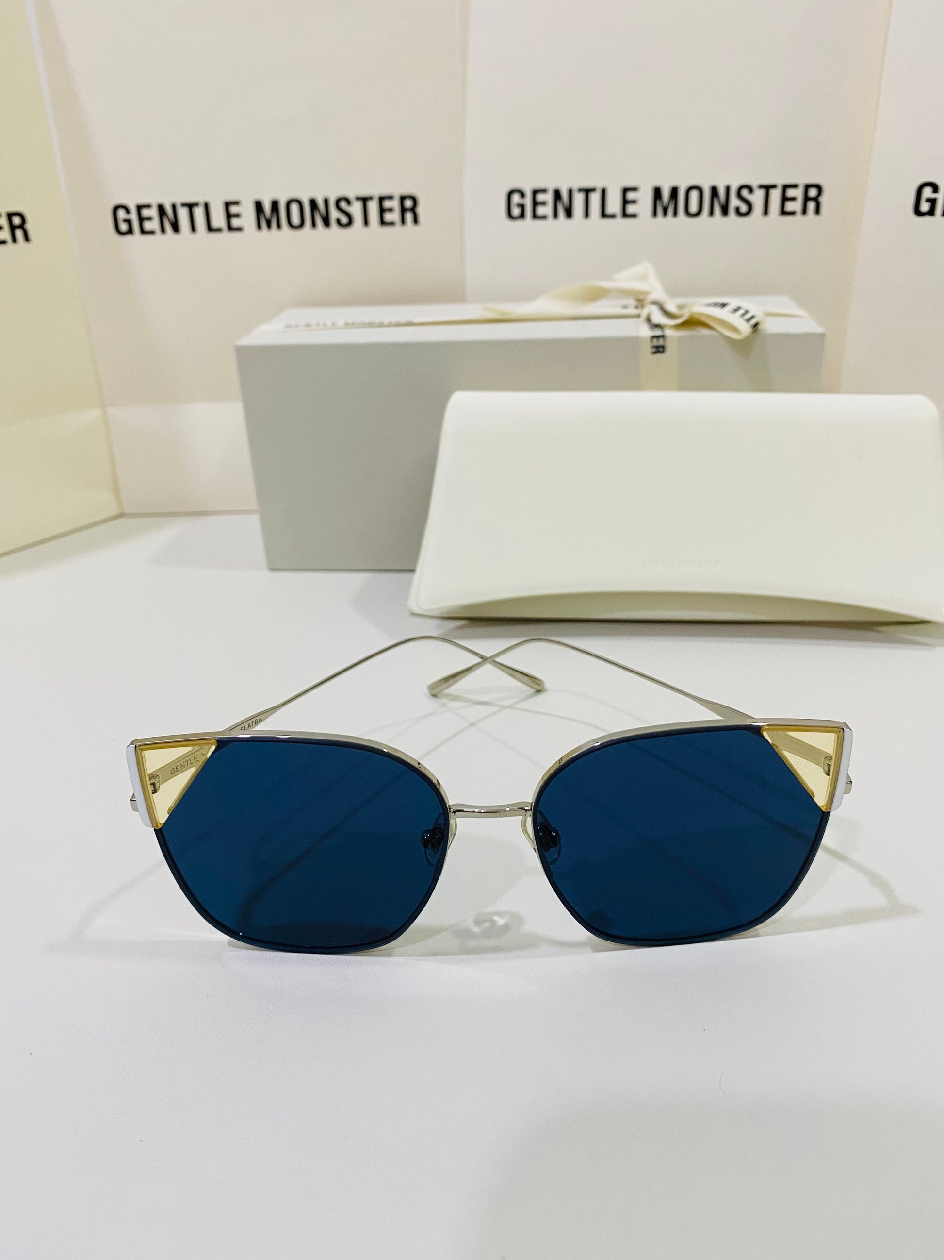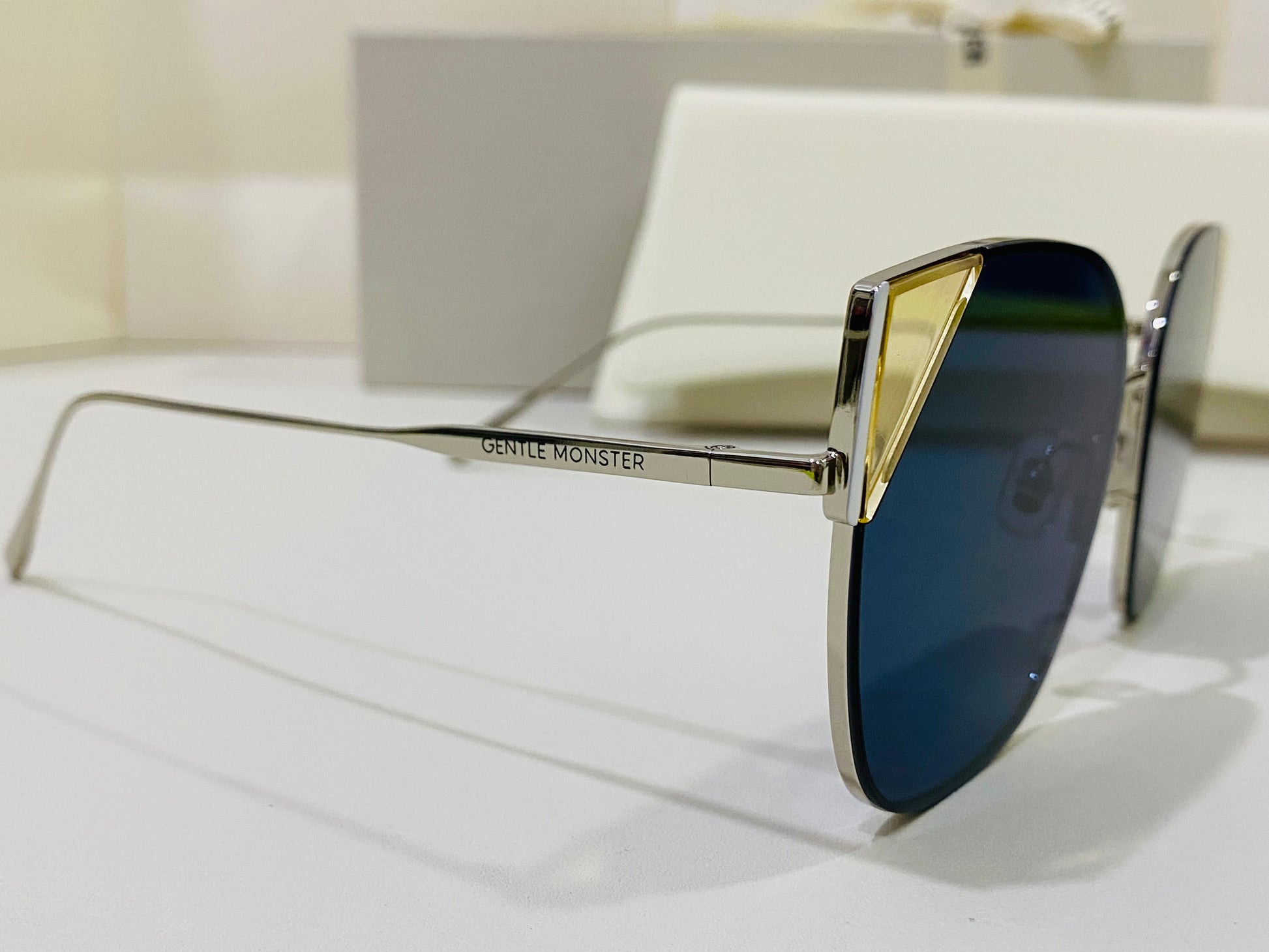 Lala YC1 is an acetate and metal combination frame introduced in the 2020 Eyewear collection. The triangular acetate piece boldly accentuates the sunglasses while flawlessly blending in with the rest of the lens. The 99.9% UV protected navy lenses and silver metal temples engraved with Gentle Monster complete this frame.