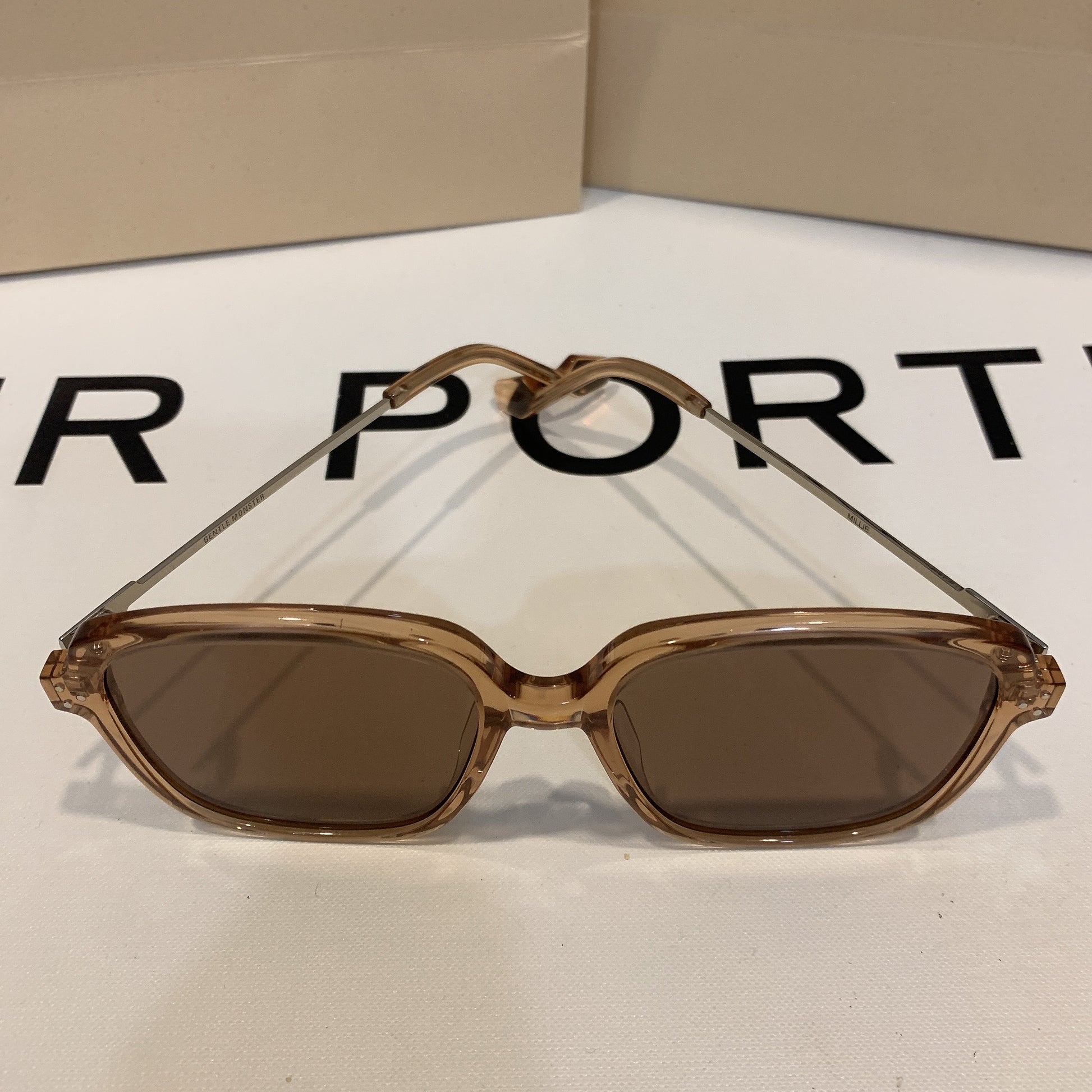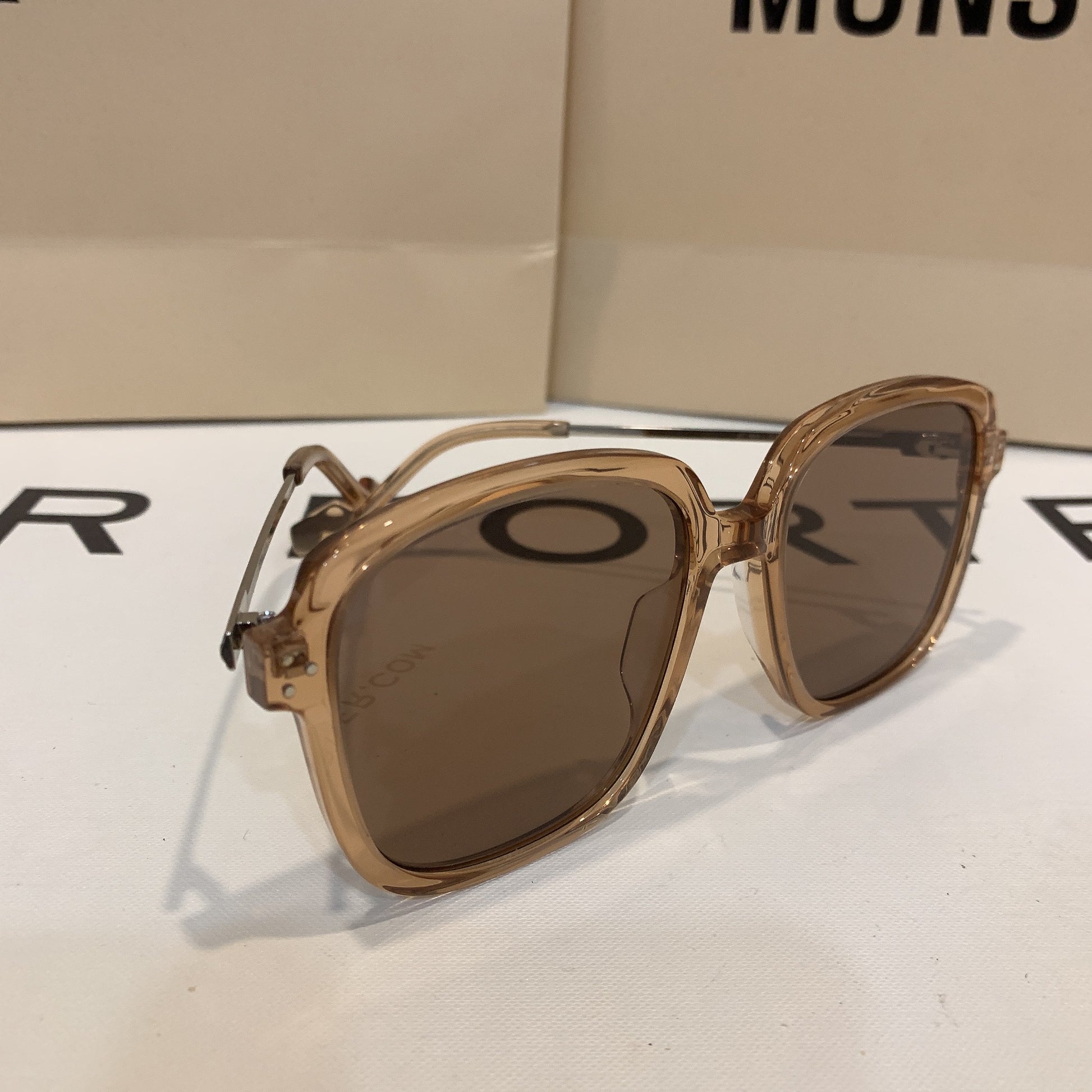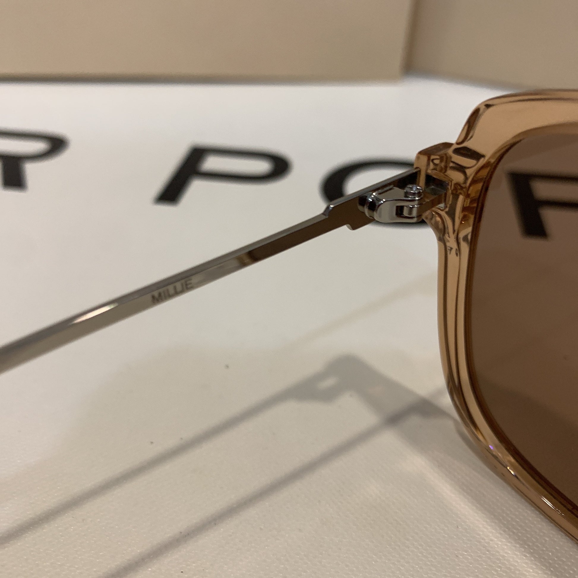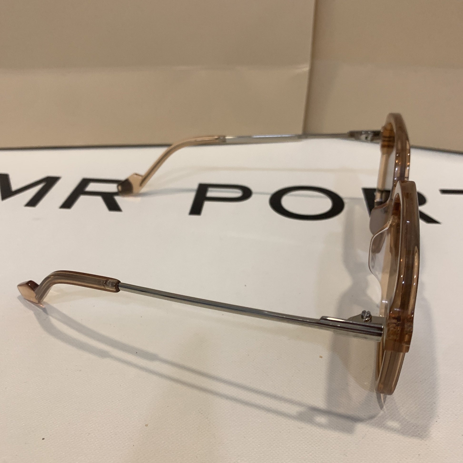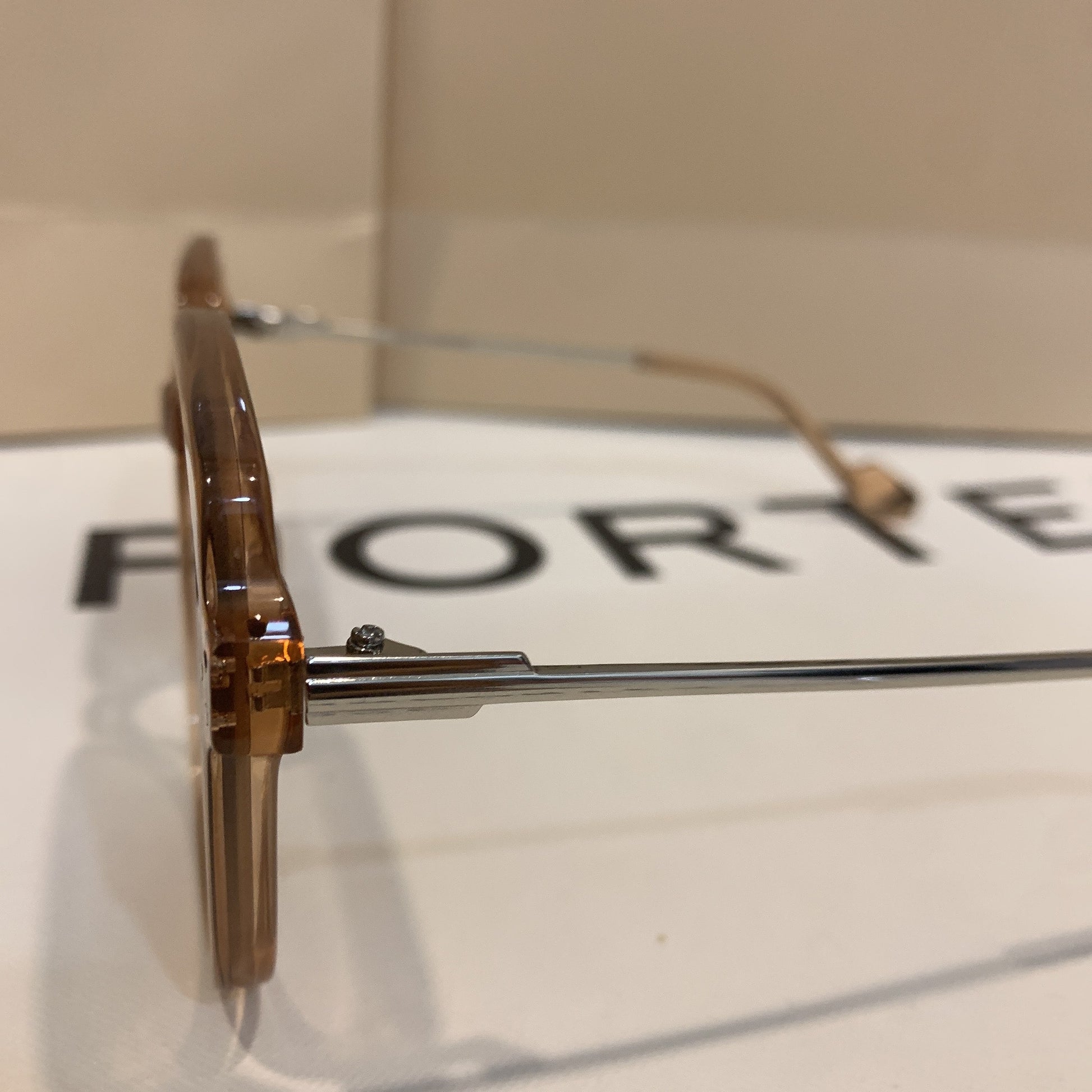 Millie BRC1 is a clear brown frame crafted of acetate and metal. The endpiece is accentuated with three circular studs, complemented by uniquely shaped temple tips and 99.9% UV protected brown lenses.