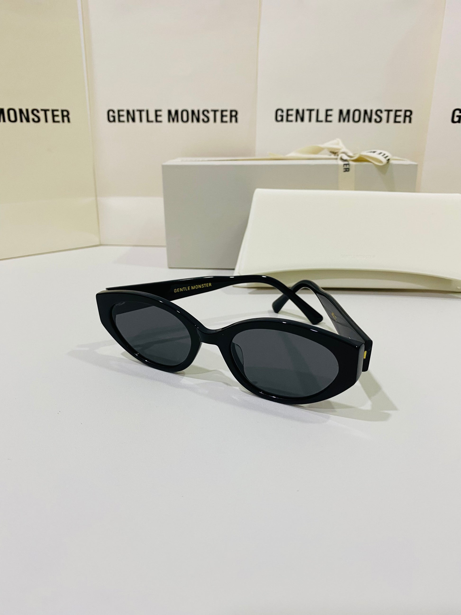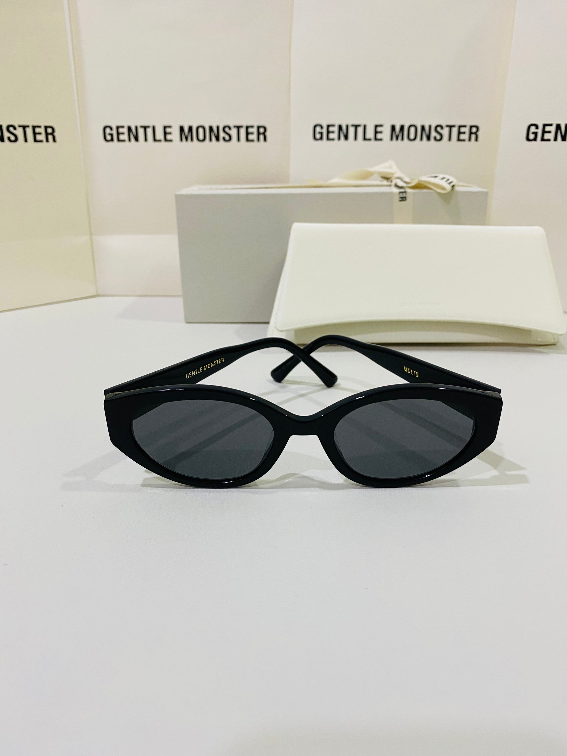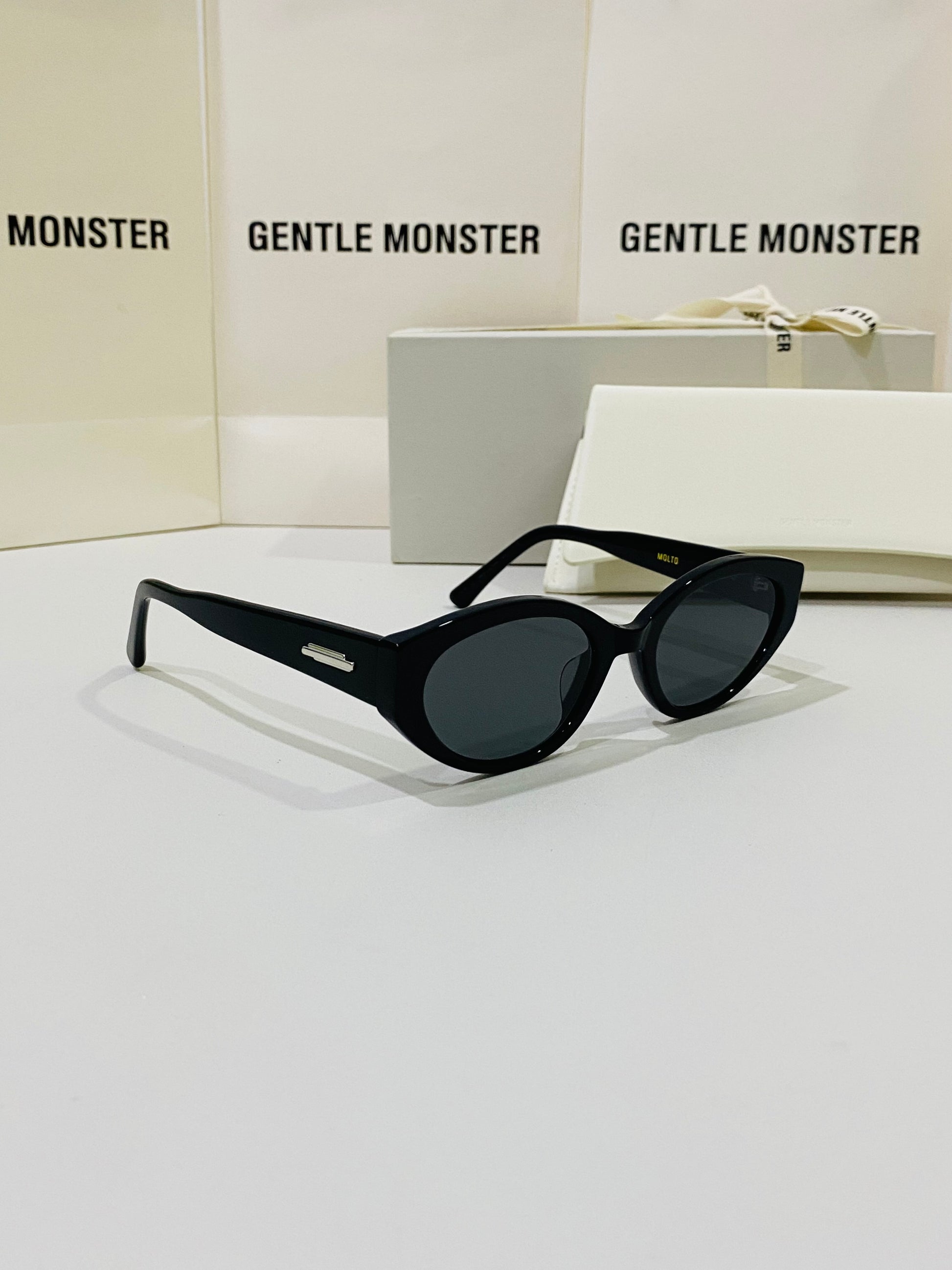 Molto 01 is a cat-eye frame crafted of black acetate. This wide and voluminous design features temples with unique silver metal details and black lenses with 99.9% UV protection.