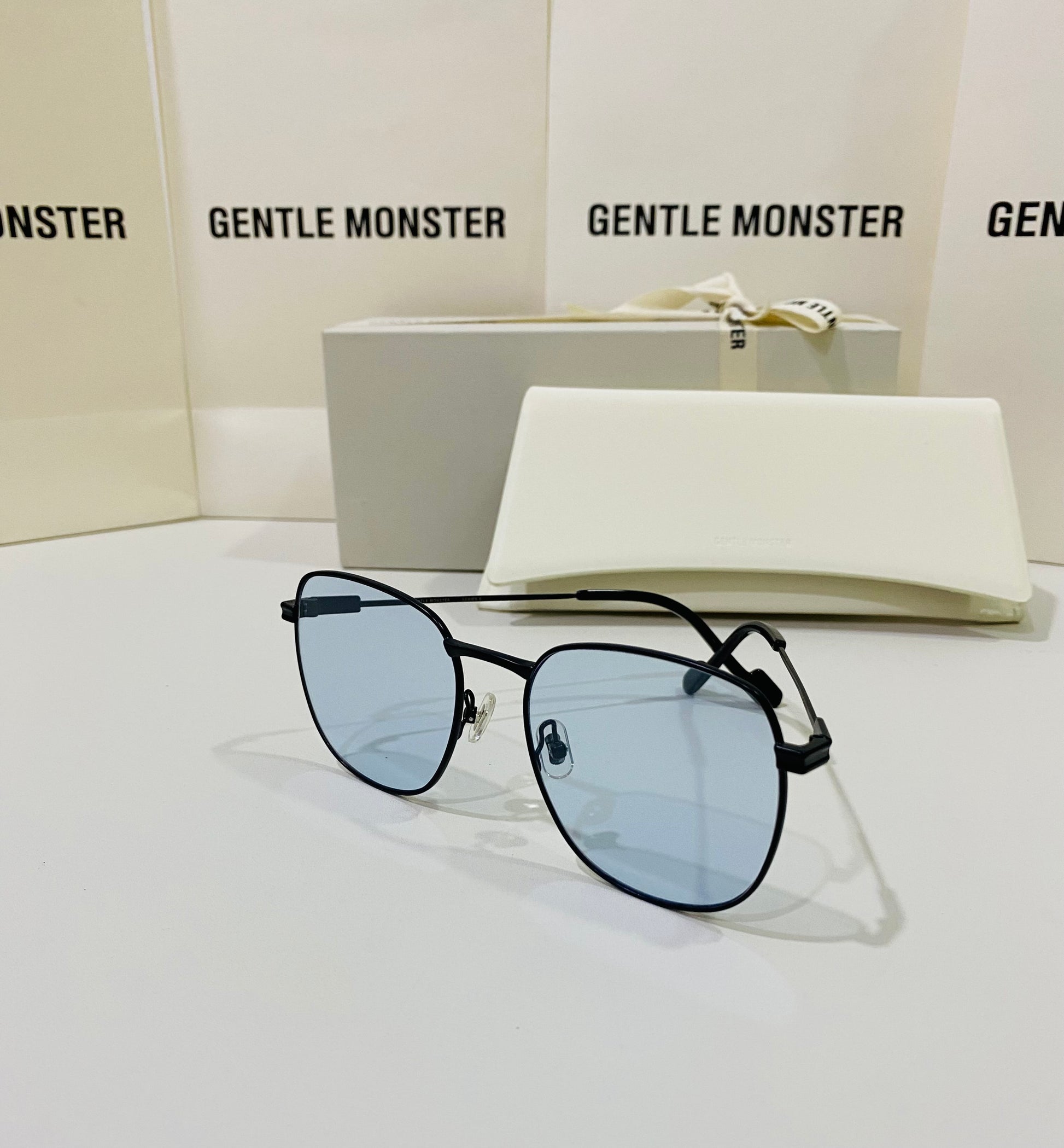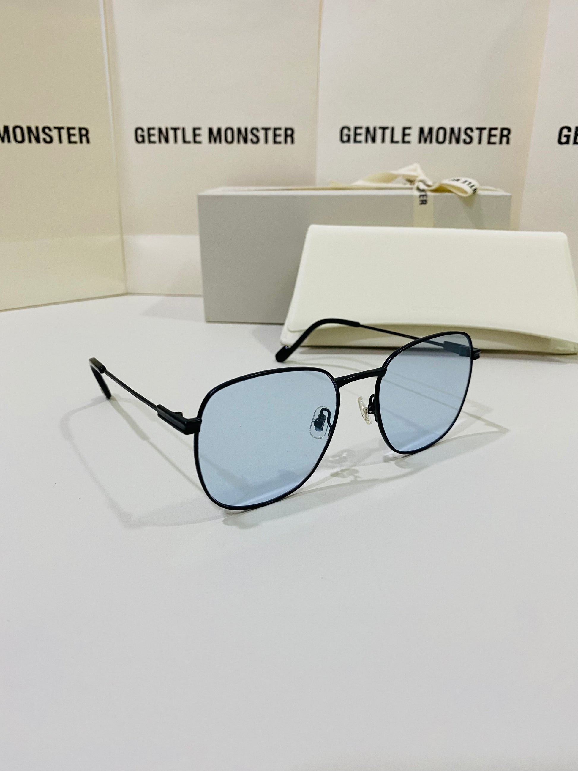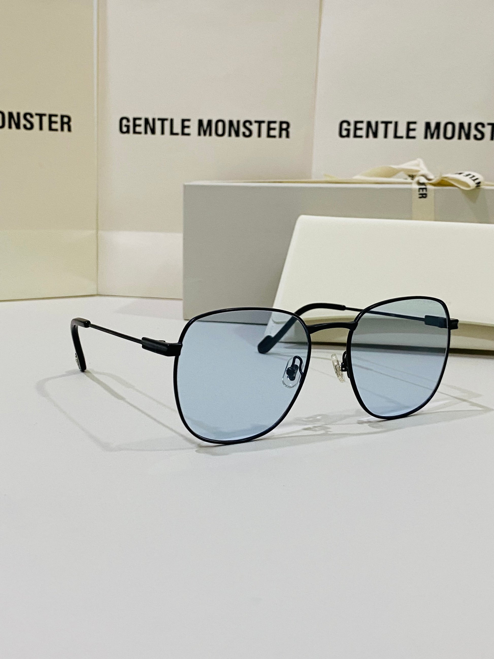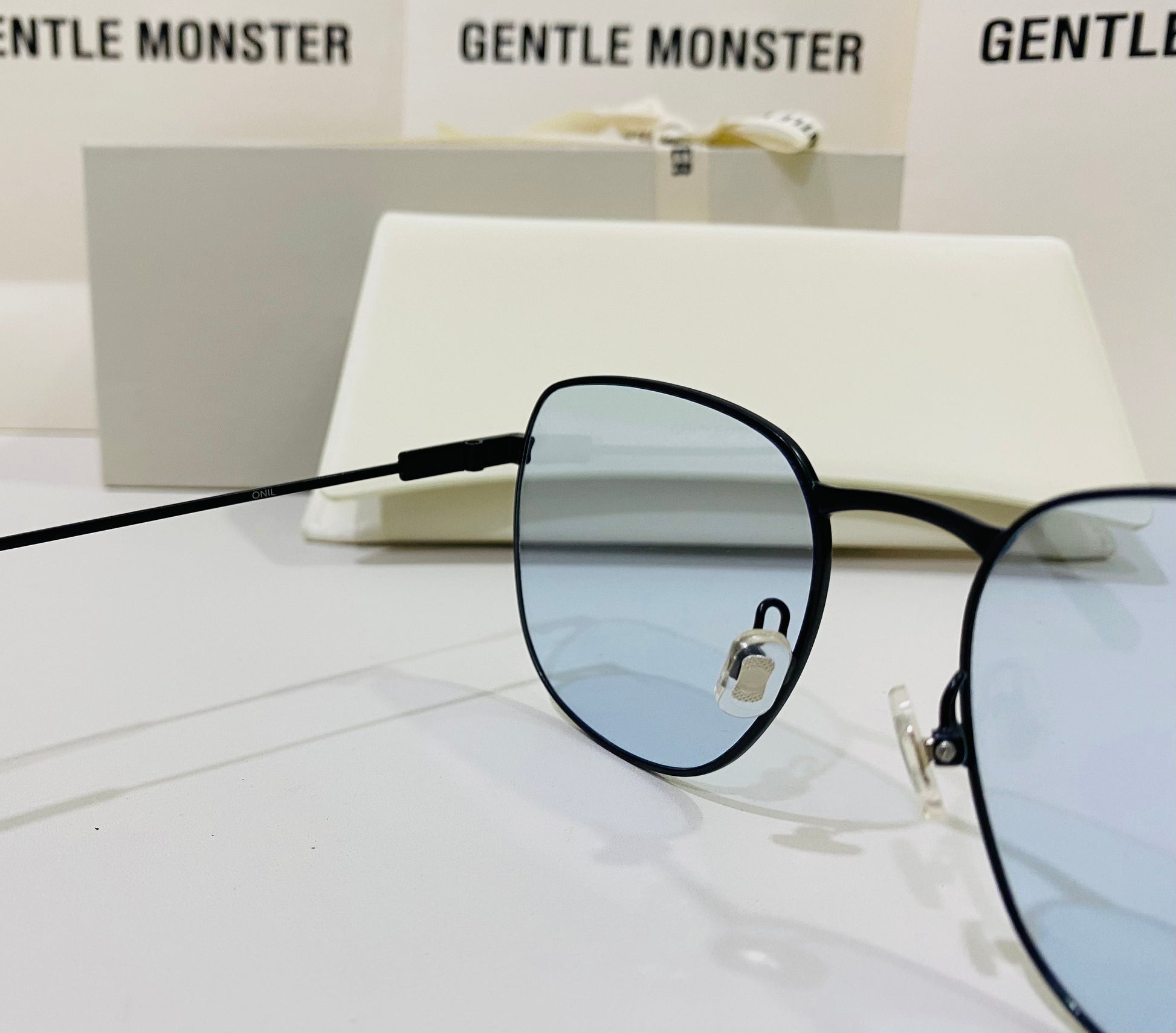 Onil M01 is a square silhouetted, black metal frame. With thin lines and soft curves, this oversized frame also features a uniquely shaped bridge, temple tips presented in the 2021 Collection, and fitted with 99.9% UV protected blue lenses.