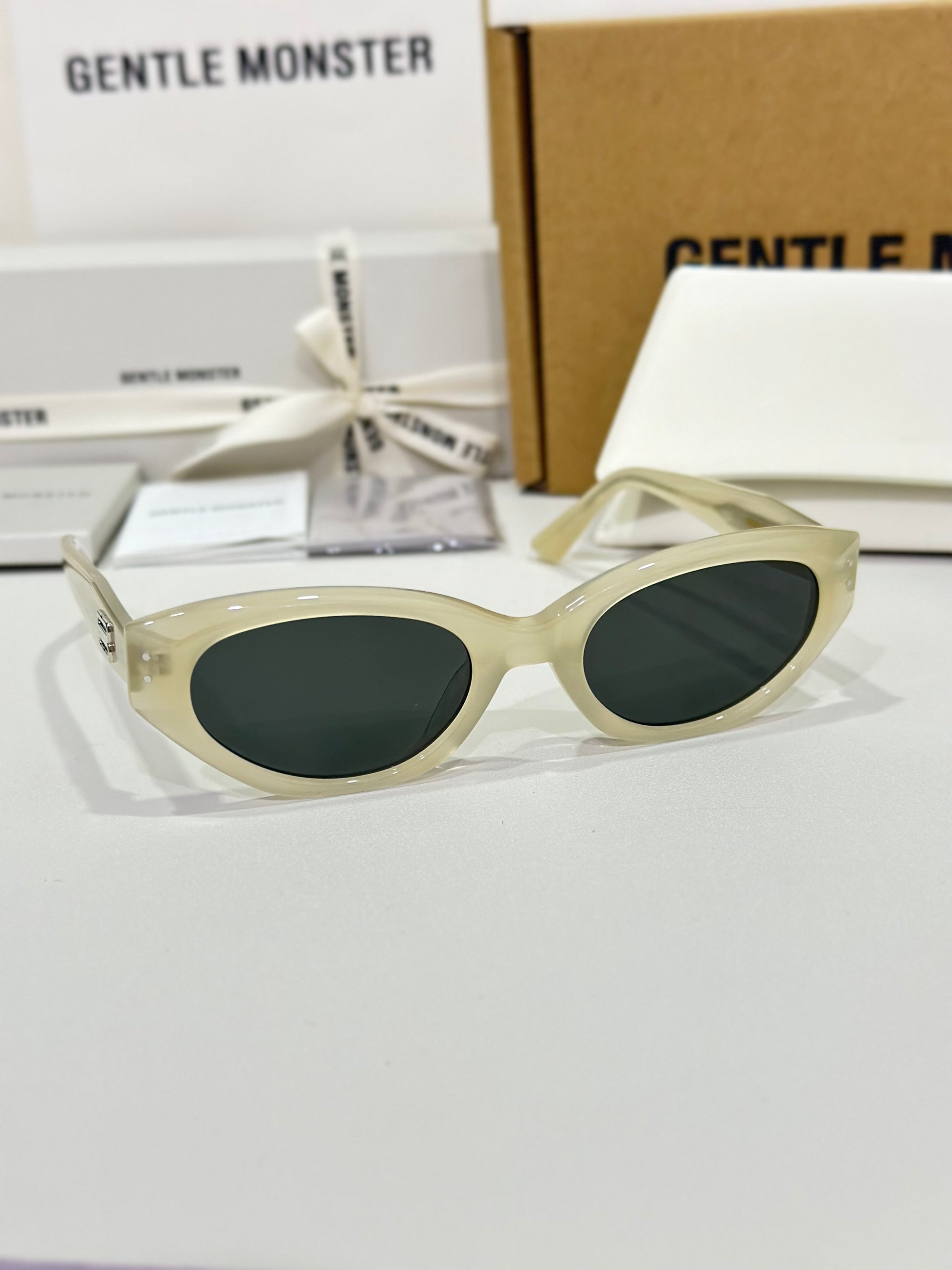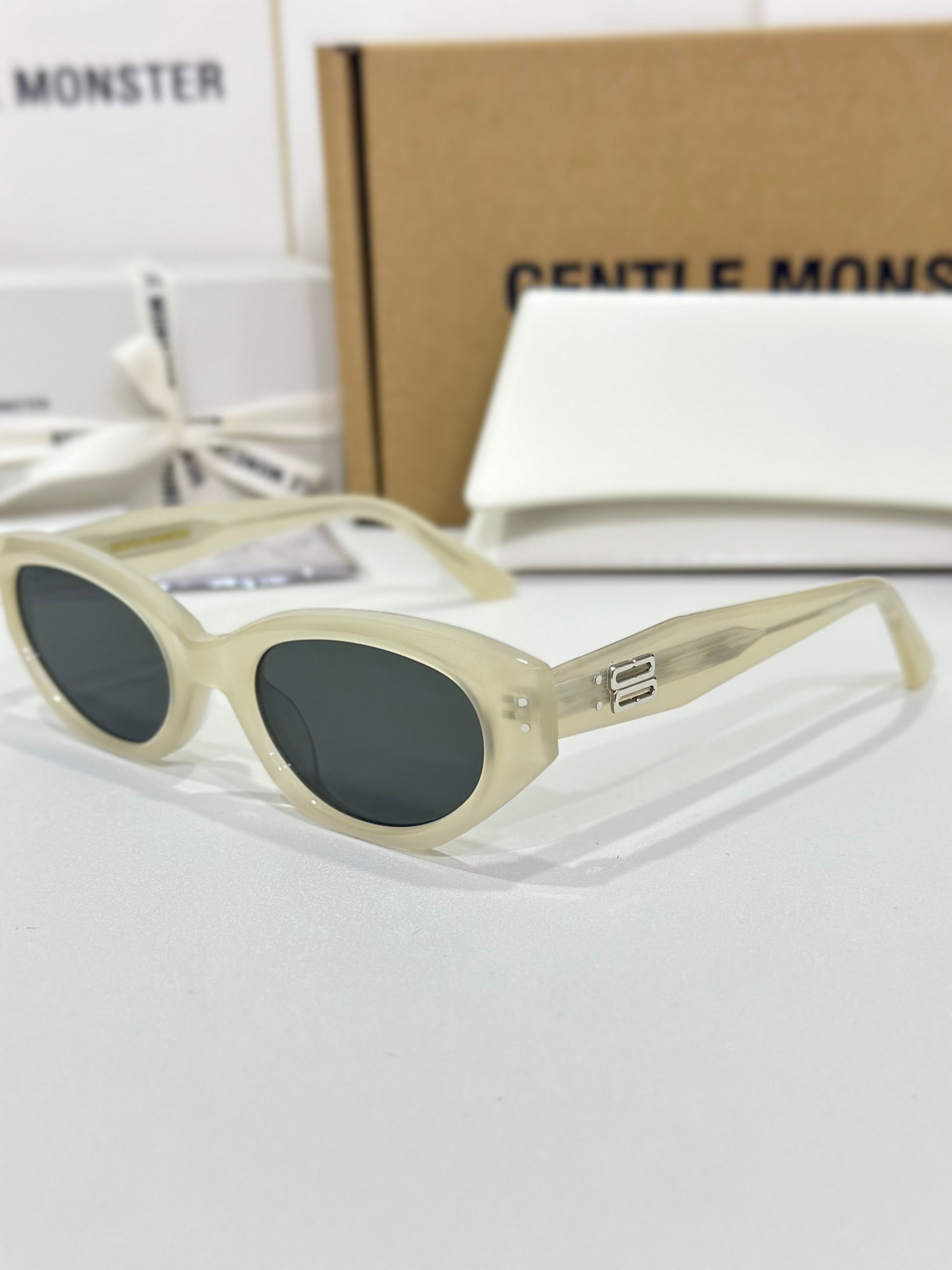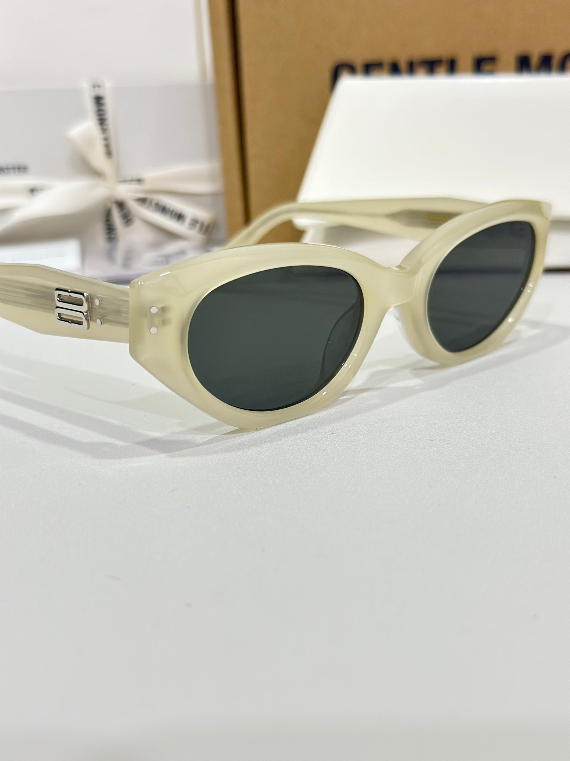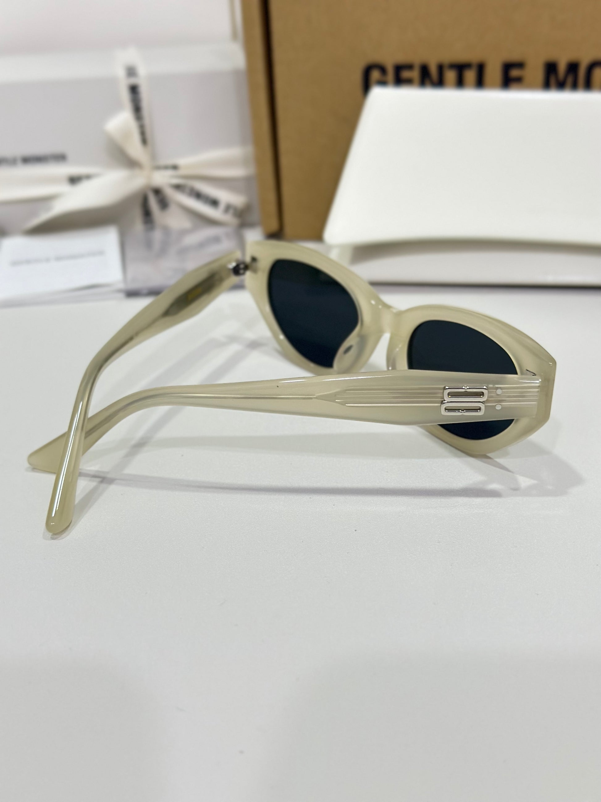 Discover the Rococo IC1 sunglasses from Gentle Monster’s 2023 Collection. The straight lines of this voluminous silhouette immediately draw the eye to a composition that stands out for its remarkable design. Featuring a subtle ivory frame, the iconic metal detail on the translucent temples adds a touch of sophistication to this piece.