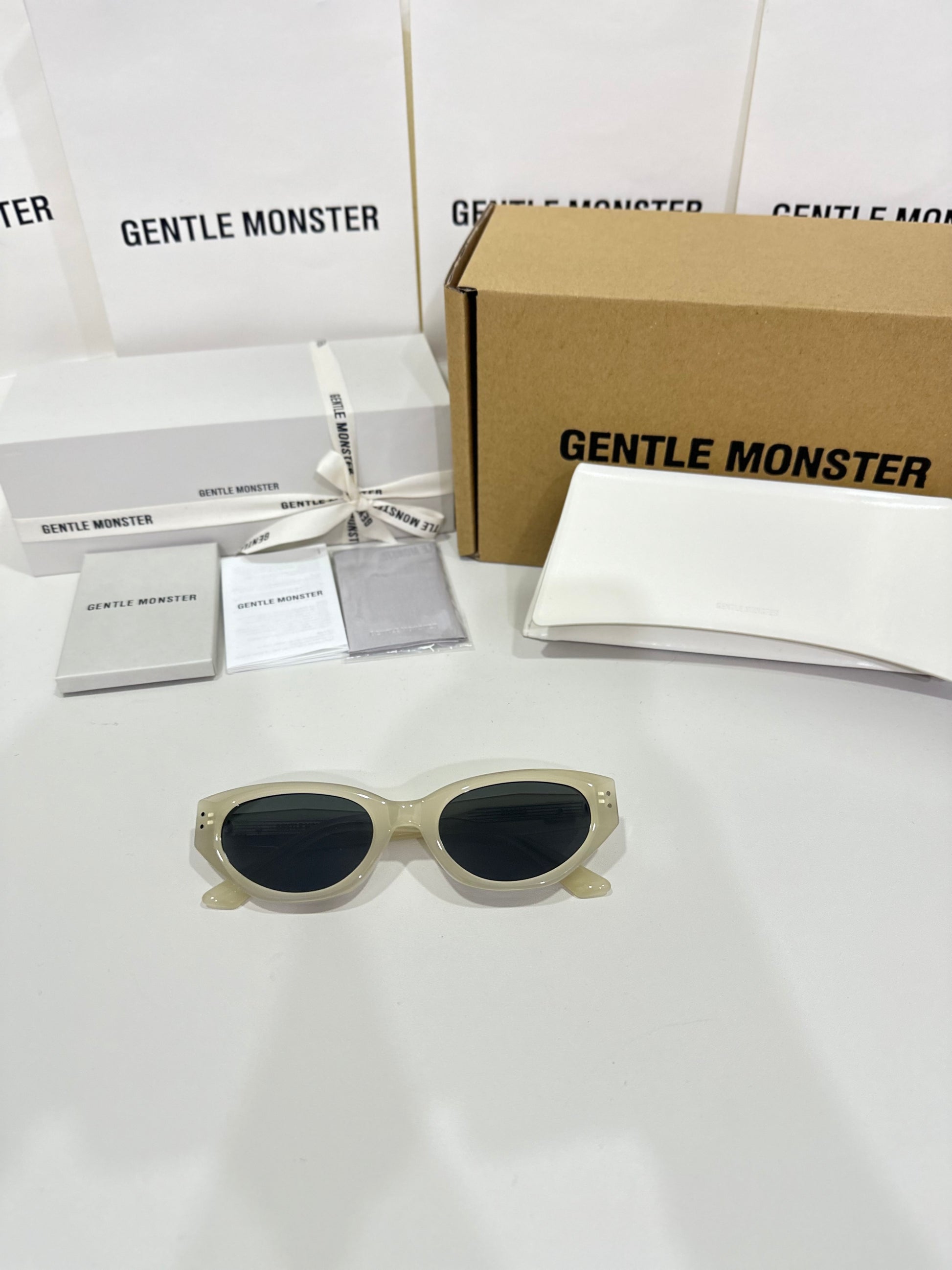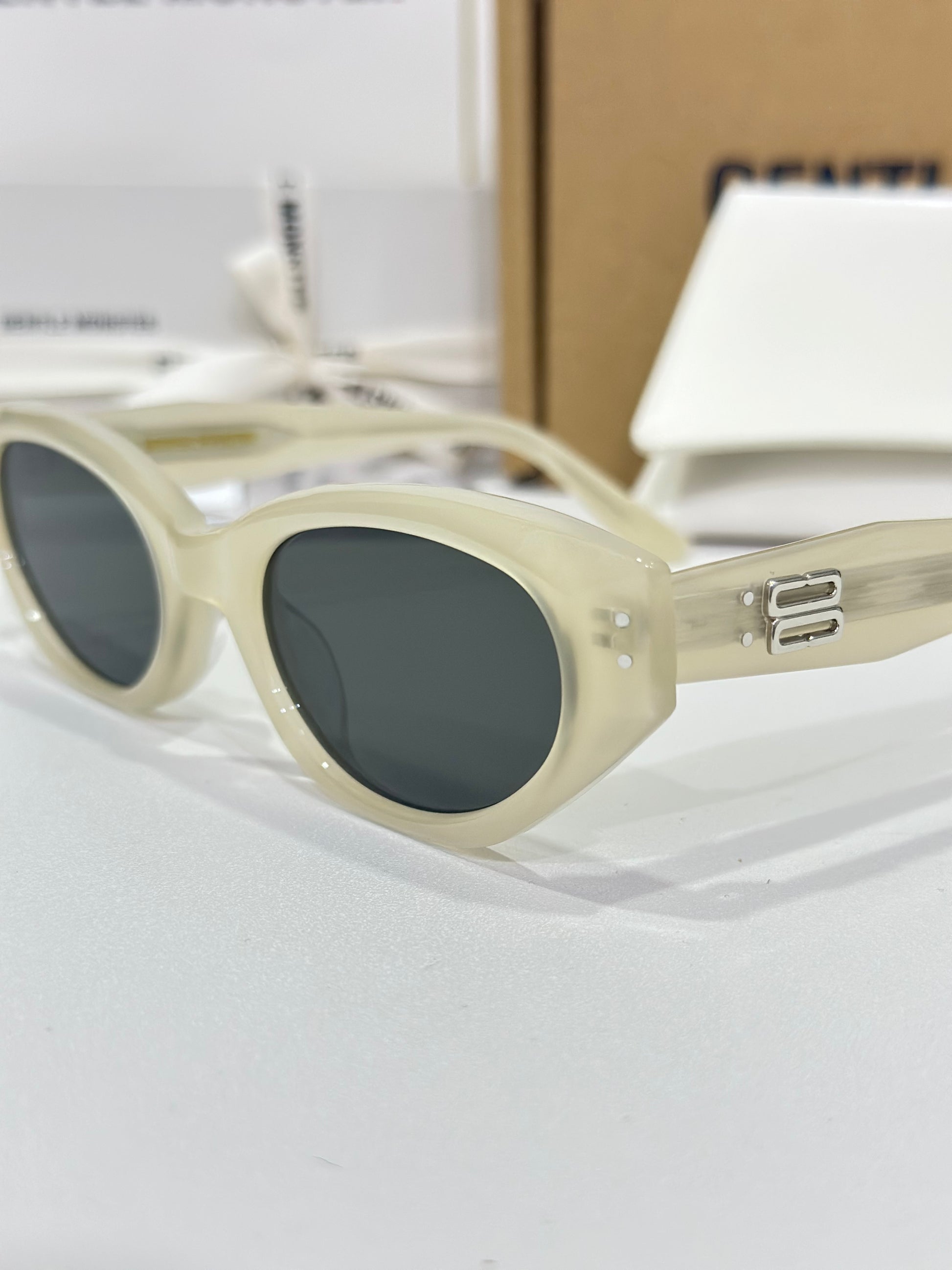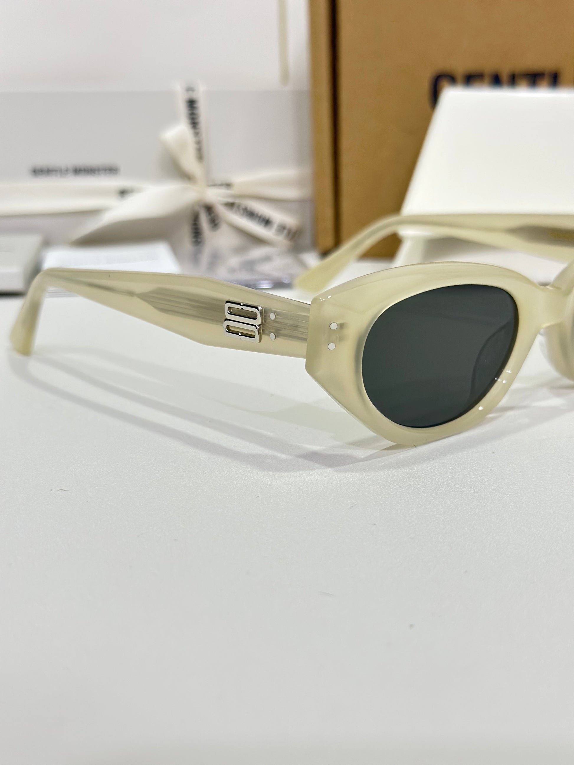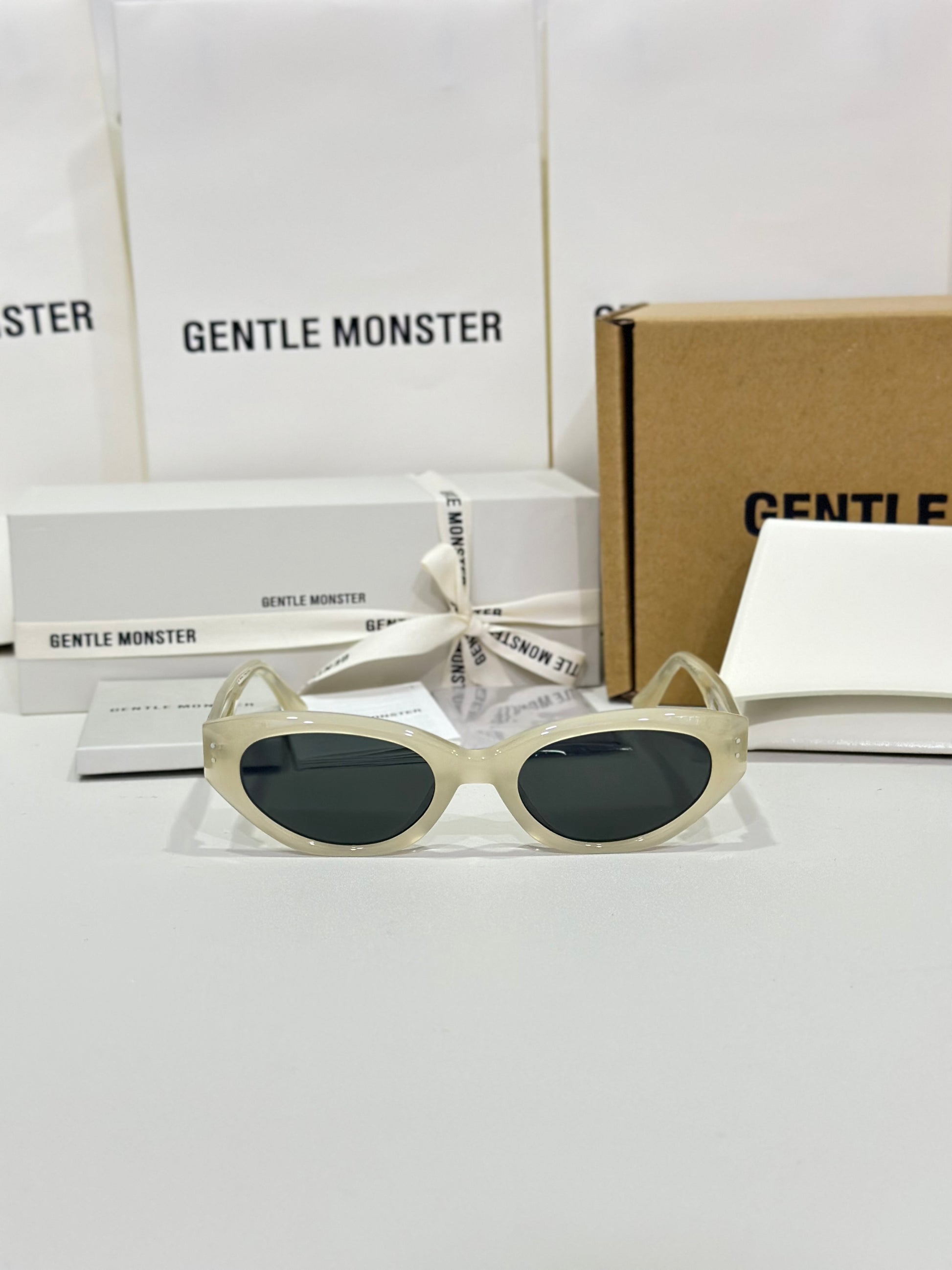 Discover the Rococo IC1 sunglasses from Gentle Monster’s 2023 Collection. The straight lines of this voluminous silhouette immediately draw the eye to a composition that stands out for its remarkable design. Featuring a subtle ivory frame, the iconic metal detail on the translucent temples adds a touch of sophistication to this piece.