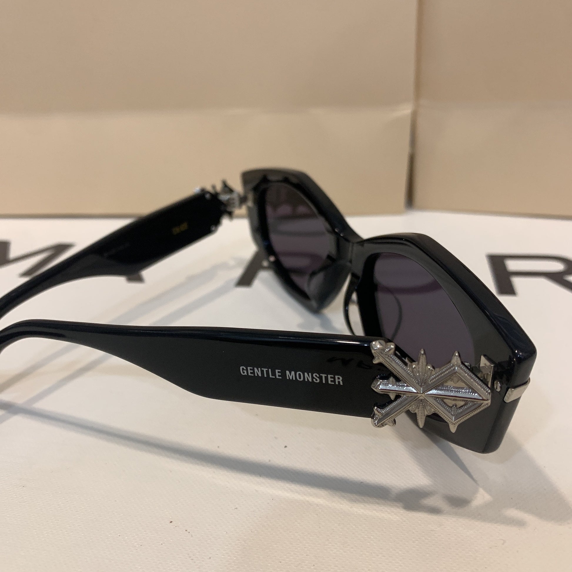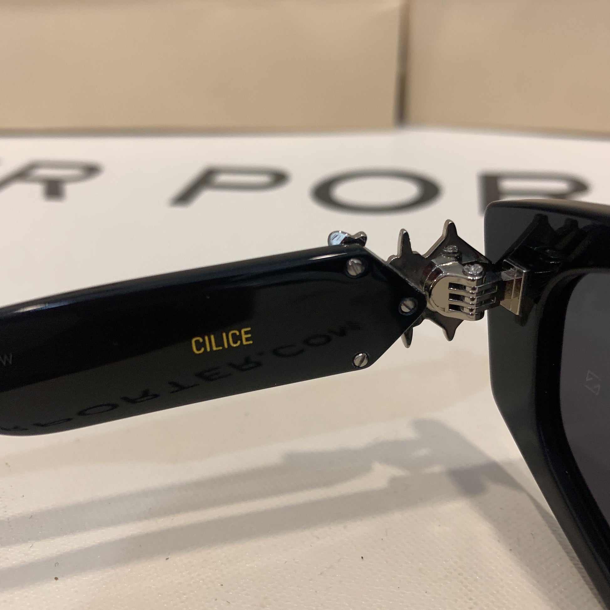 Cilice 01 is a cat-eye frame crafted from black acetate. Designed in collaboration with Sankuanz, these sunglasses feature a unique hexagonal frame front with silver metal details, fitted with 99.9% UV protected black lenses.
