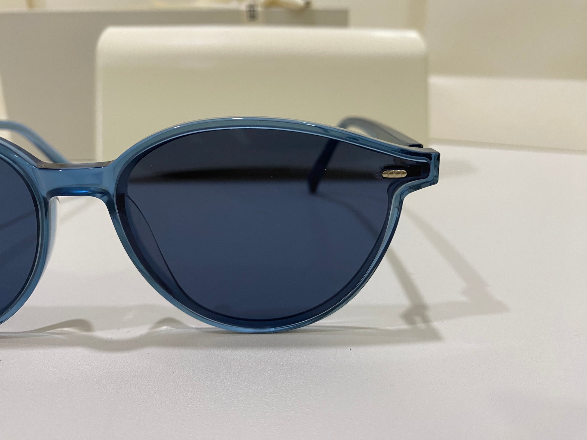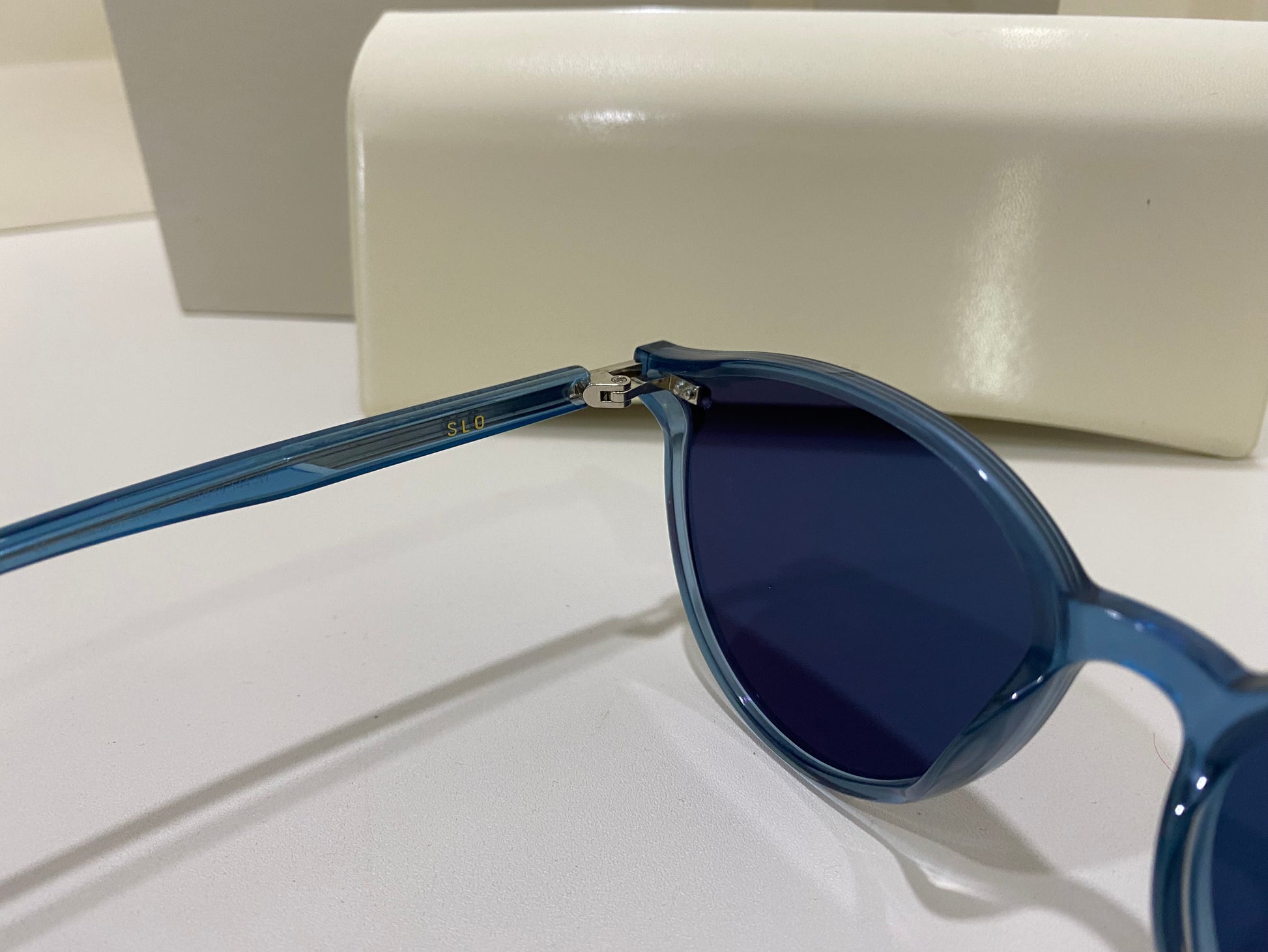 Slo N2 is a Boston style frame reinterpreted into a Flatba design. This round blue acetate frame is adorned with metal accents on the endpieces and fitted with 99.9% UV protected blue lenses.