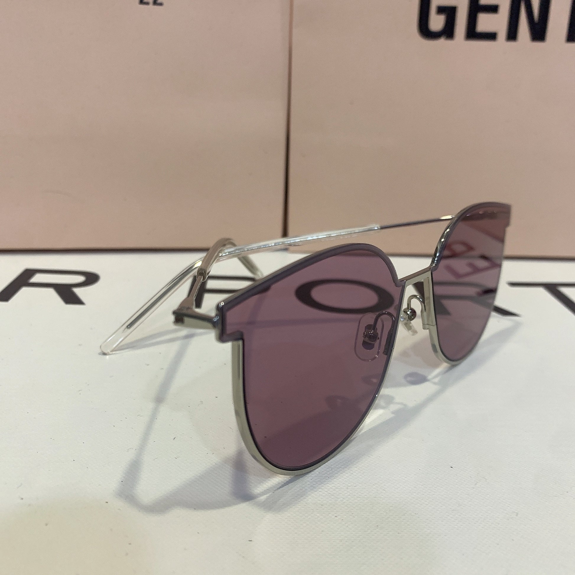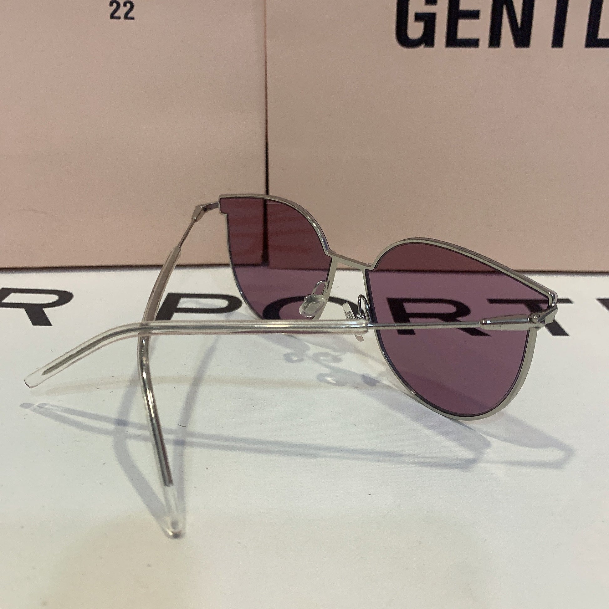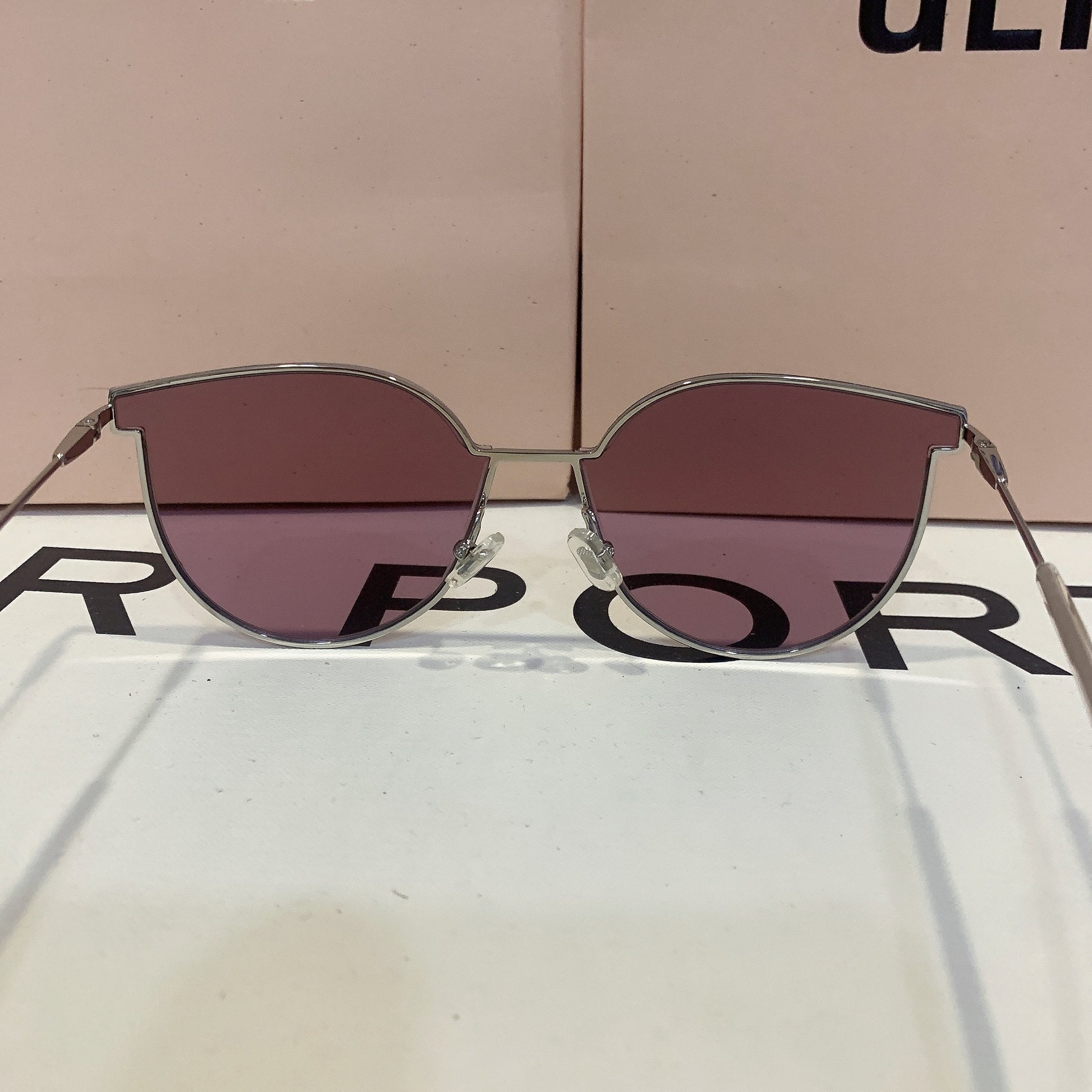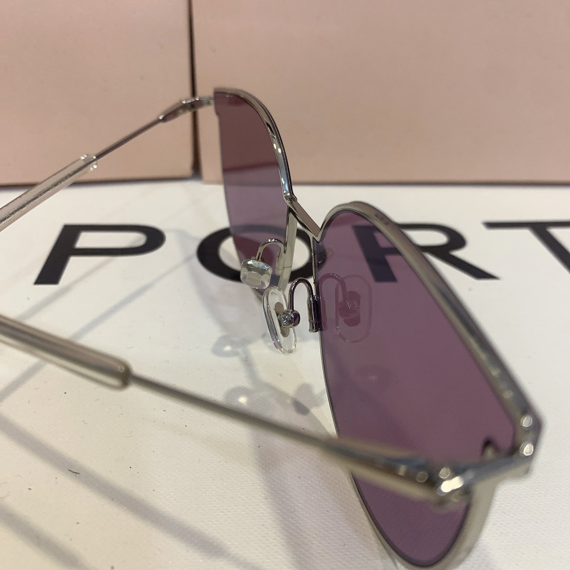 The Solaris 02 is a silver stainless steel frame, featuring monel temples, adjustable PVC nose pads, and acetate temple tips. This style is unique in that only the lower half of the flat purple lenses is visibly lined with metal. The frames are complete with flat lenses that provide 100% UV Protection.