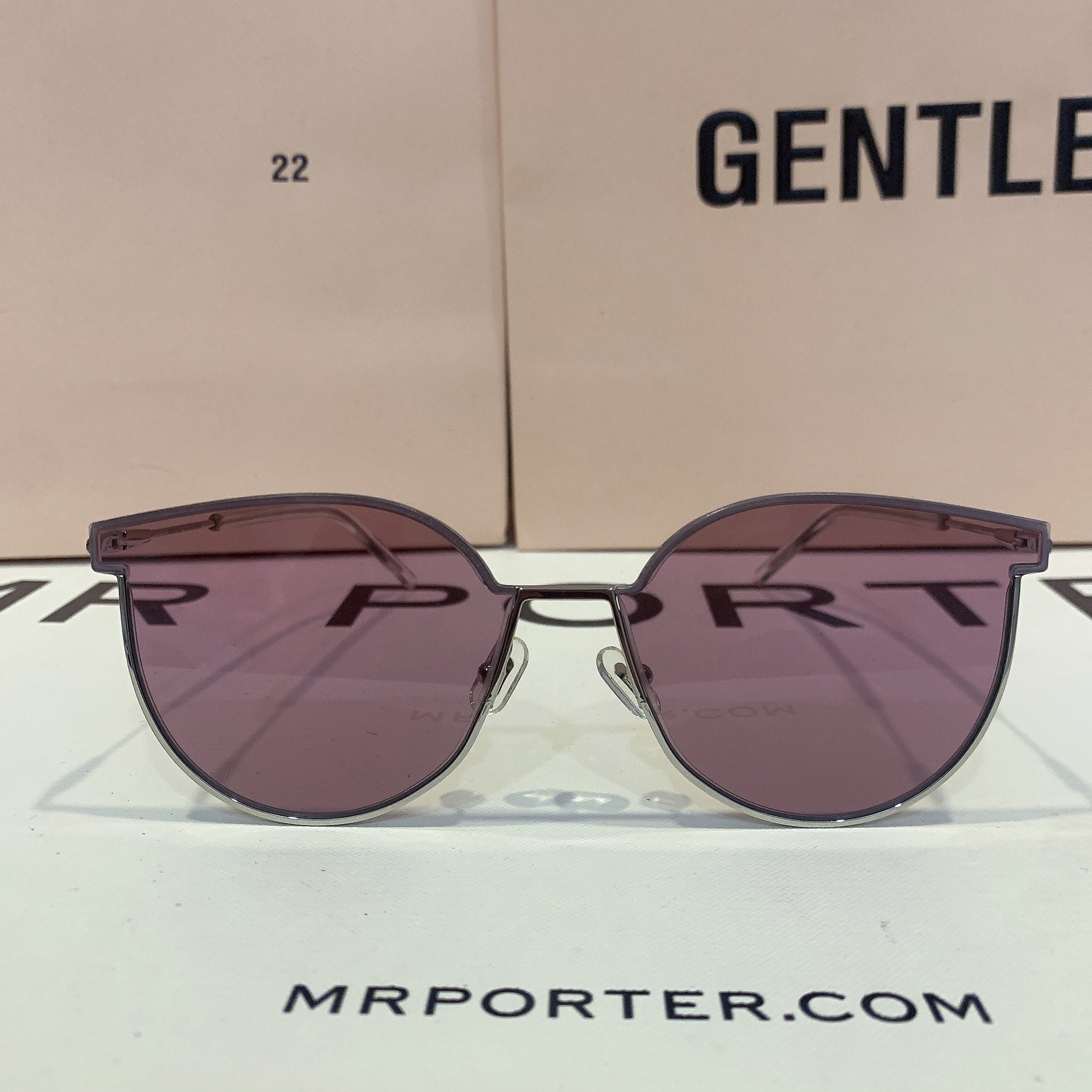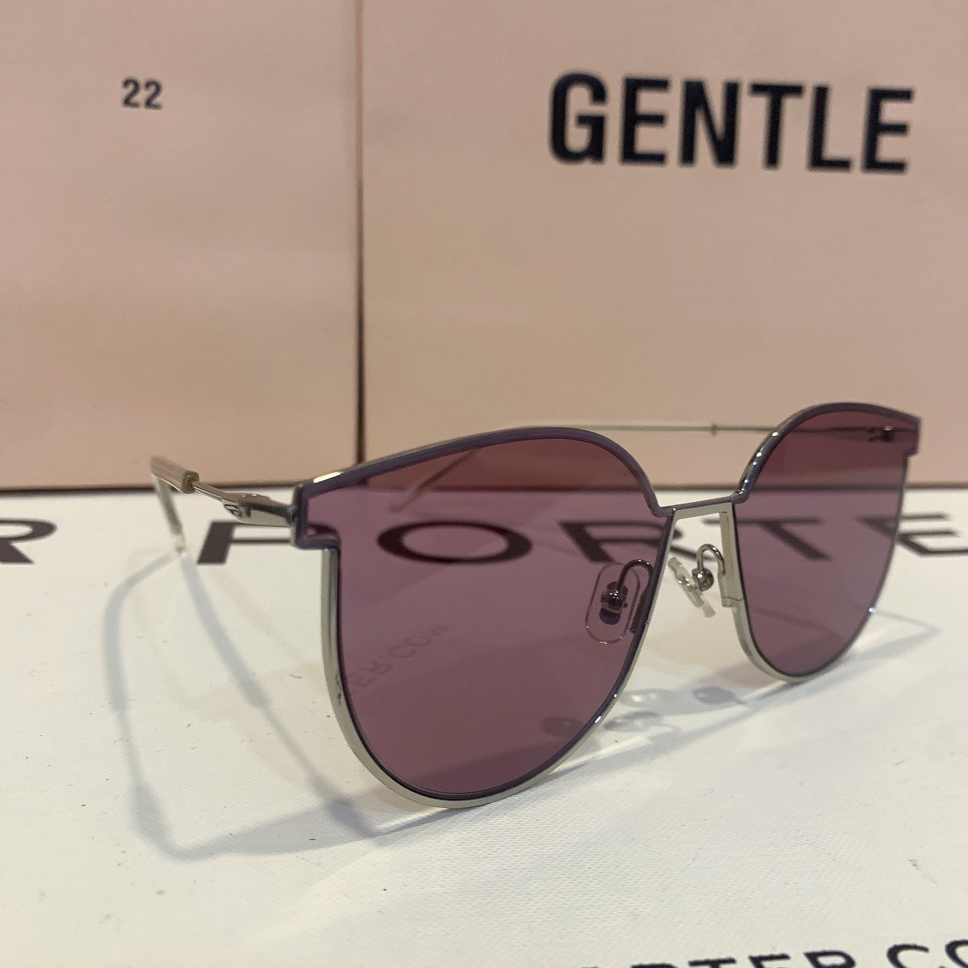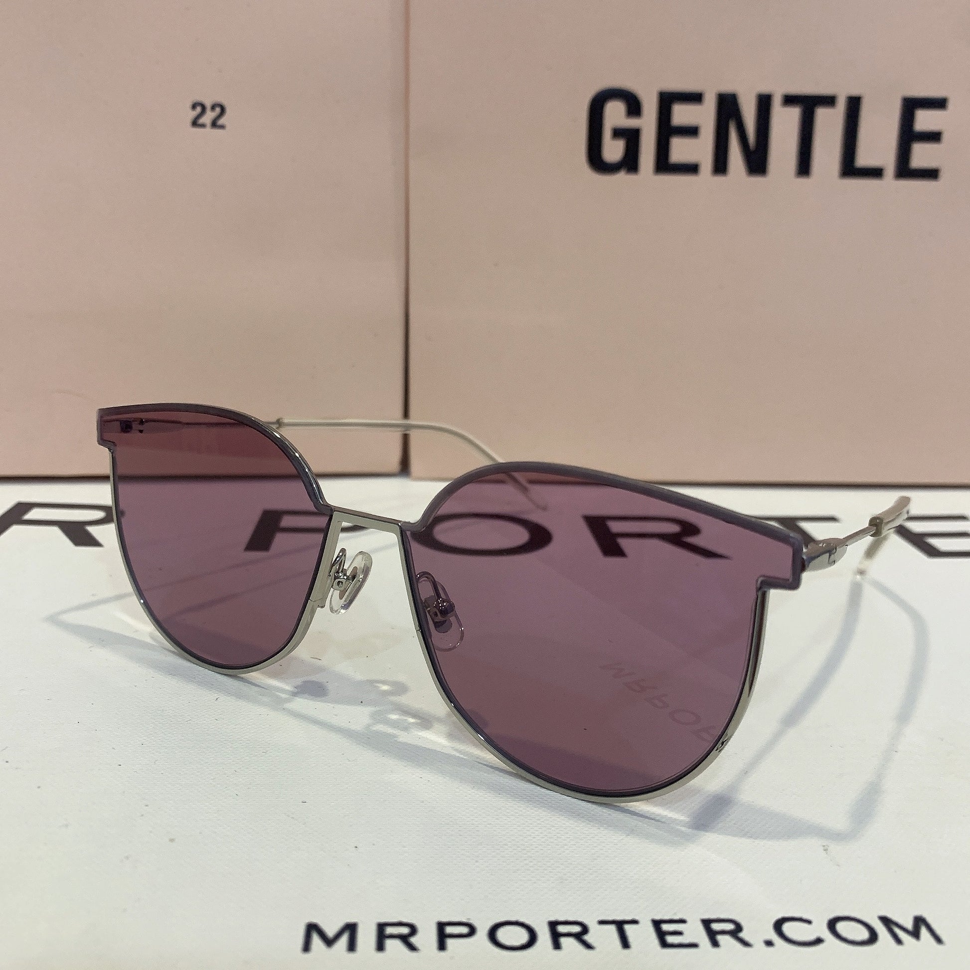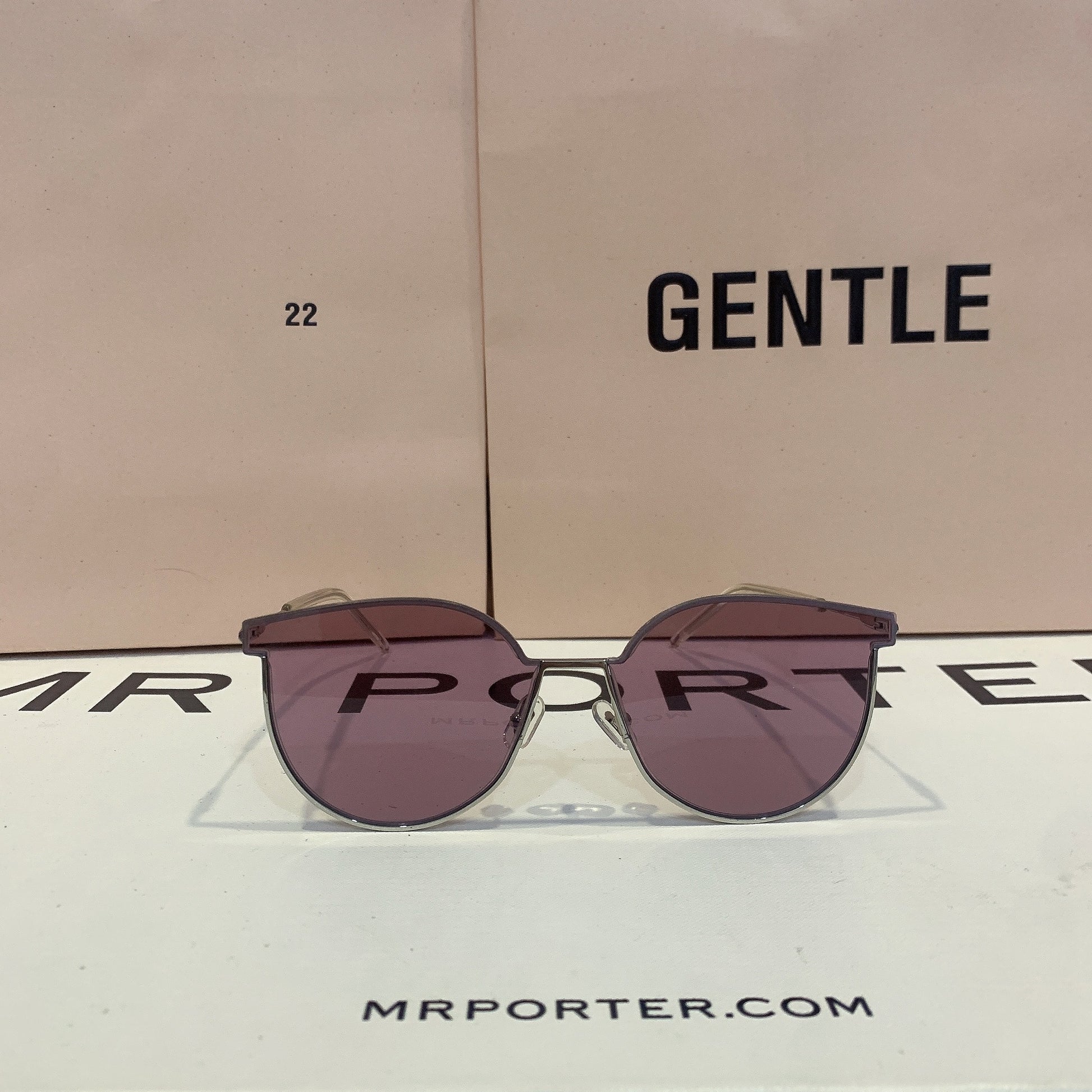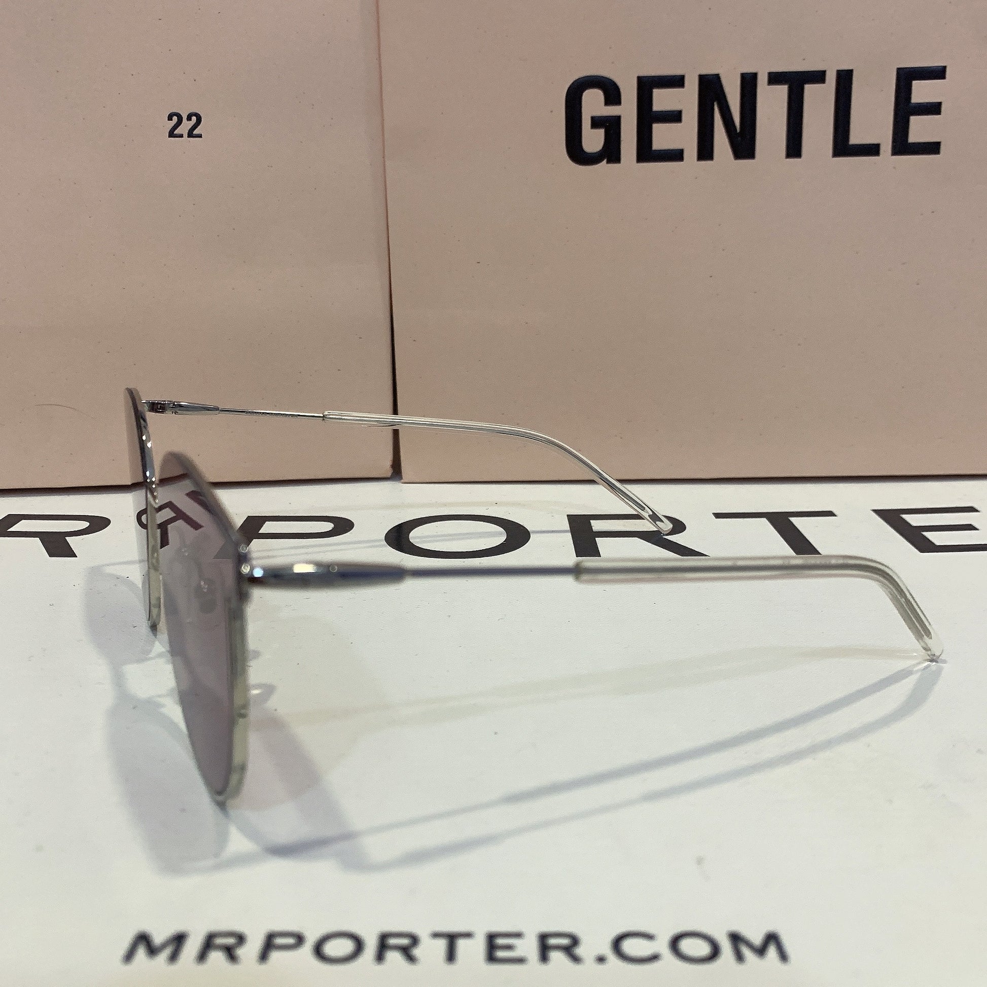 The Solaris 02 is a silver stainless steel frame, featuring monel temples, adjustable PVC nose pads, and acetate temple tips. This style is unique in that only the lower half of the flat purple lenses is visibly lined with metal. The frames are complete with flat lenses that provide 100% UV Protection.