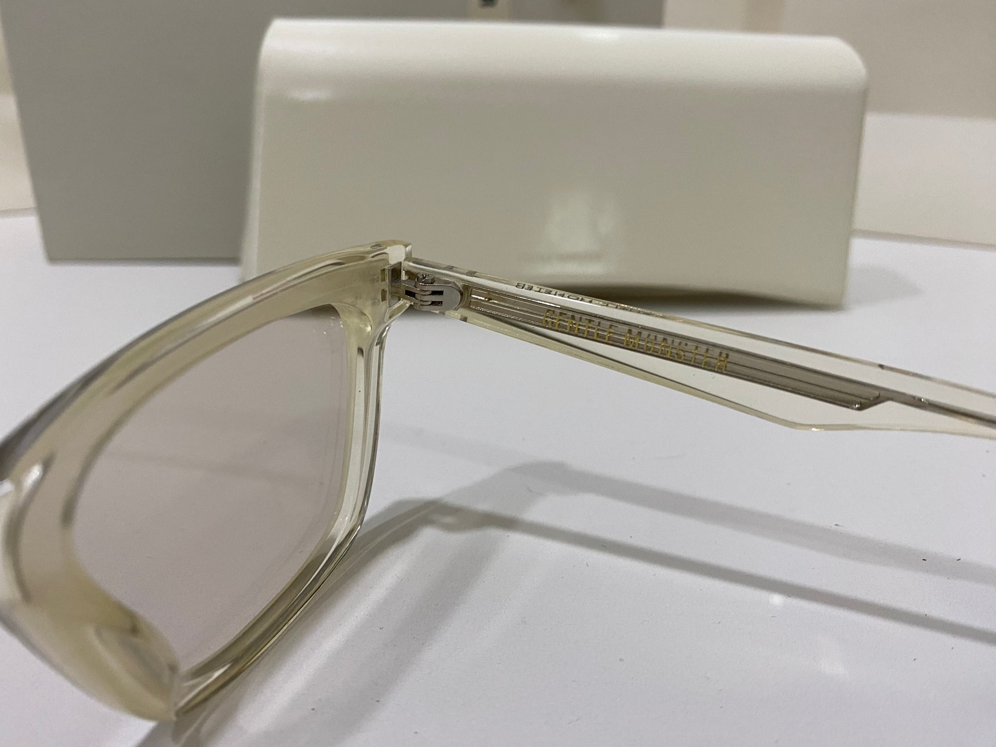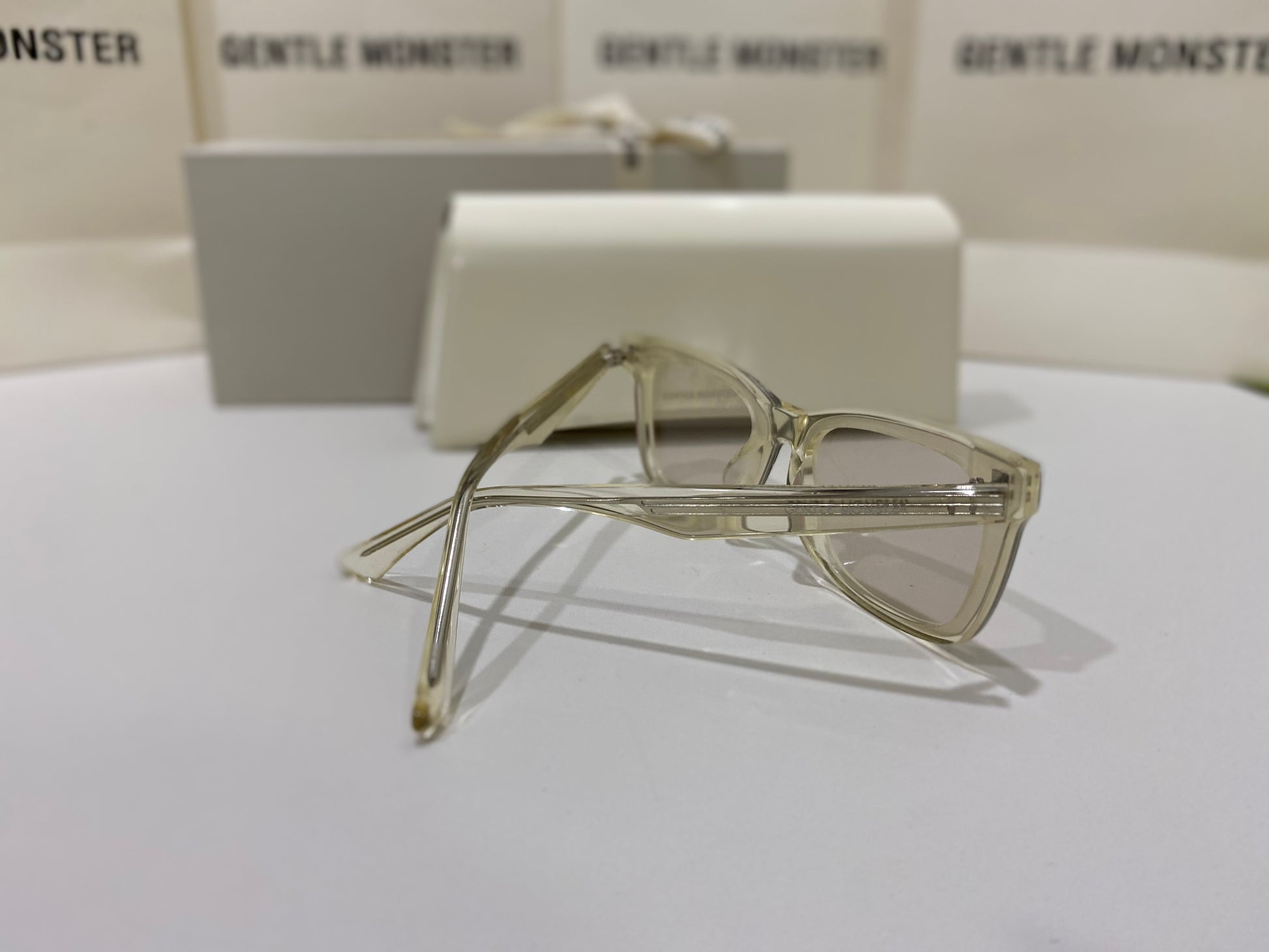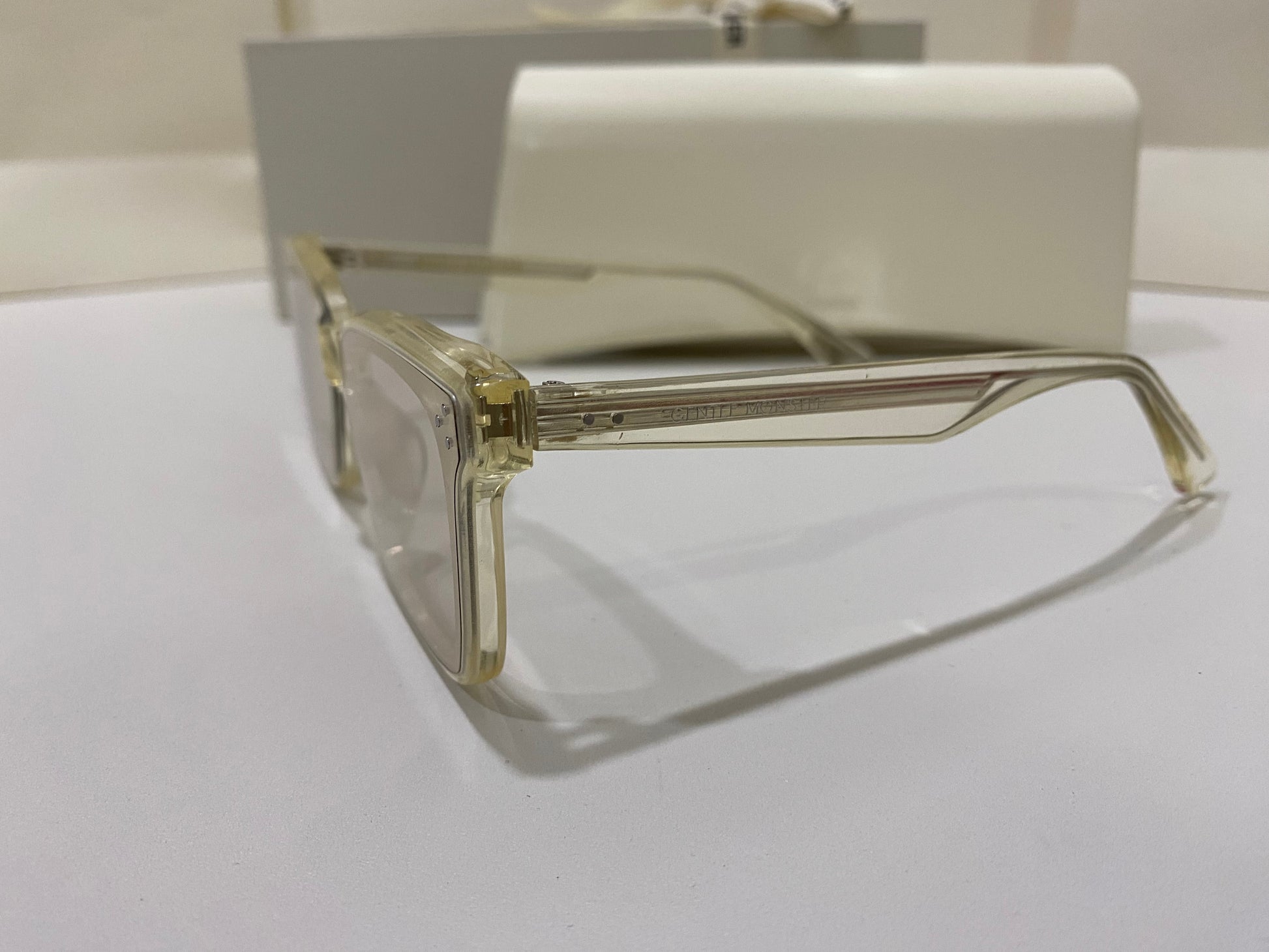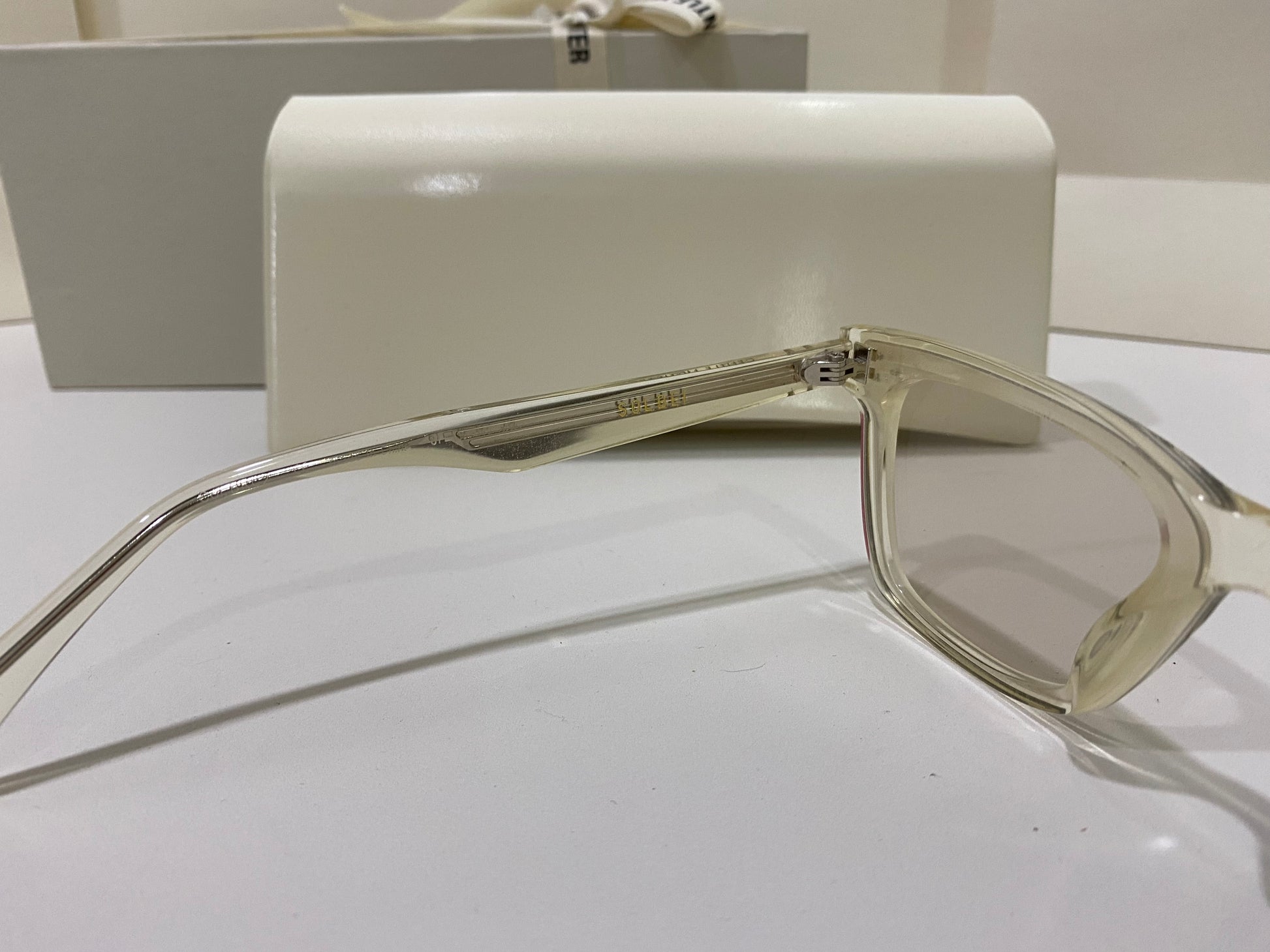 Solbei BRC2 is a beige cat-eye Flatba frame with a barely-there slope over the lenses and frame front to create a sophisticated design. This style is accentuated with three circular silver pins on each of the 99.9% UV protected beige lenses and engraved Gentle Monster logos in silver on the temples.