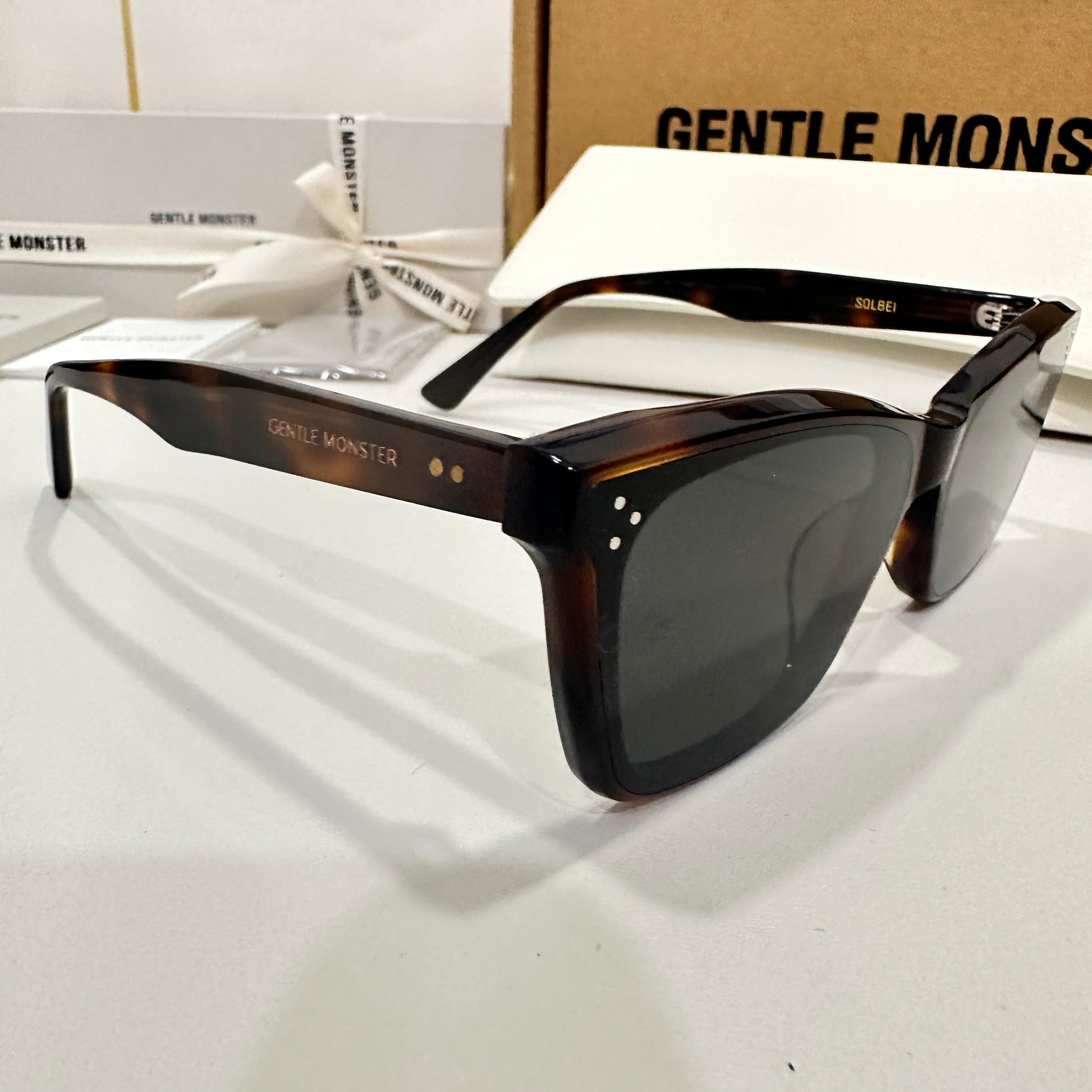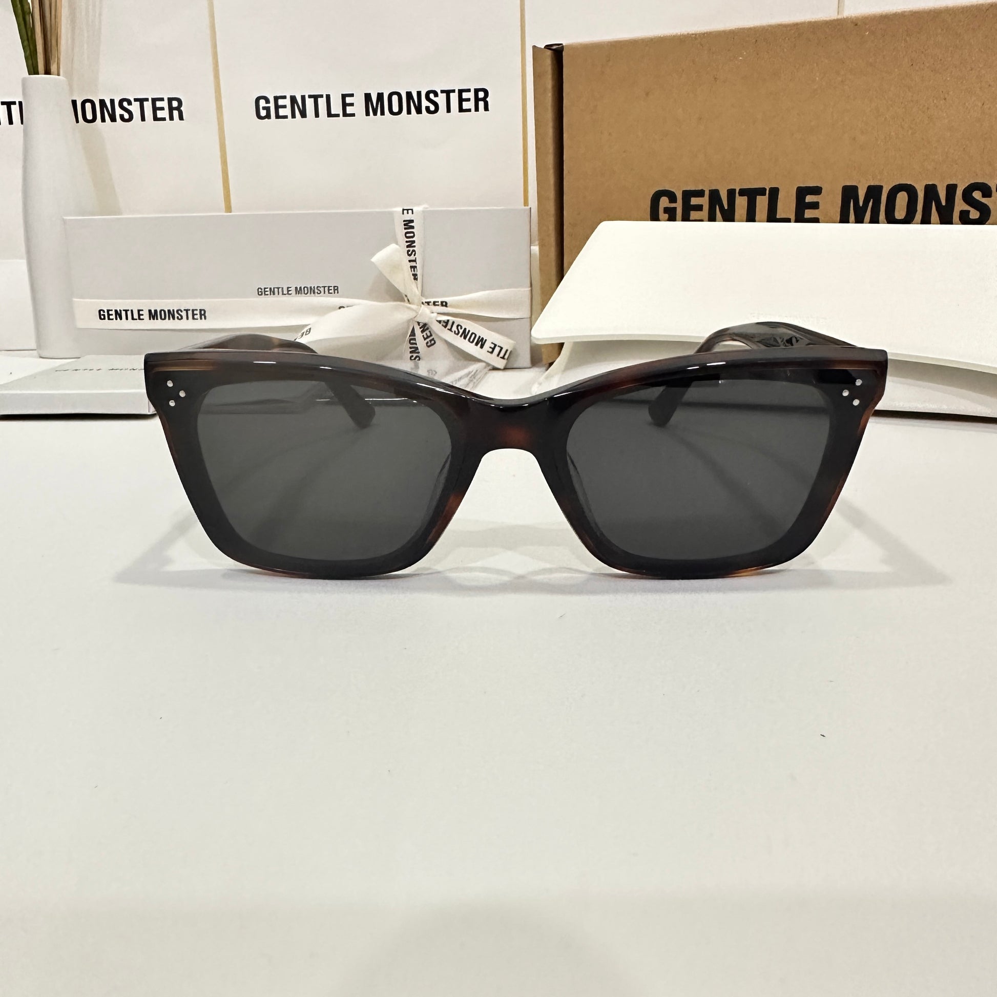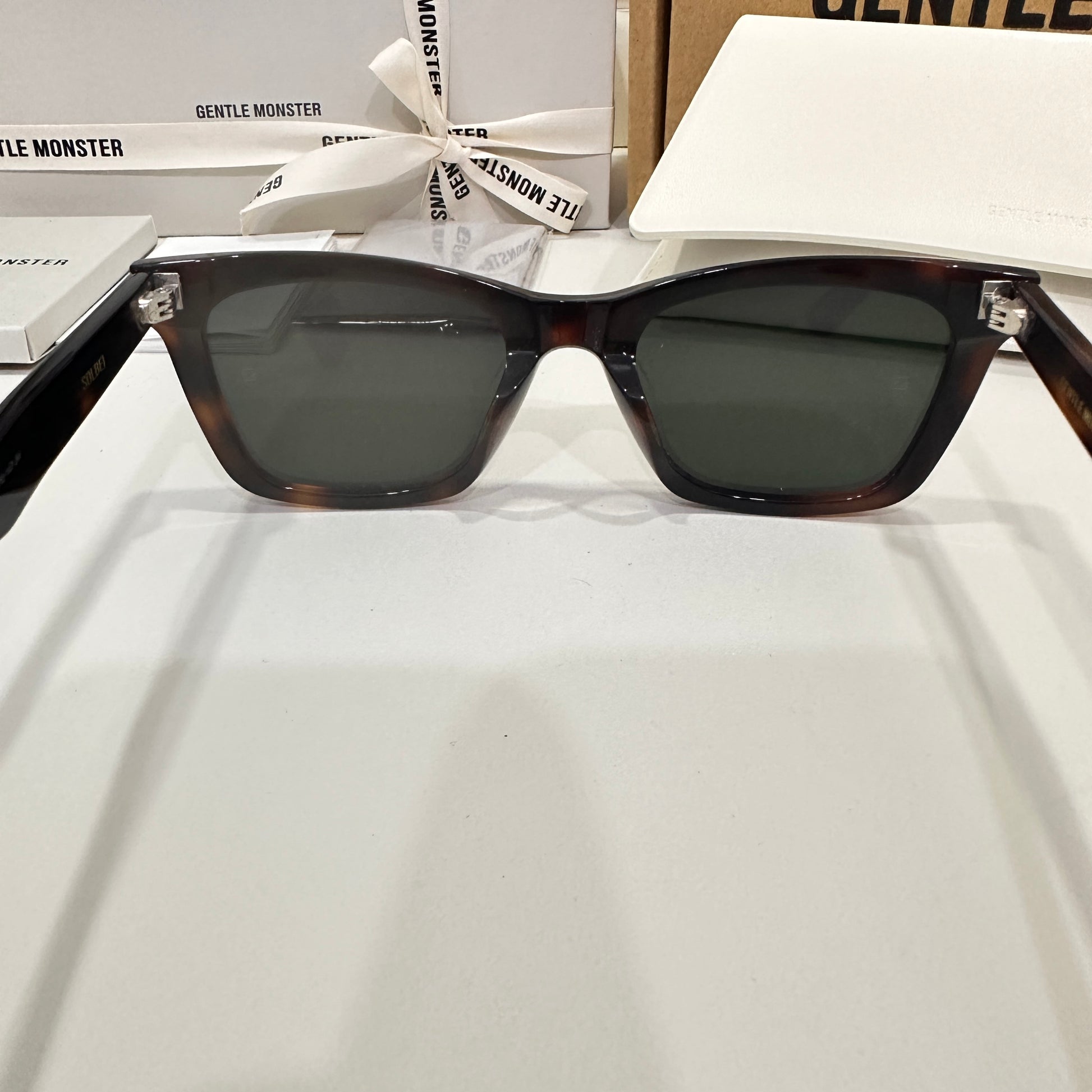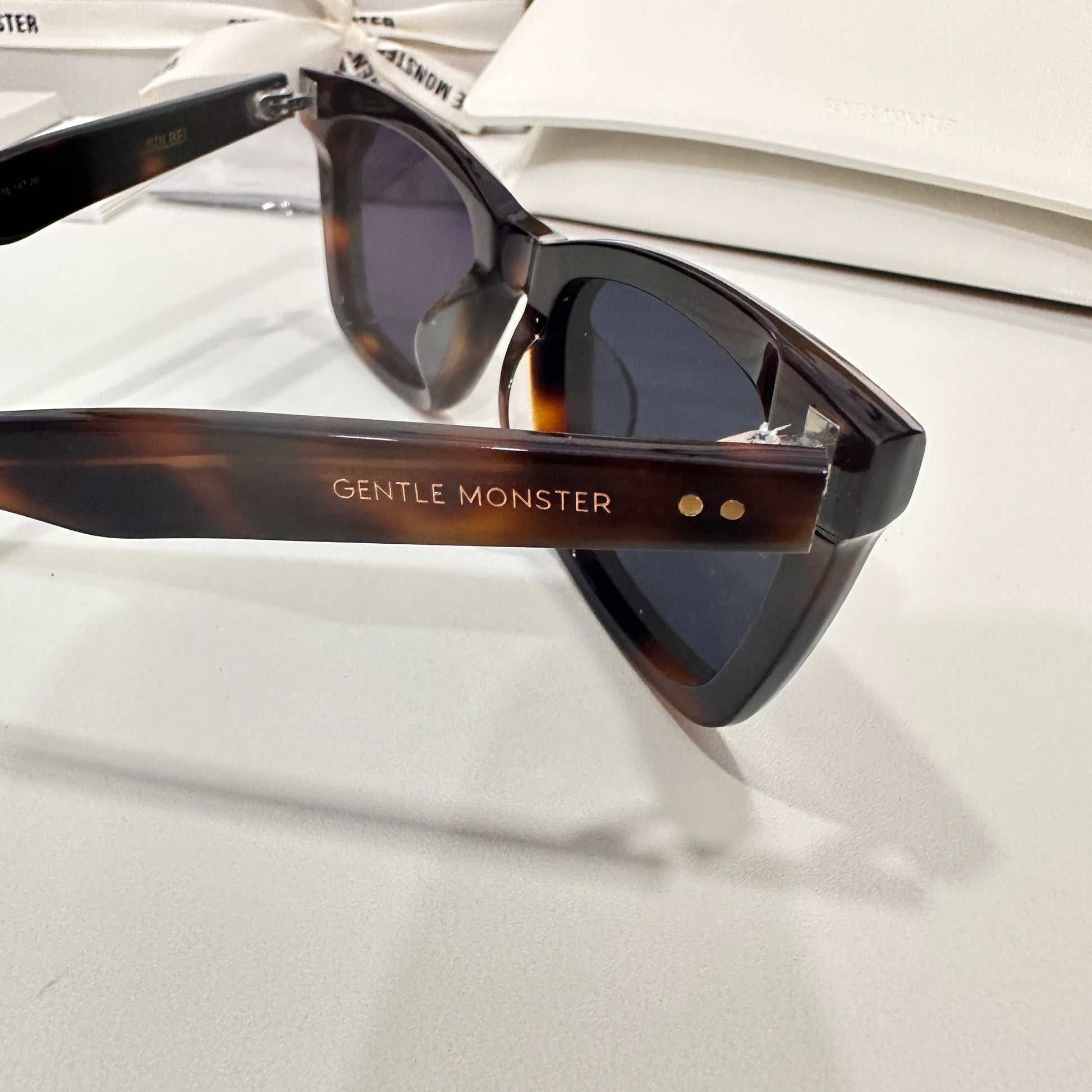 Solbei L2 is a brown tortoise cat-eye Flatba frame with a barely-there slope over the lenses and frame front to create a sophisticated design. This style is accentuated with three circular silver pins on each of the 99.9% UV protected black lenses and engraved Gentle Monster logos in silver on the temples. The pattern for each product will vary due to the nature of the acetate production.