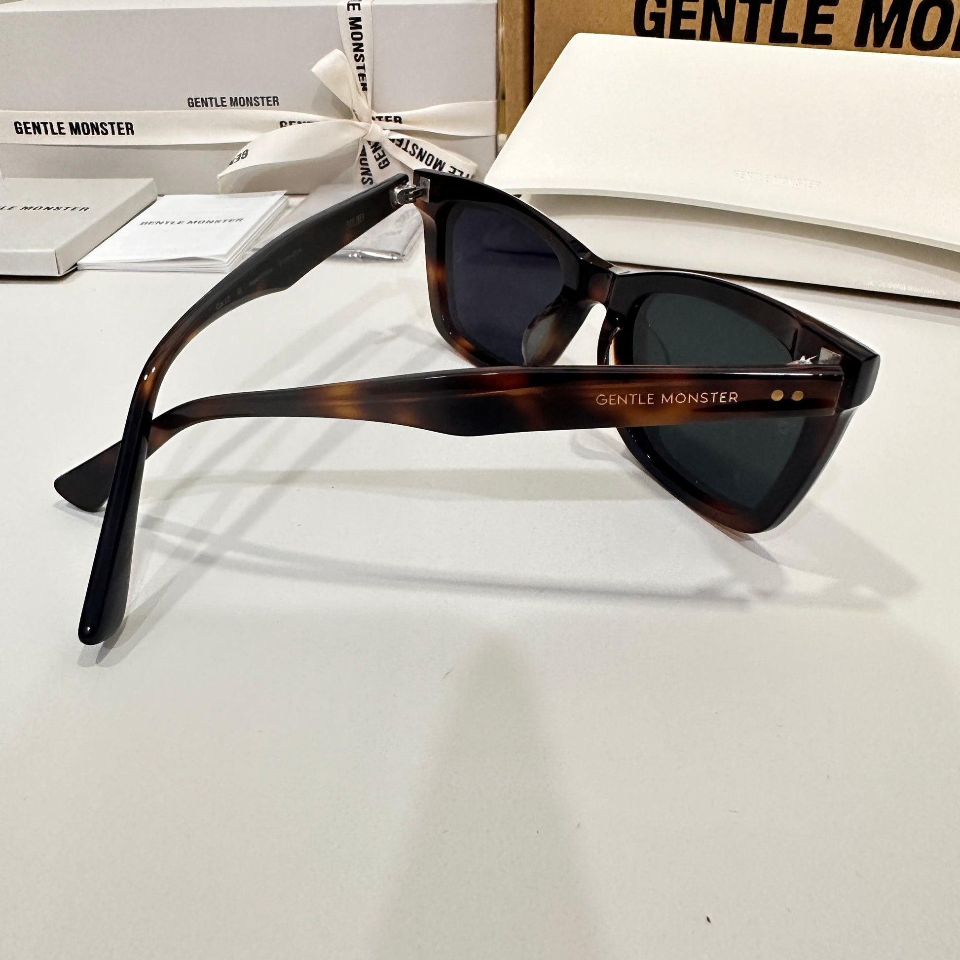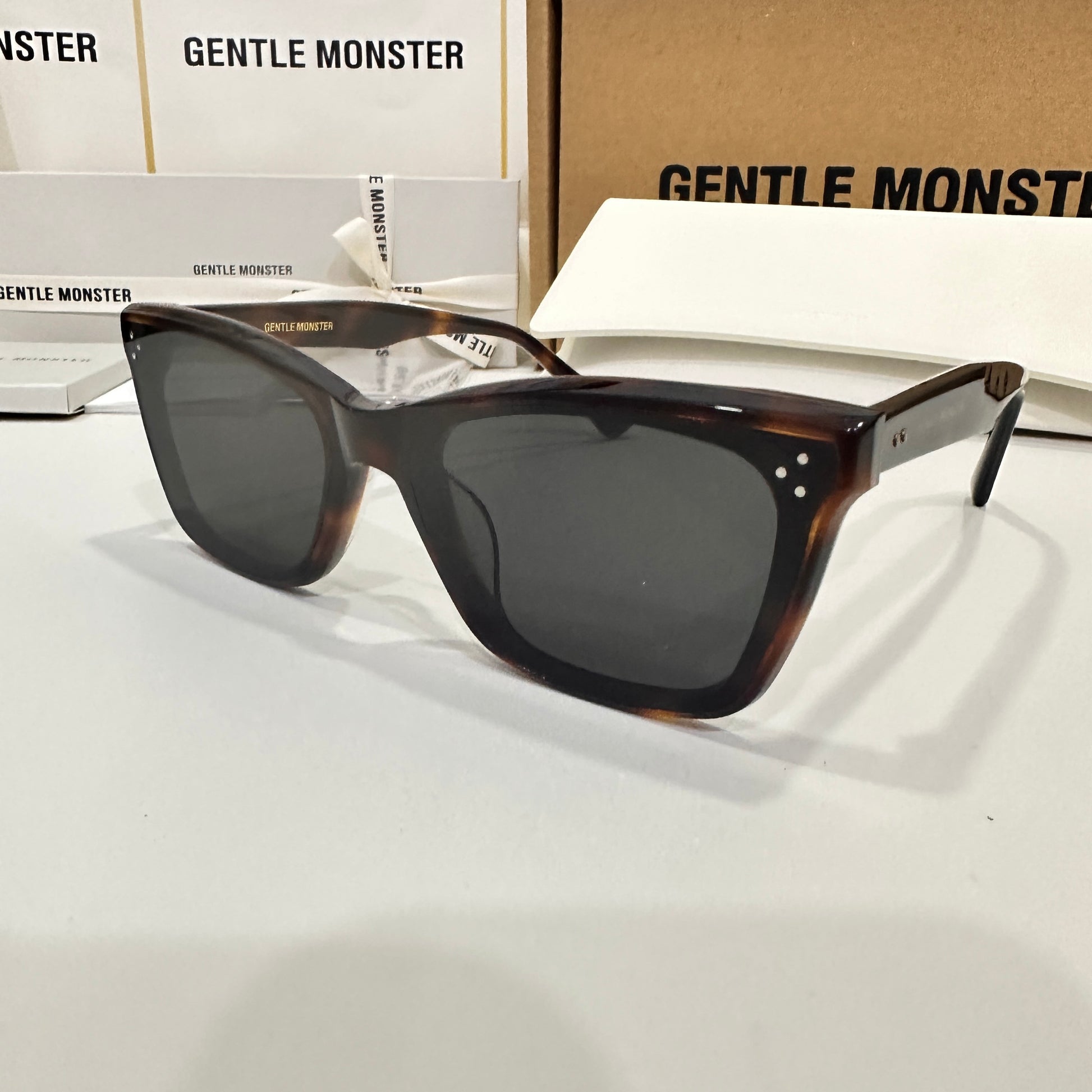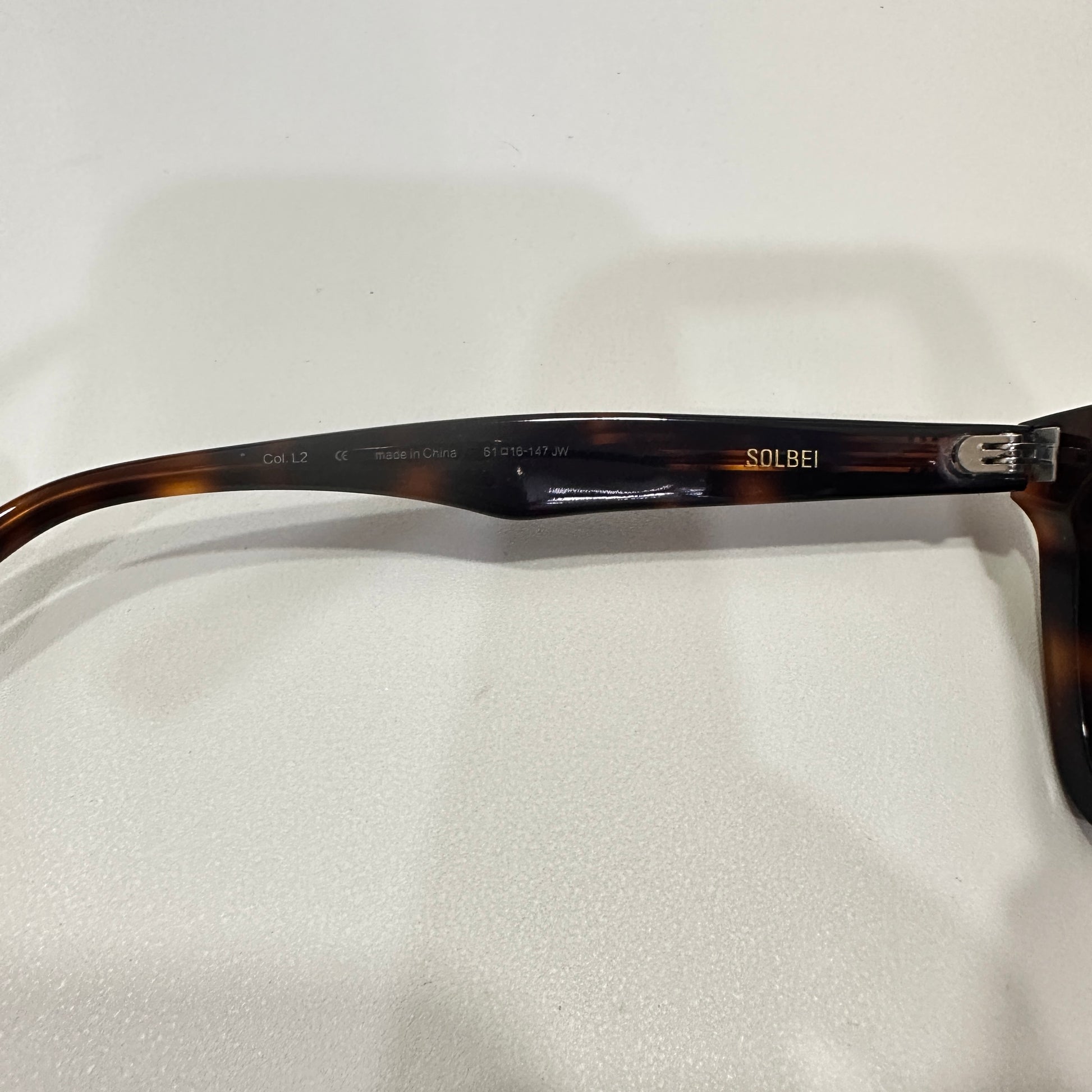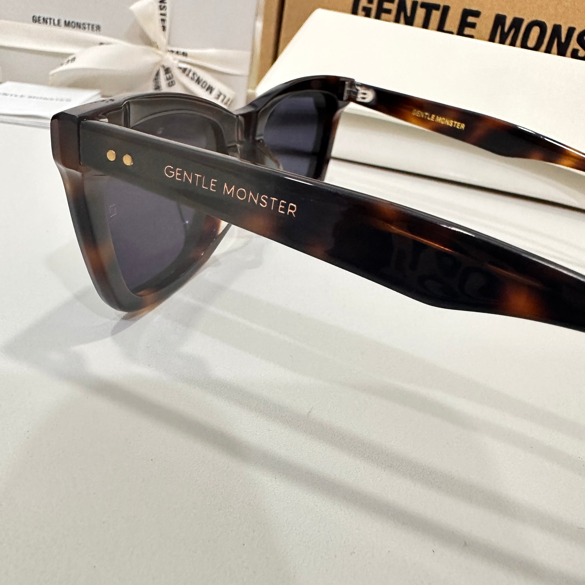 Solbei L2 is a brown tortoise cat-eye Flatba frame with a barely-there slope over the lenses and frame front to create a sophisticated design. This style is accentuated with three circular silver pins on each of the 99.9% UV protected black lenses and engraved Gentle Monster logos in silver on the temples. The pattern for each product will vary due to the nature of the acetate production.