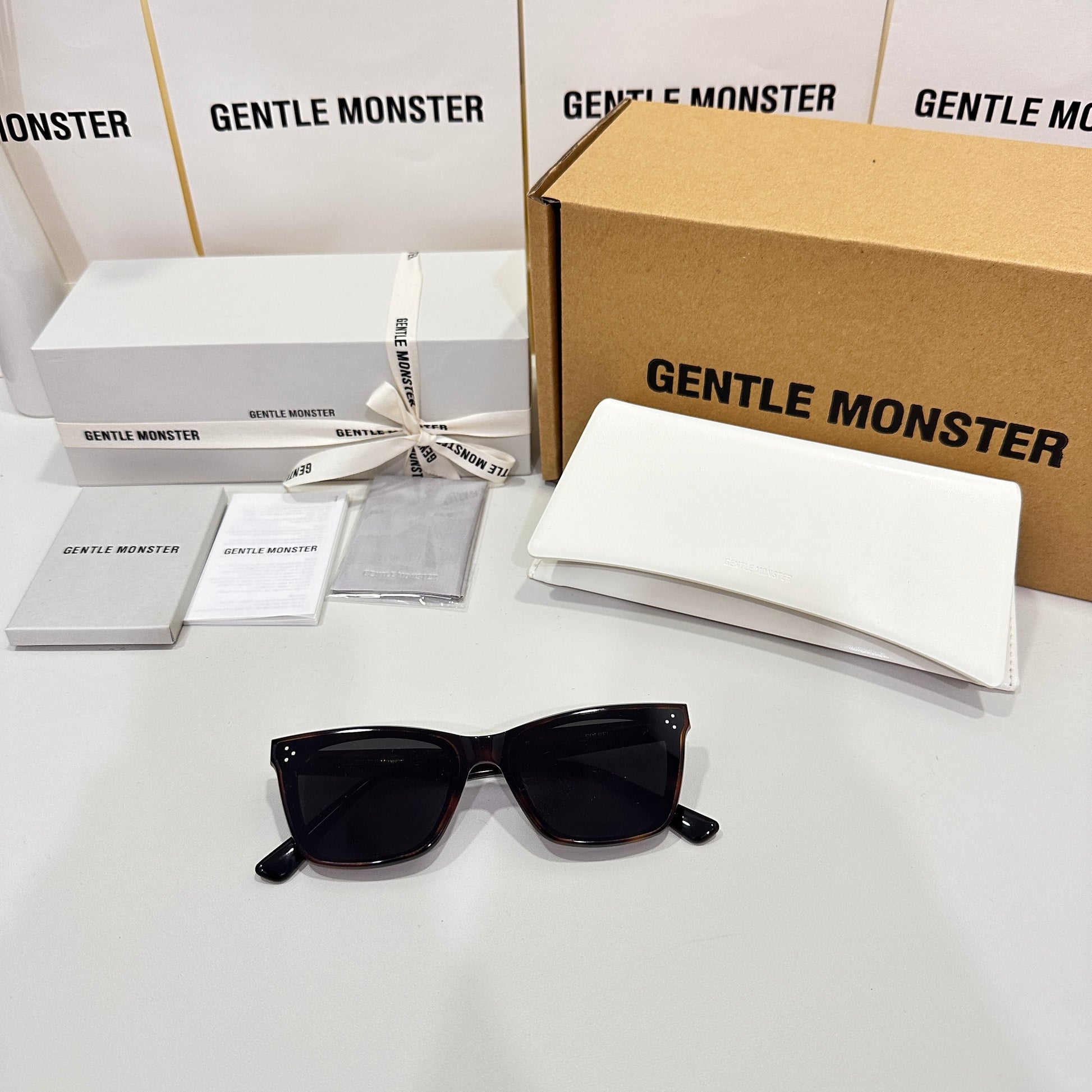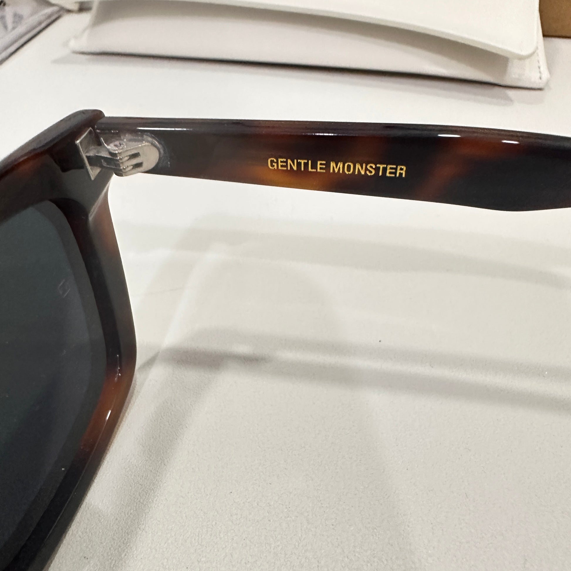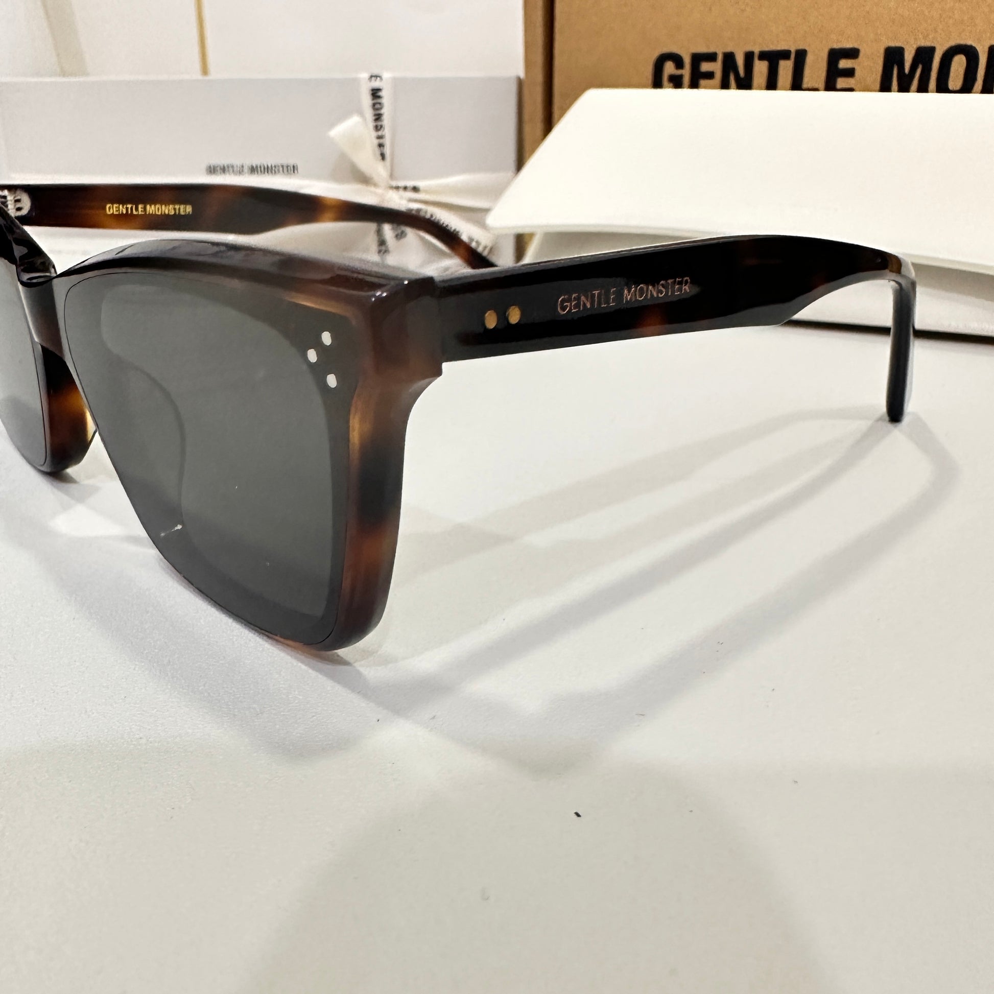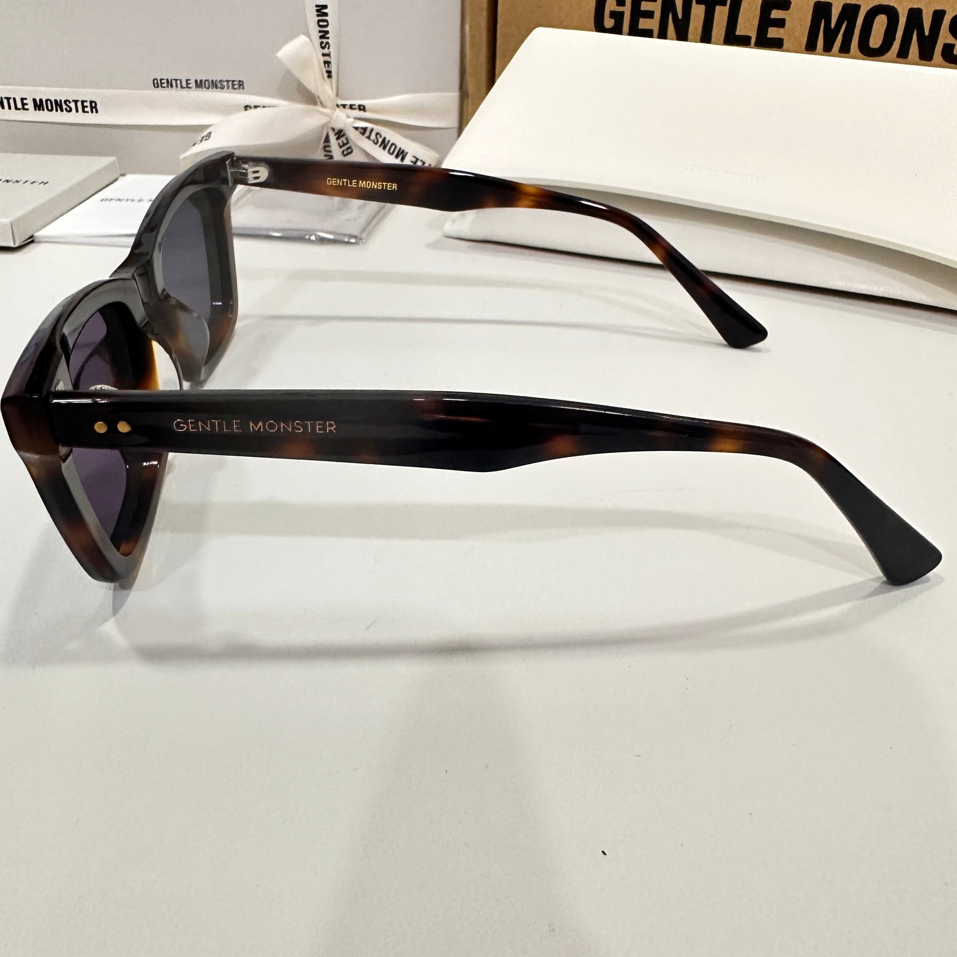 Solbei L2 is a brown tortoise cat-eye Flatba frame with a barely-there slope over the lenses and frame front to create a sophisticated design. This style is accentuated with three circular silver pins on each of the 99.9% UV protected black lenses and engraved Gentle Monster logos in silver on the temples. The pattern for each product will vary due to the nature of the acetate production.