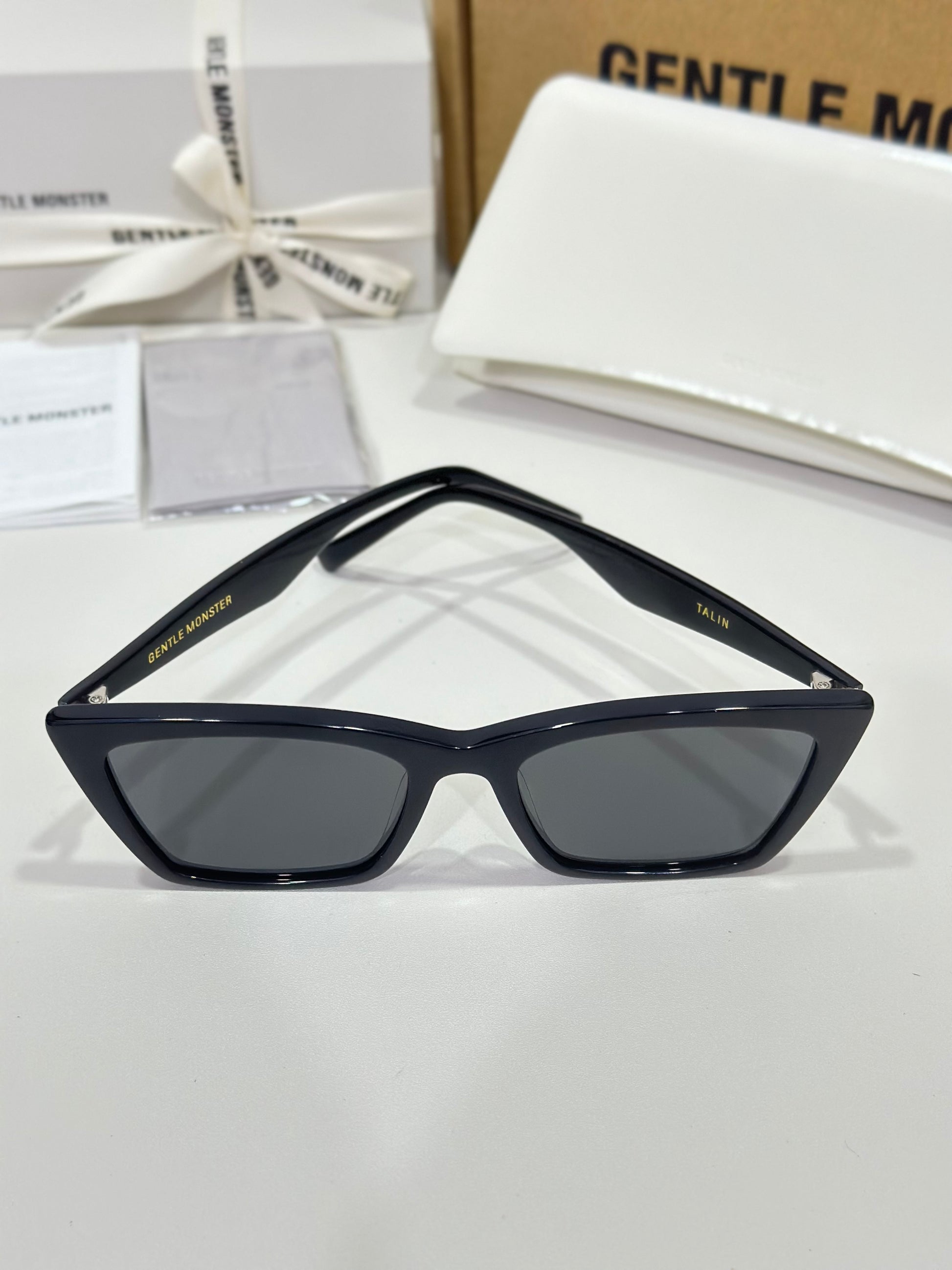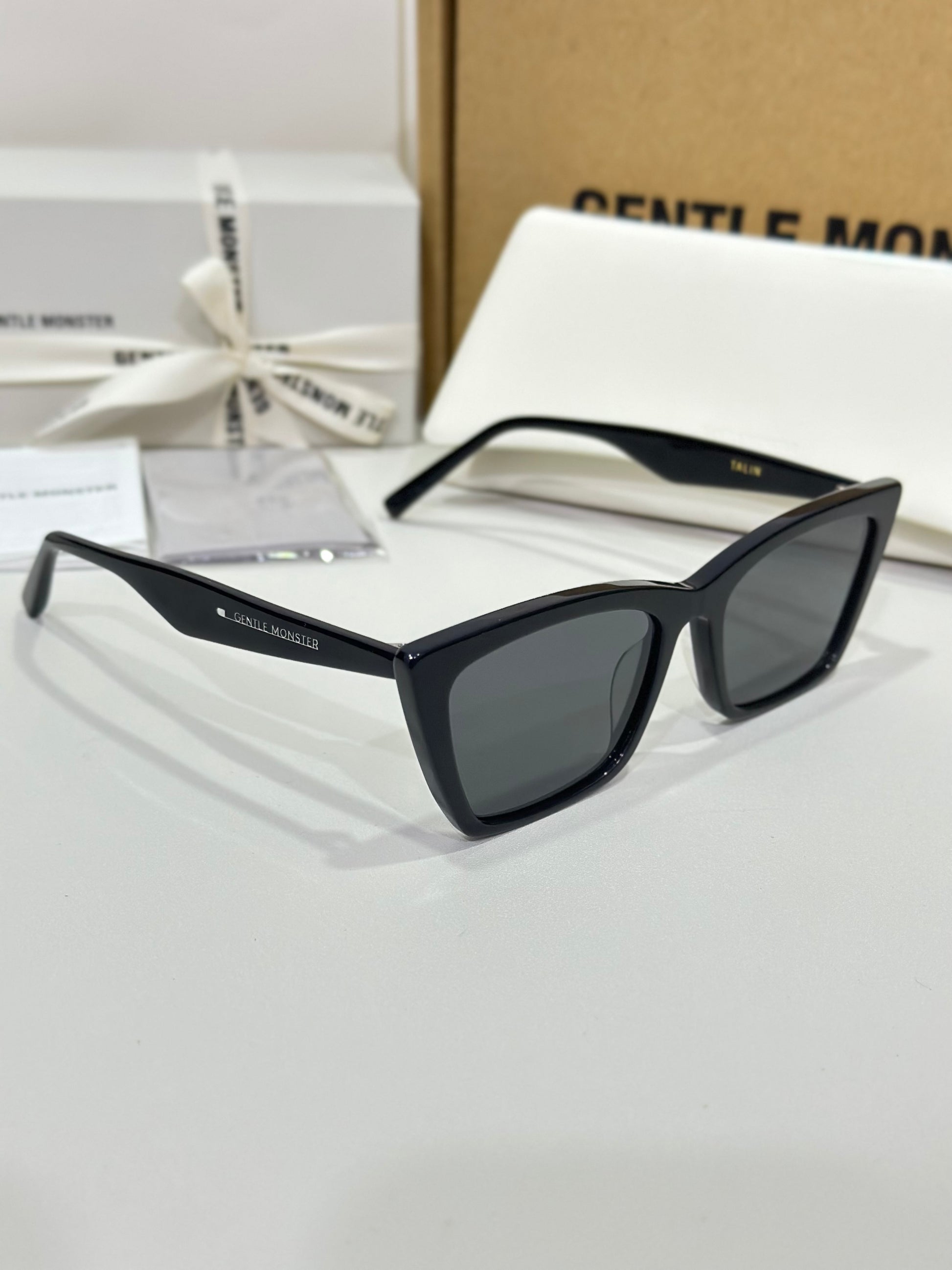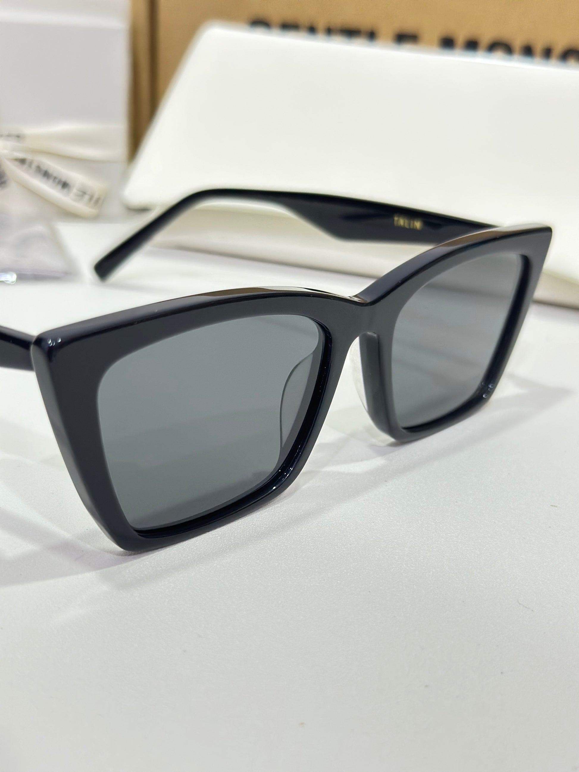 Talin 01 is a black acetate cat-eye frame with voluminous temples. This frame front features contrasting lines and curves, boldly angled corners, and fitted with 99.9% UV protected black lenses.