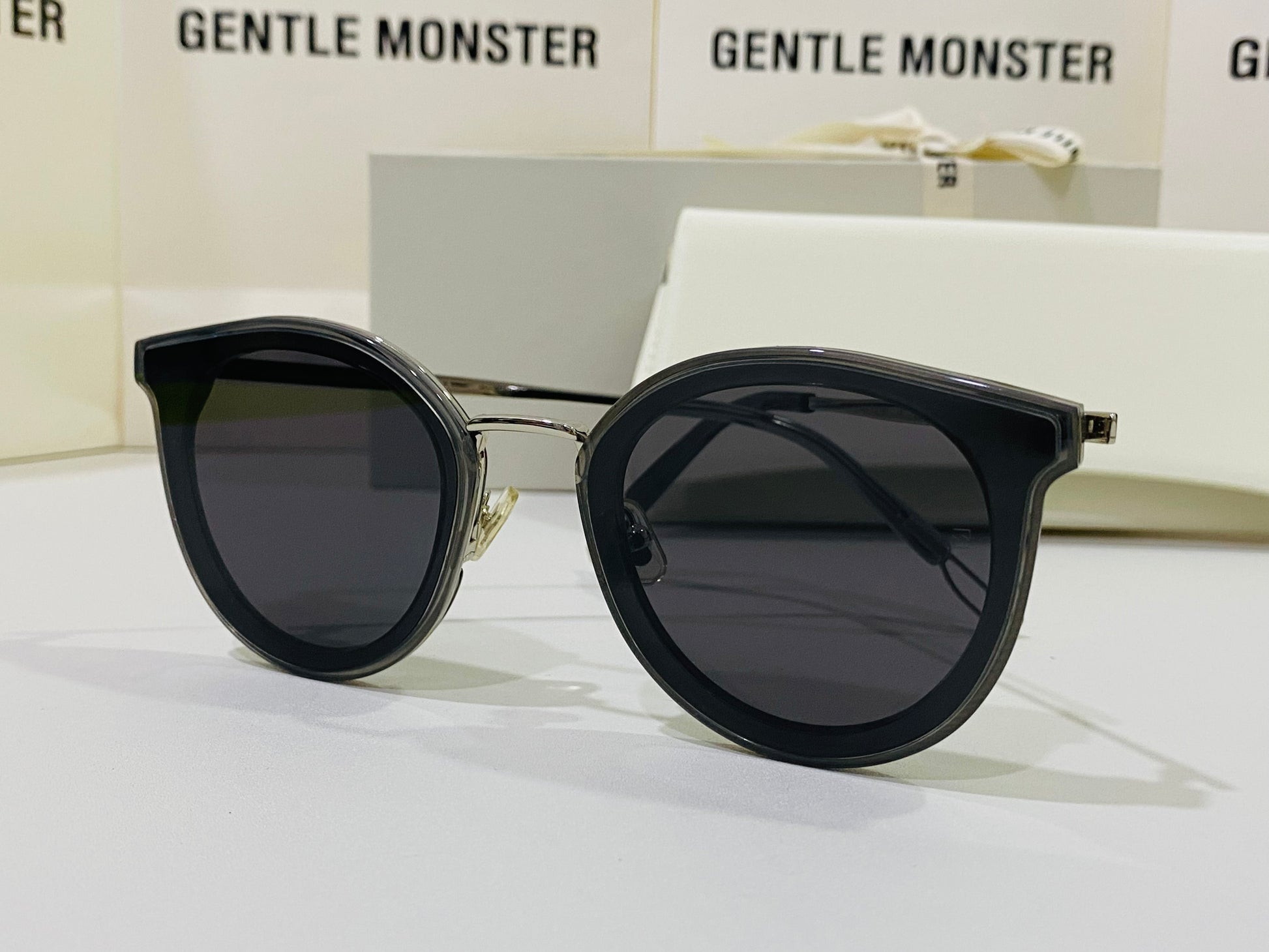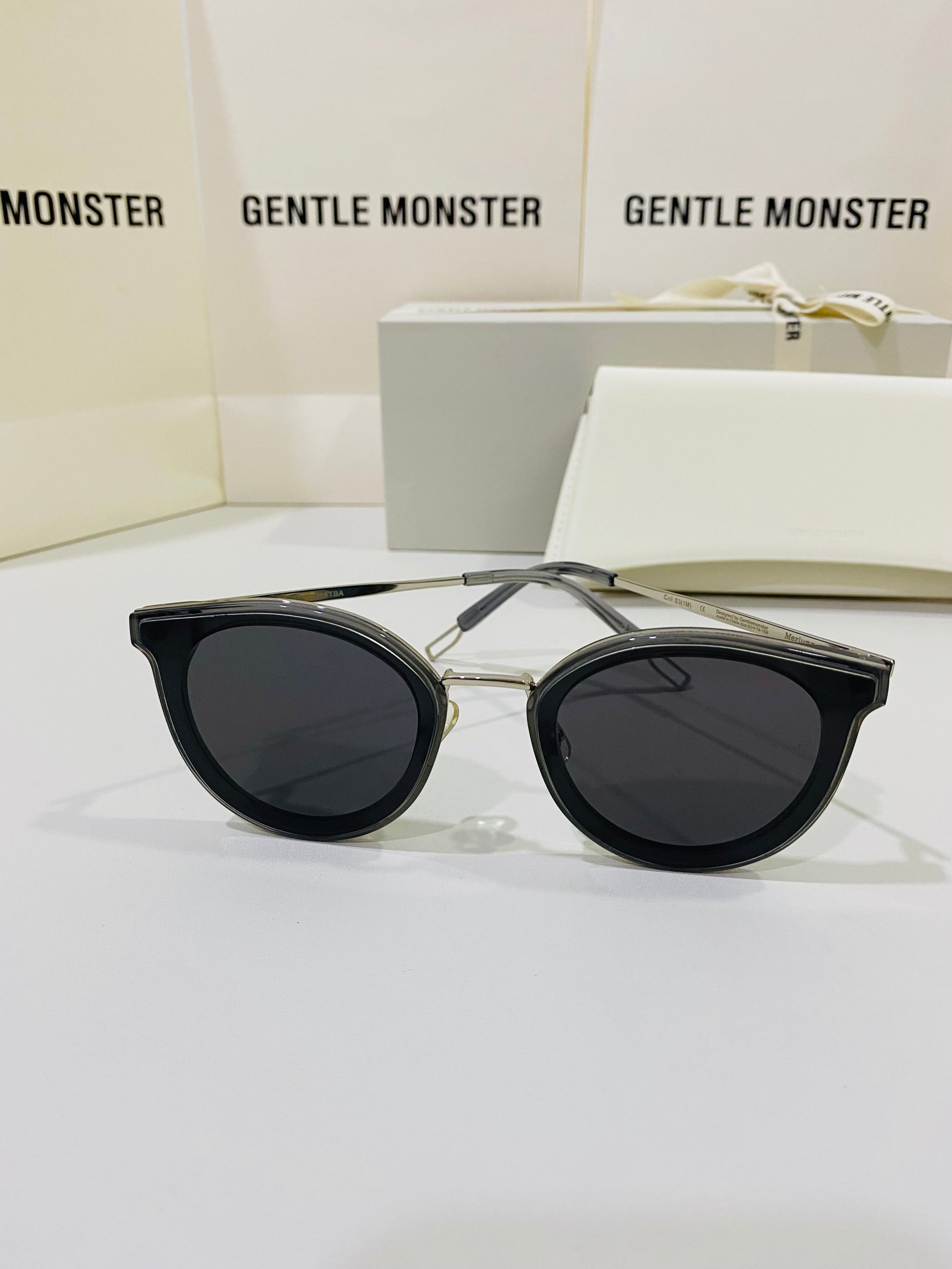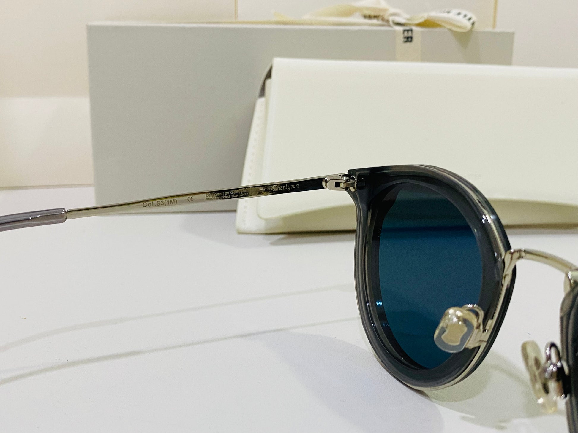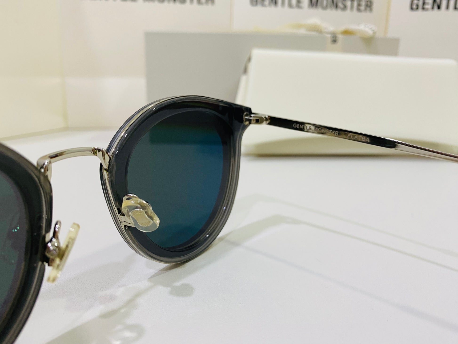 The Merlynn G1 reimagines aspects of our past styles, while falling in line with our FLATBA structural design. This style is composed of a clear gray acetate front and a silver metal nose-bridge with adjustable PVC nose pads. The frame is finished with metal cut-out details at the temple tips and flat black Zeiss lenses with 100% UV Protection.