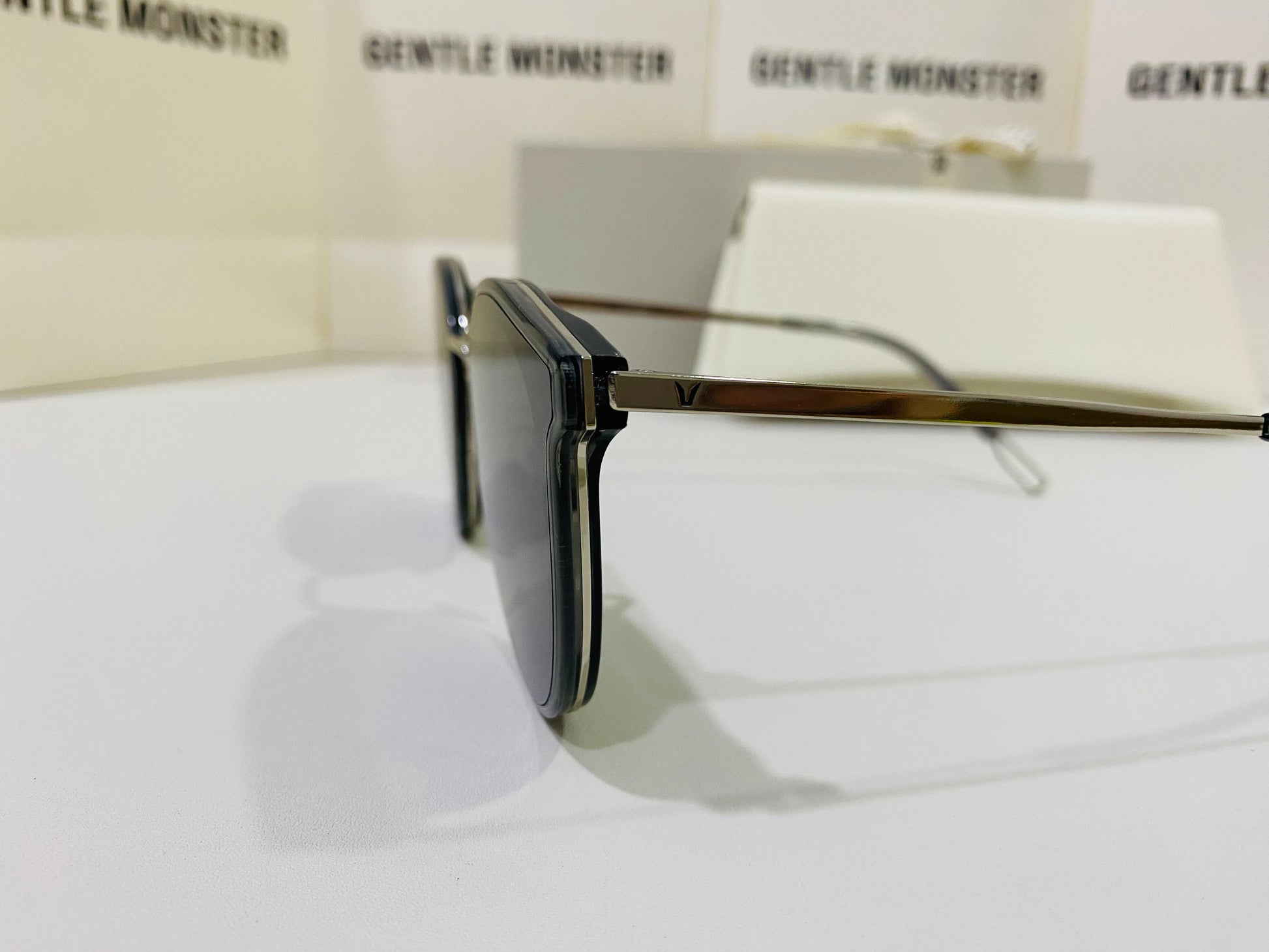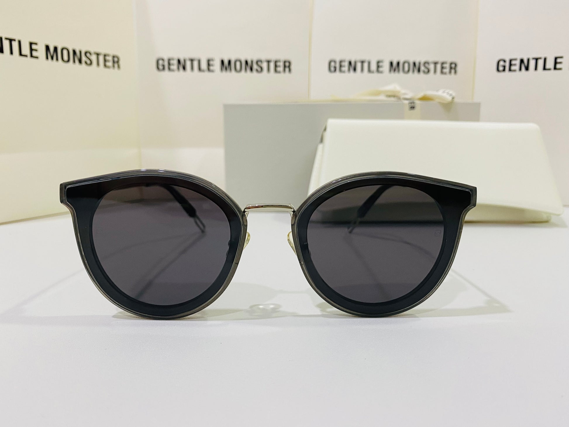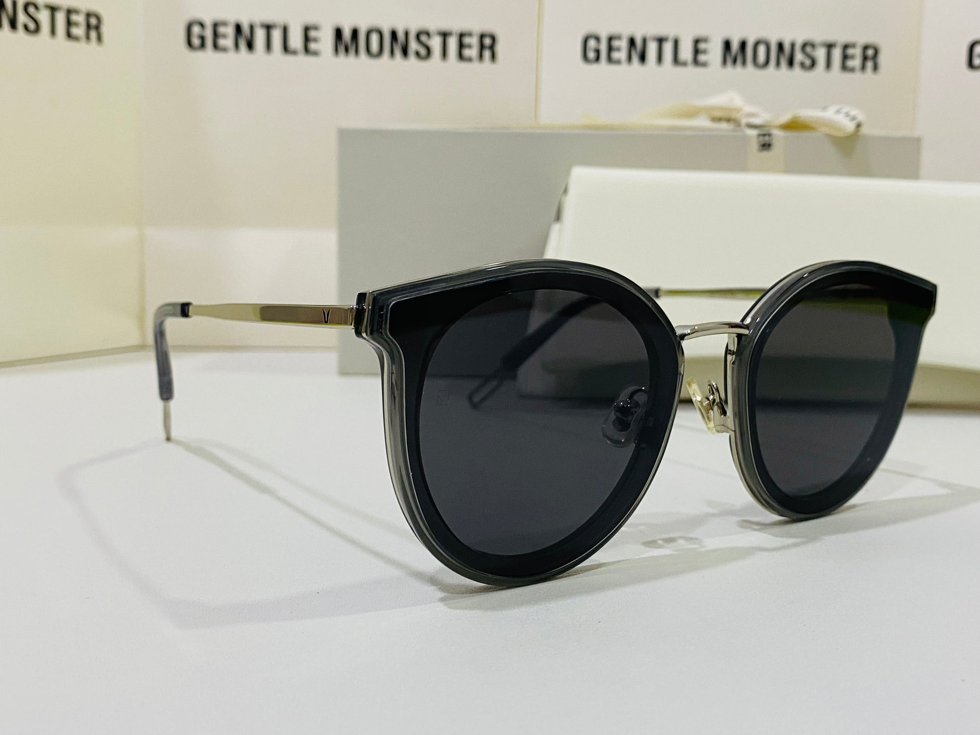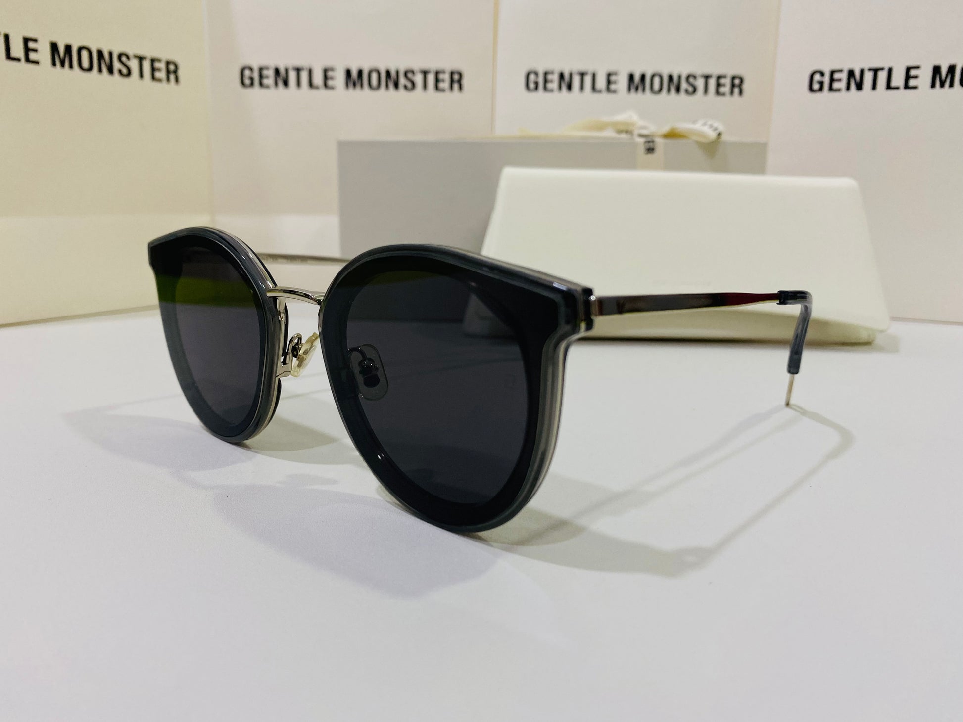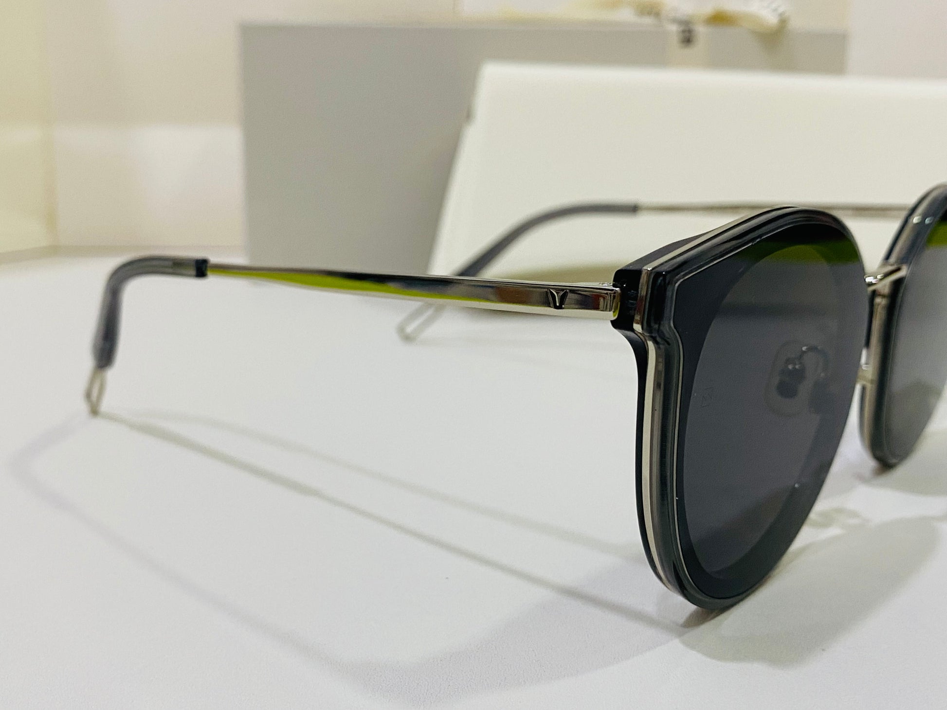 The Merlynn G1 reimagines aspects of our past styles, while falling in line with our FLATBA structural design. This style is composed of a clear gray acetate front and a silver metal nose-bridge with adjustable PVC nose pads. The frame is finished with metal cut-out details at the temple tips and flat black Zeiss lenses with 100% UV Protection.