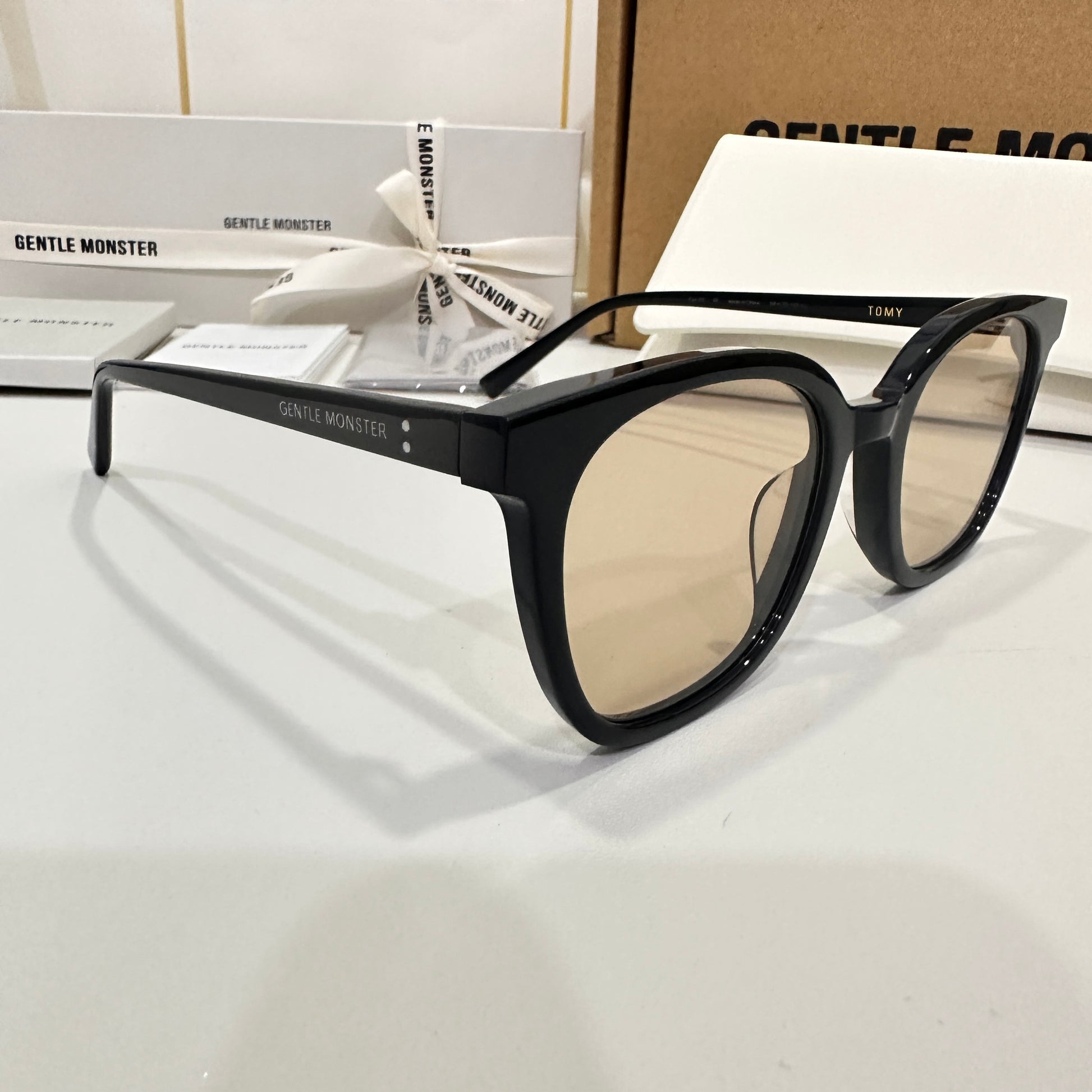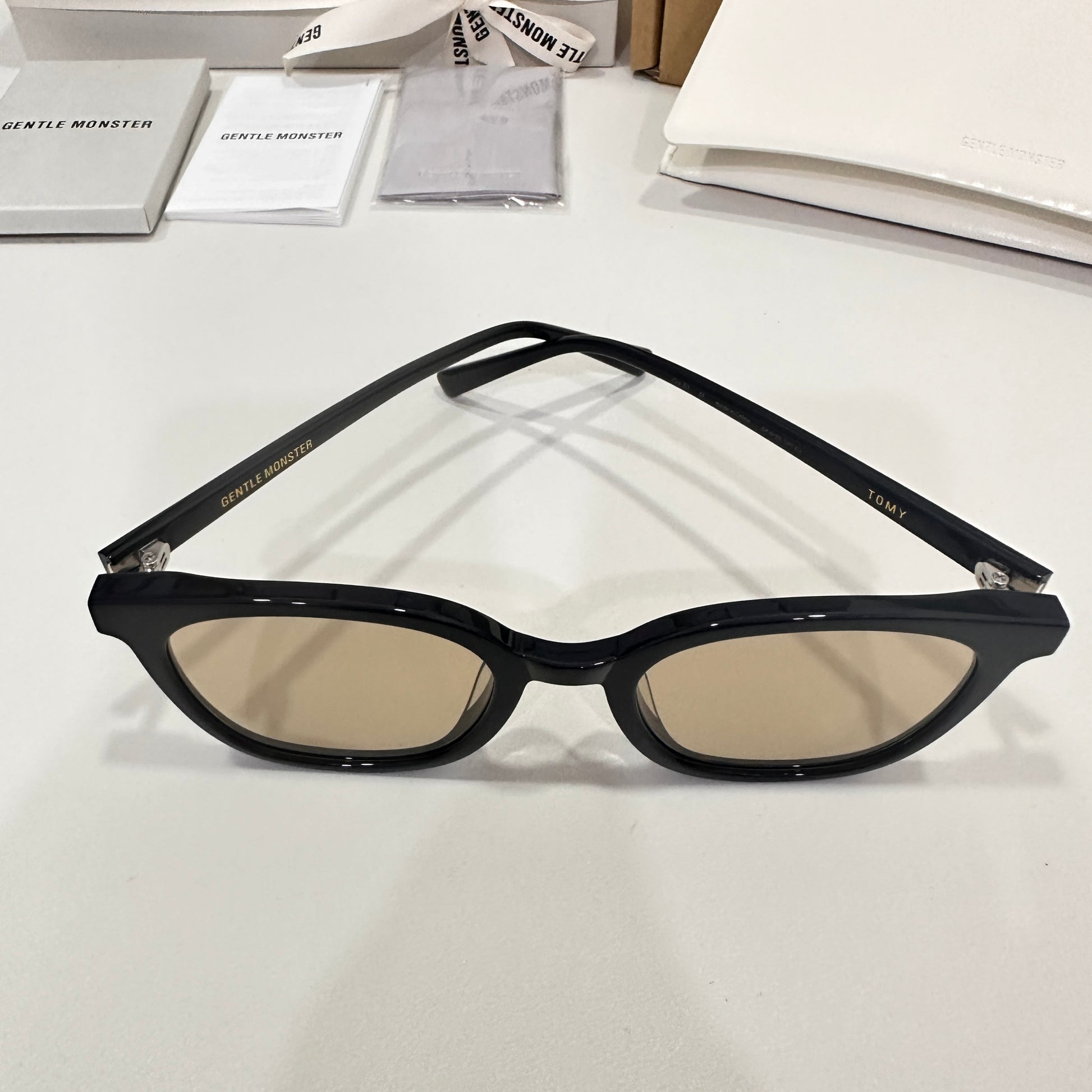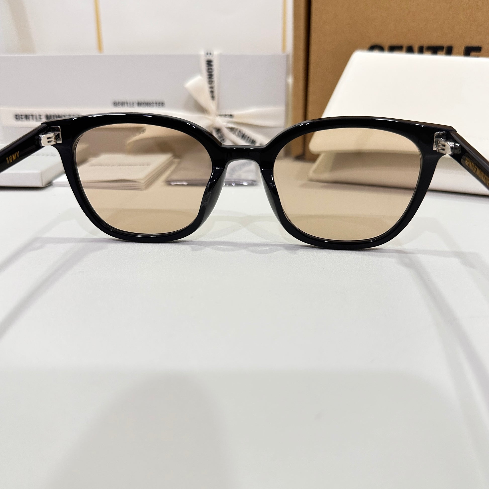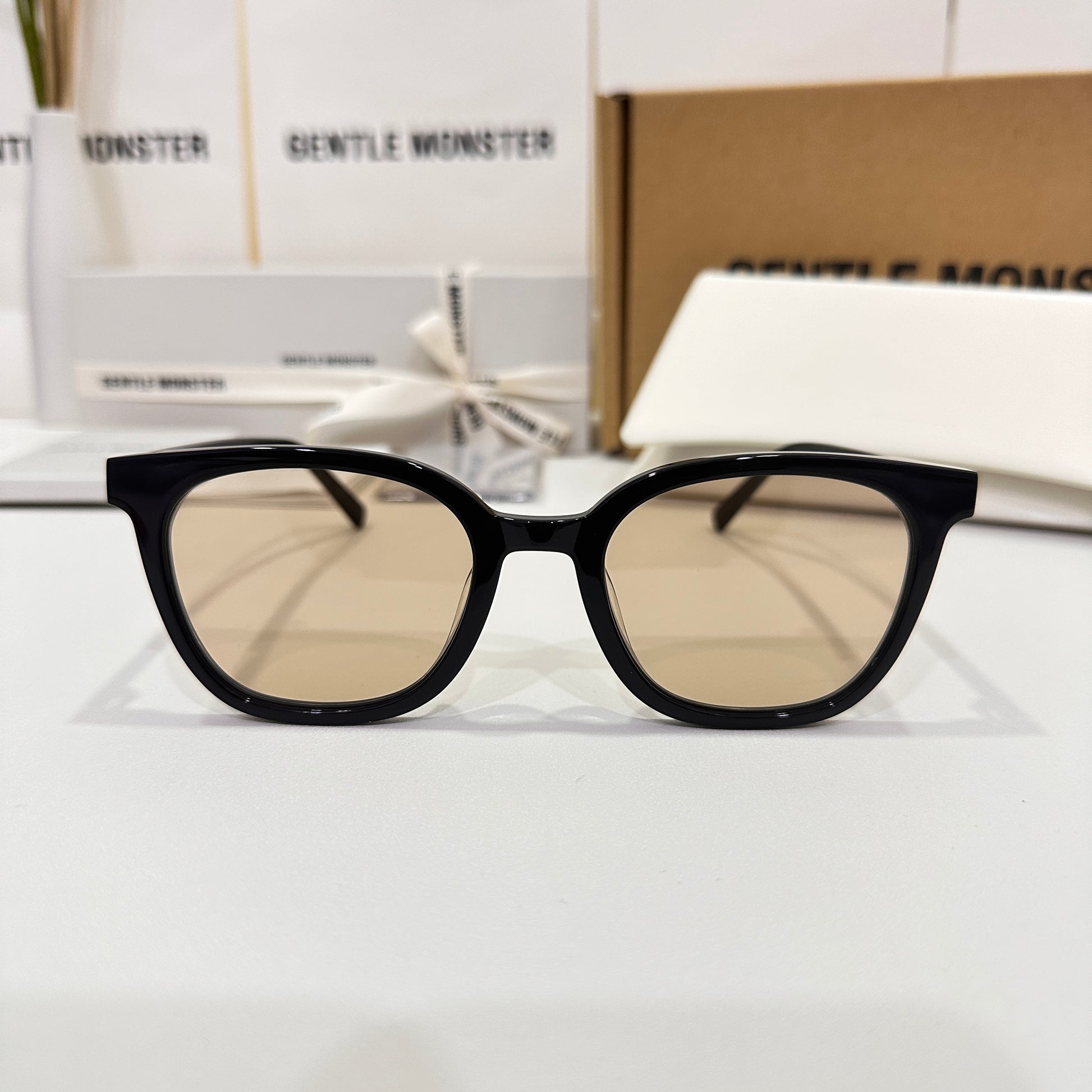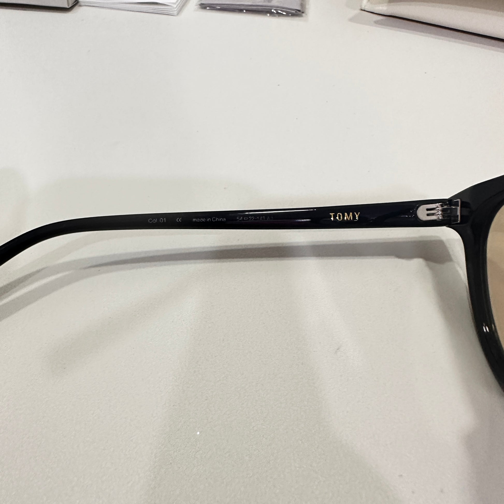 Tomy 01(BR) is a black square acetate frame with 99.9% UV protected brown lenses. The rounded edges of the slim silhouetted frame front and thin temples highlight this frame.