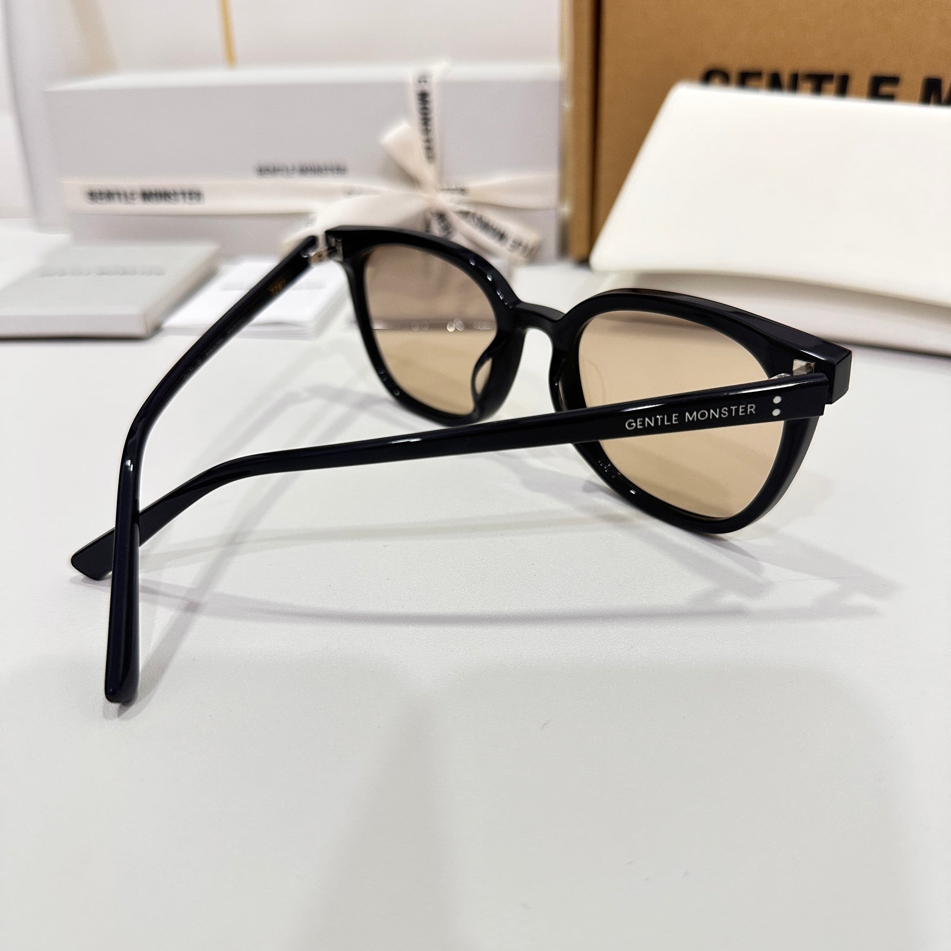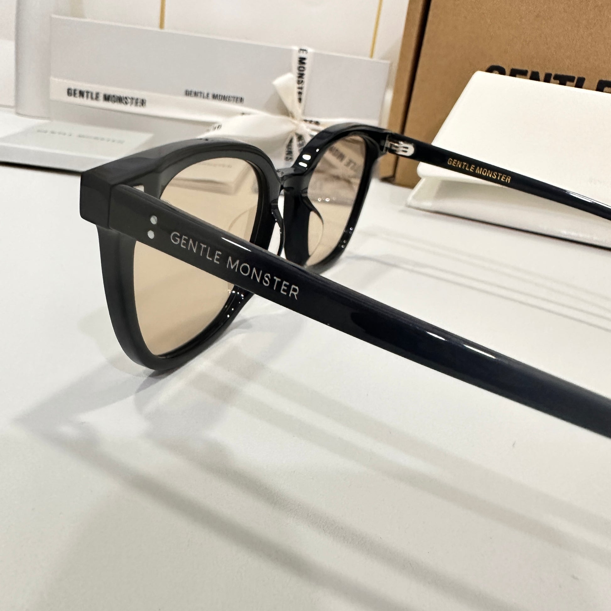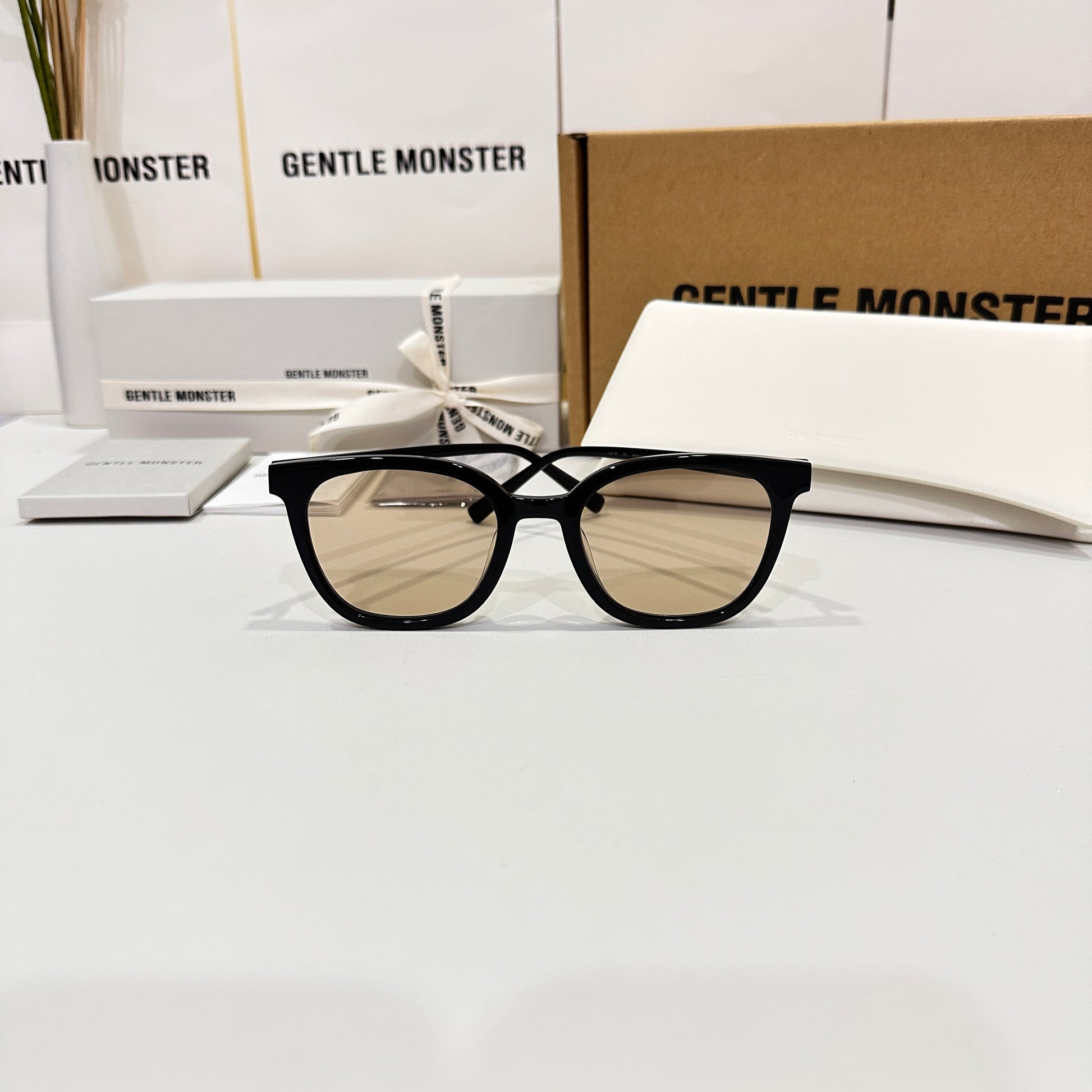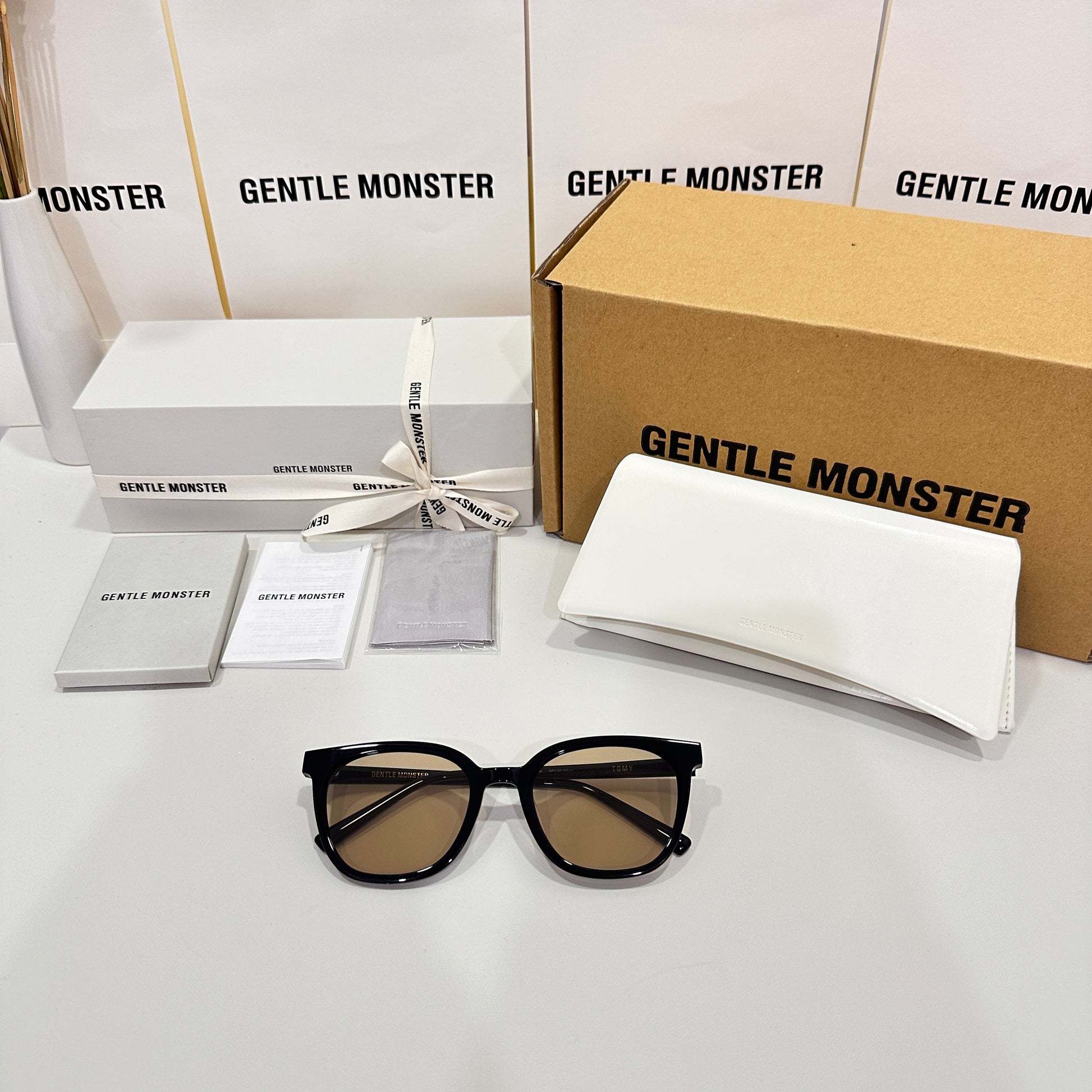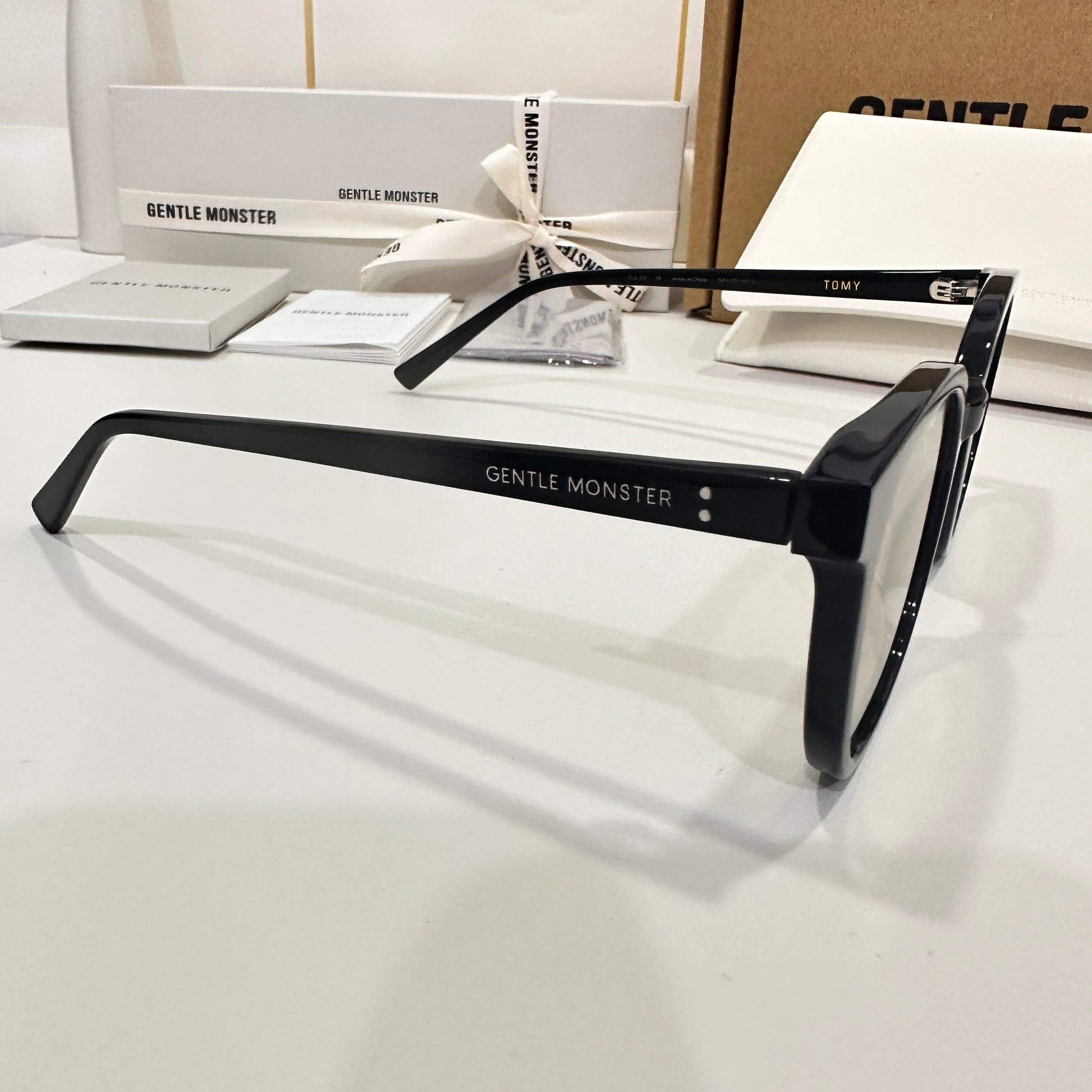 Tomy 01(BR) is a black square acetate frame with 99.9% UV protected brown lenses. The rounded edges of the slim silhouetted frame front and thin temples highlight this frame.