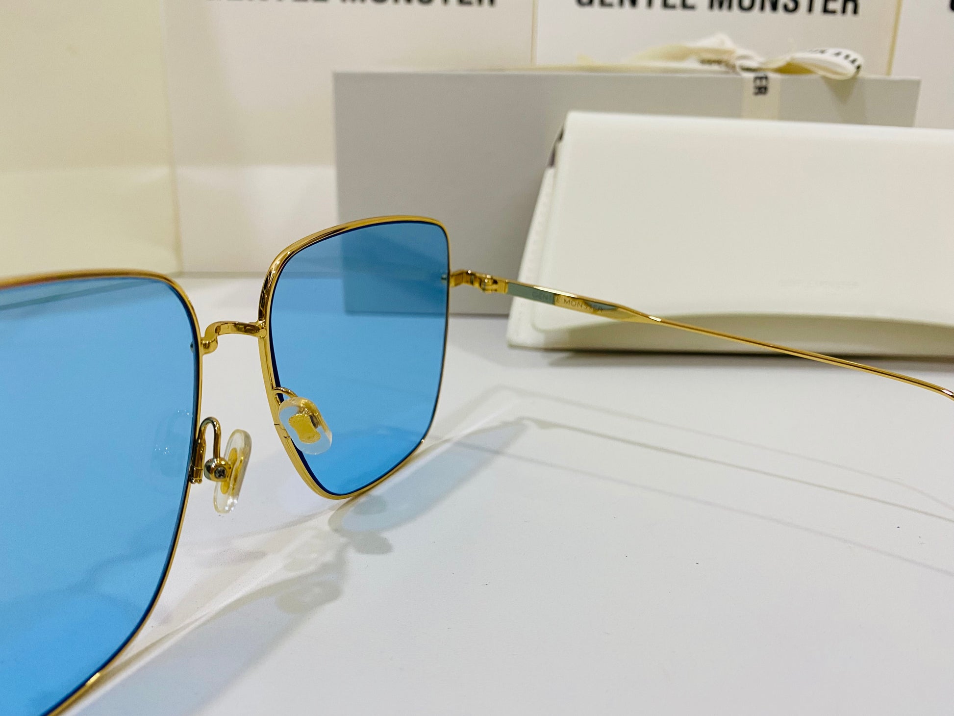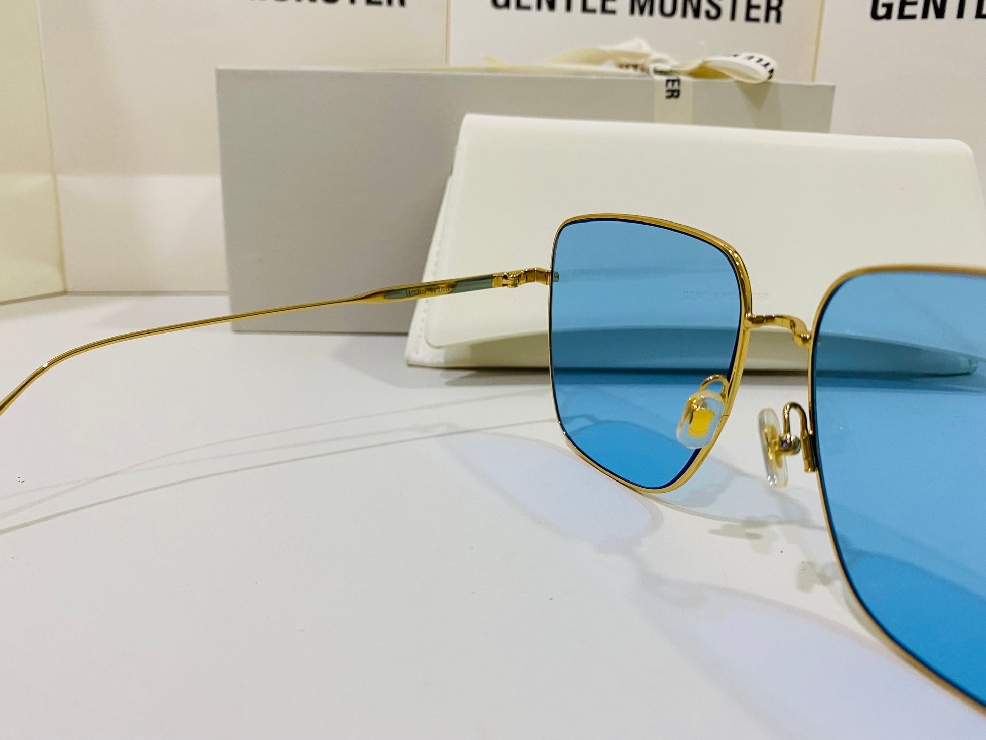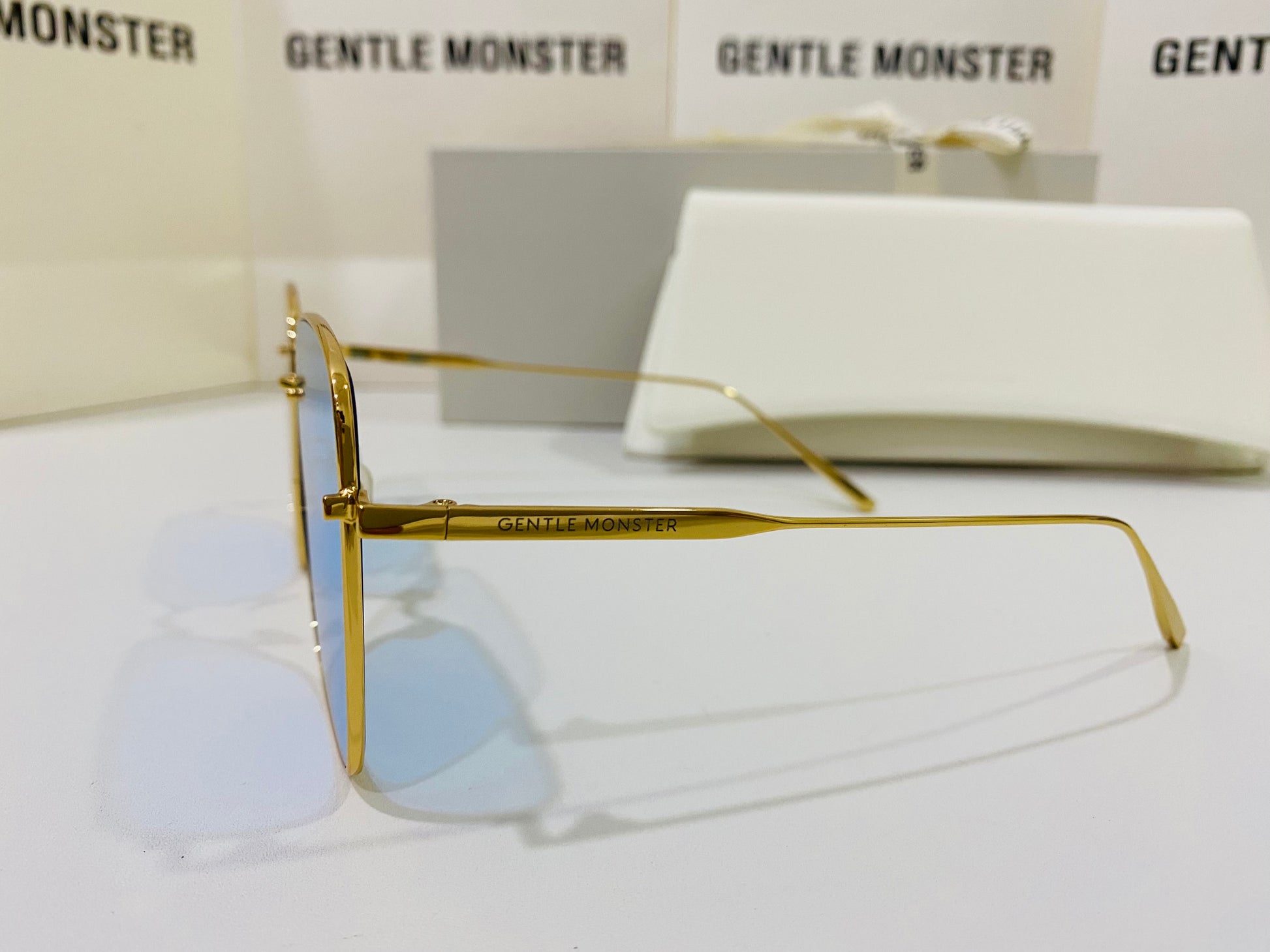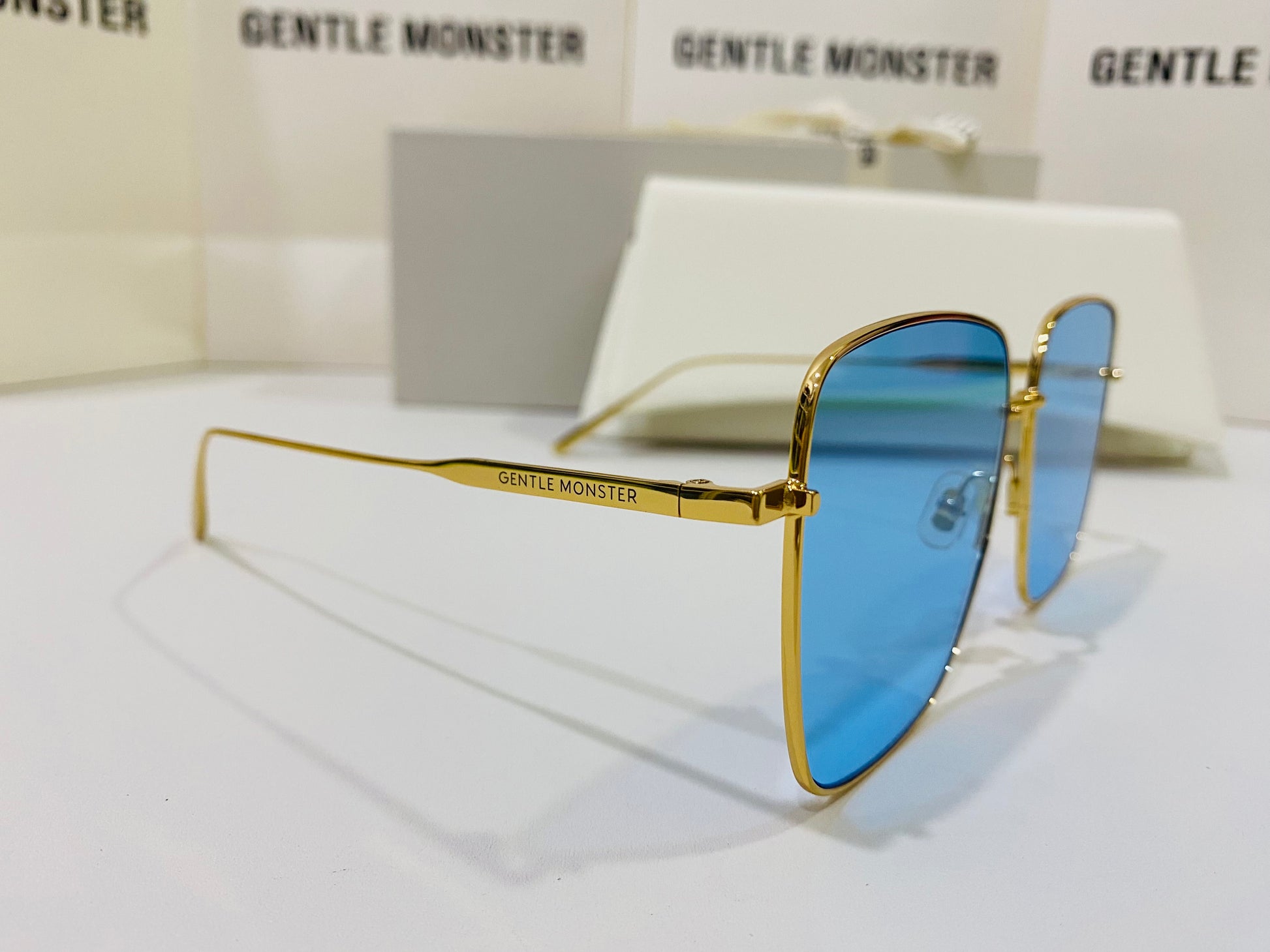 Wind Wind 032 features flat blue lenses in an oversized square metal frame to create a retro silhouette. This frame is complemented with 99.9% UV protected lenses and gold temples engraved with Gentle Monster.