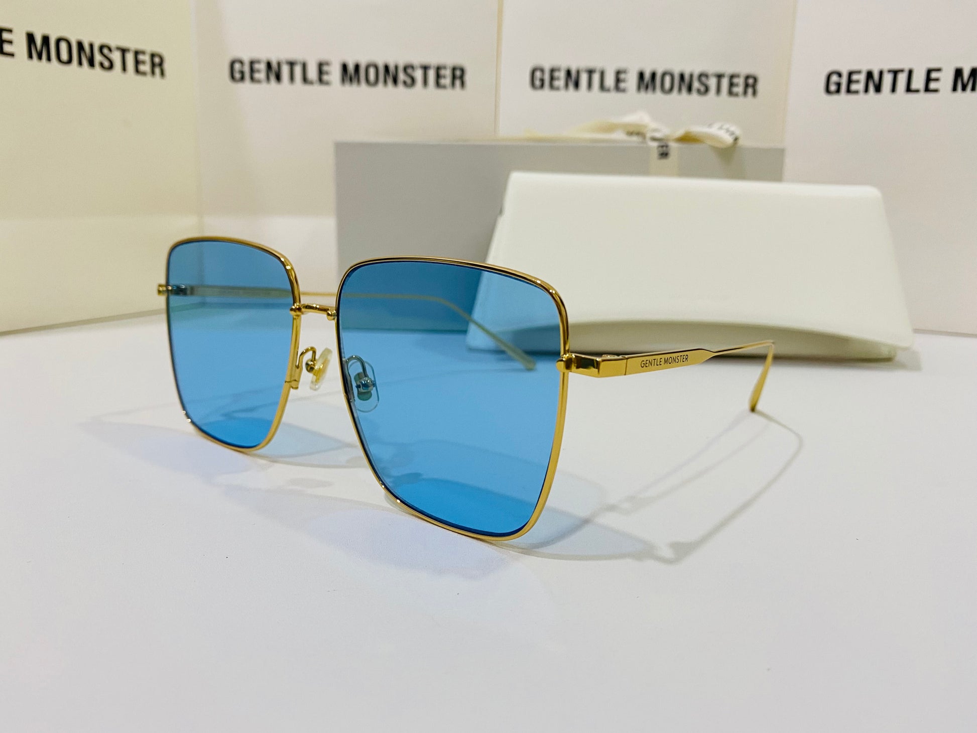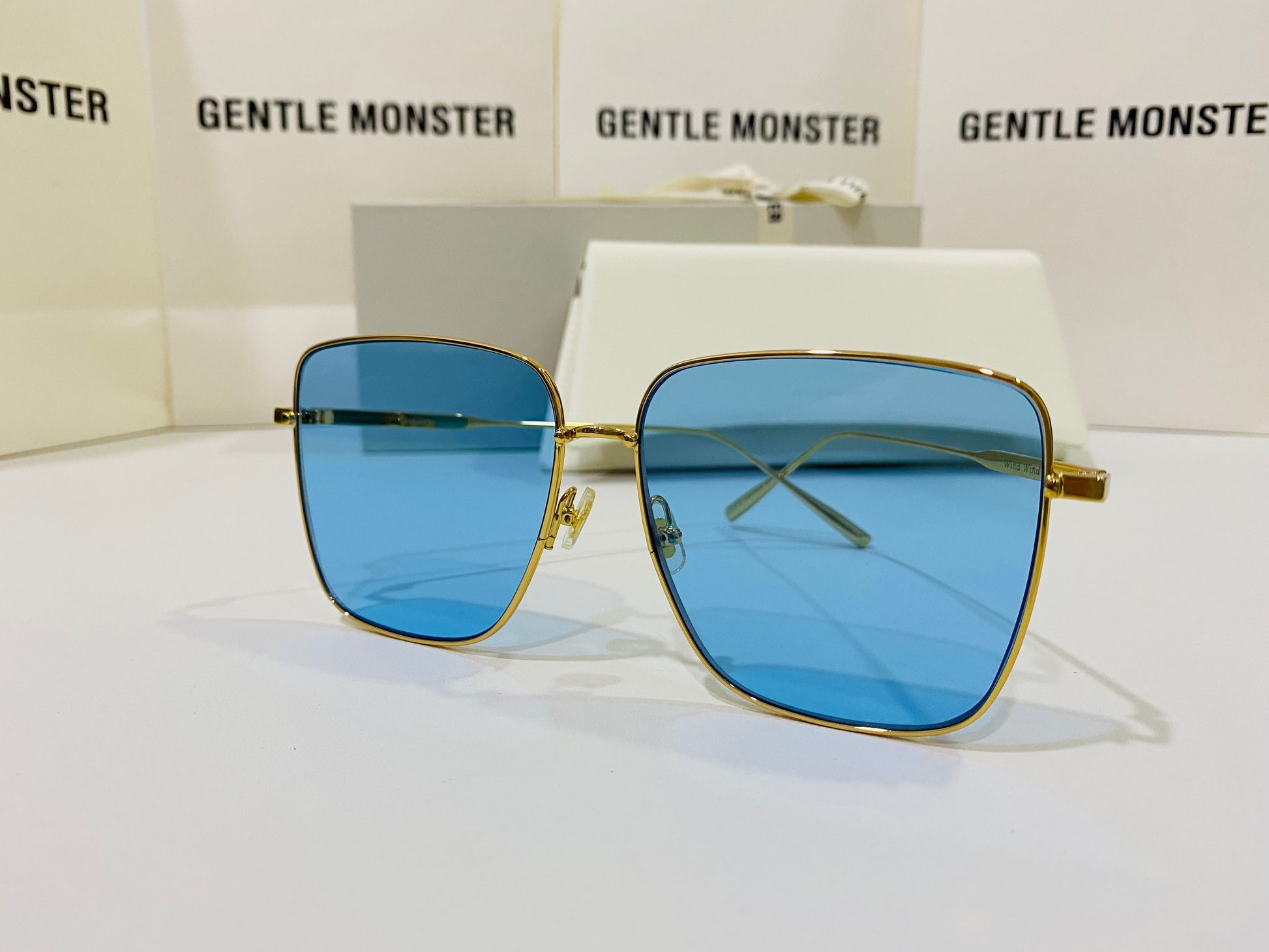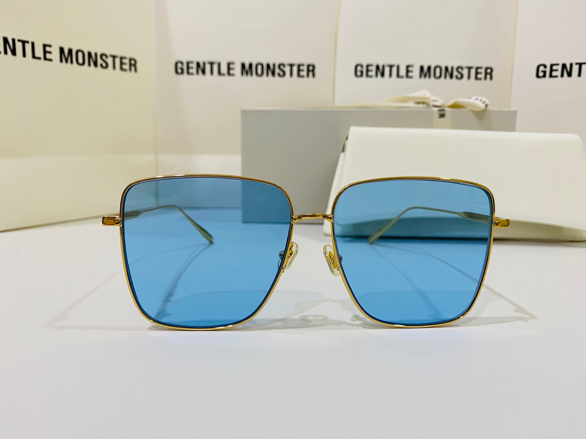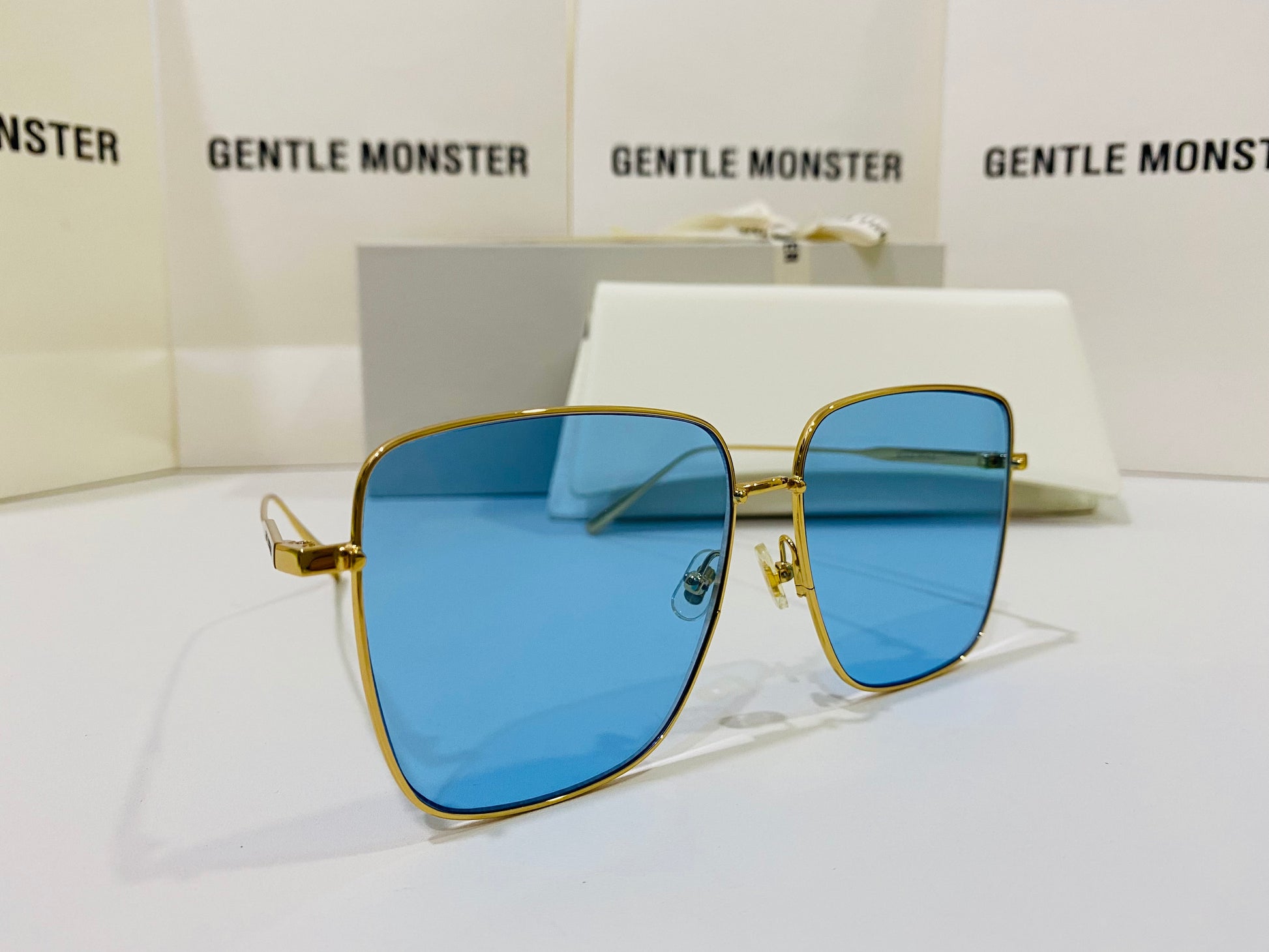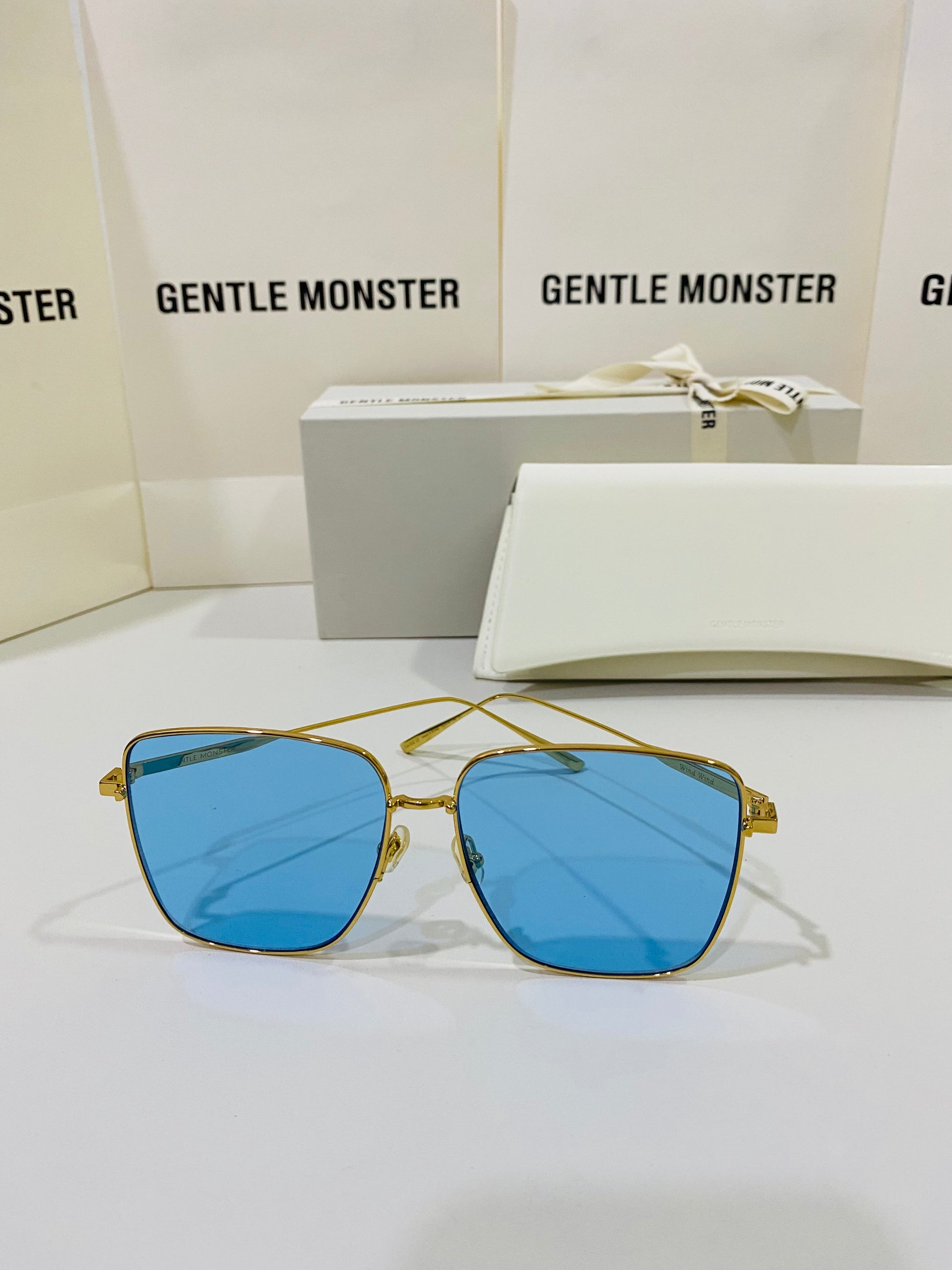 Wind Wind 032 features flat blue lenses in an oversized square metal frame to create a retro silhouette. This frame is complemented with 99.9% UV protected lenses and gold temples engraved with Gentle Monster.