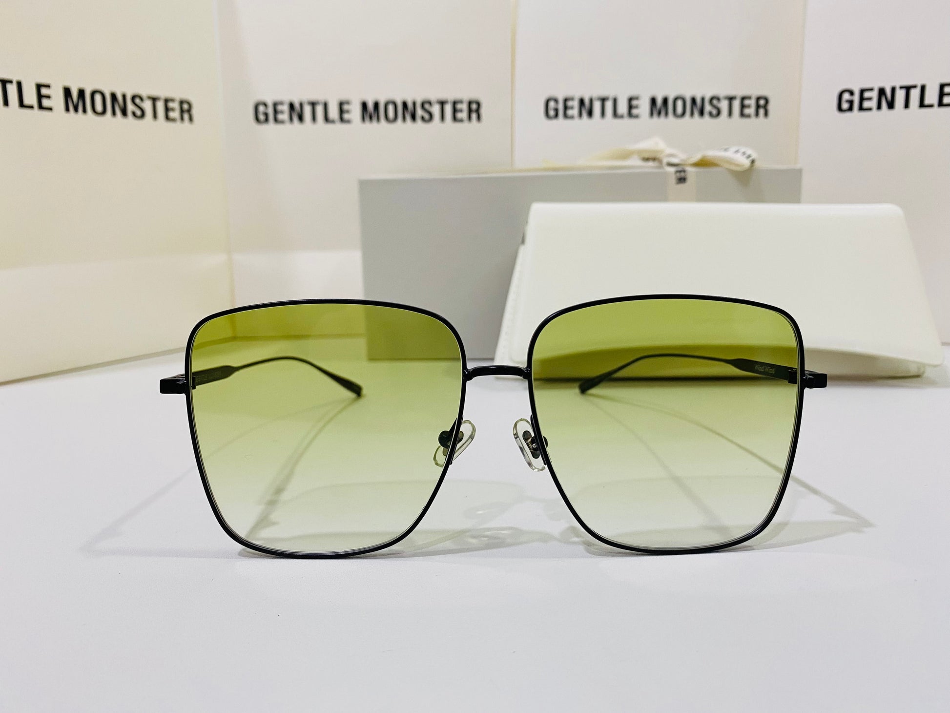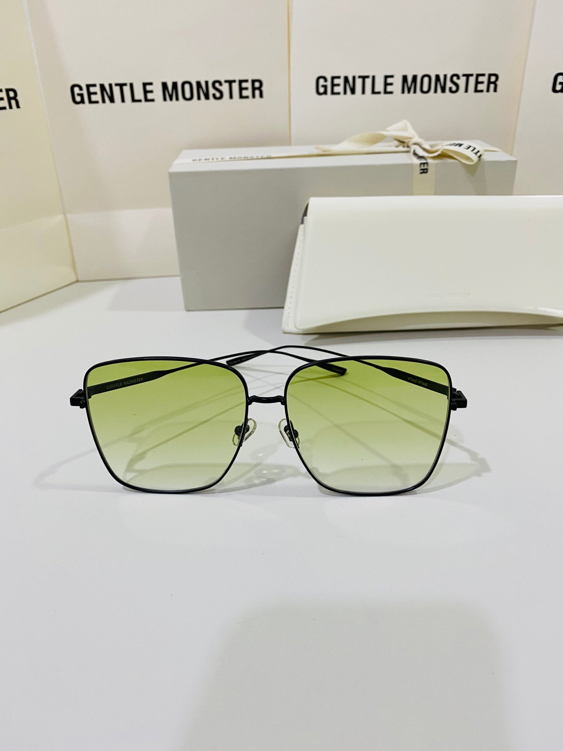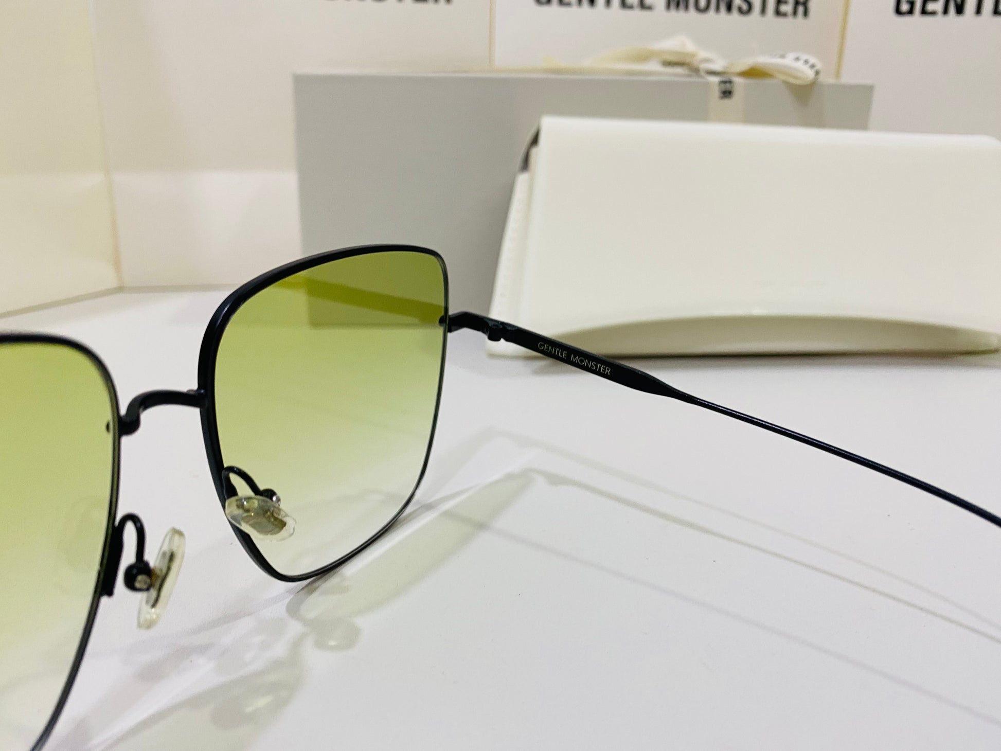 Wind Wind M01 features flat green gradient lenses in an oversized square metal frame to create a retro silhouette. This frame is complemented with 99.9% UV protected lenses and black temples engraved with Gentle Monster.
