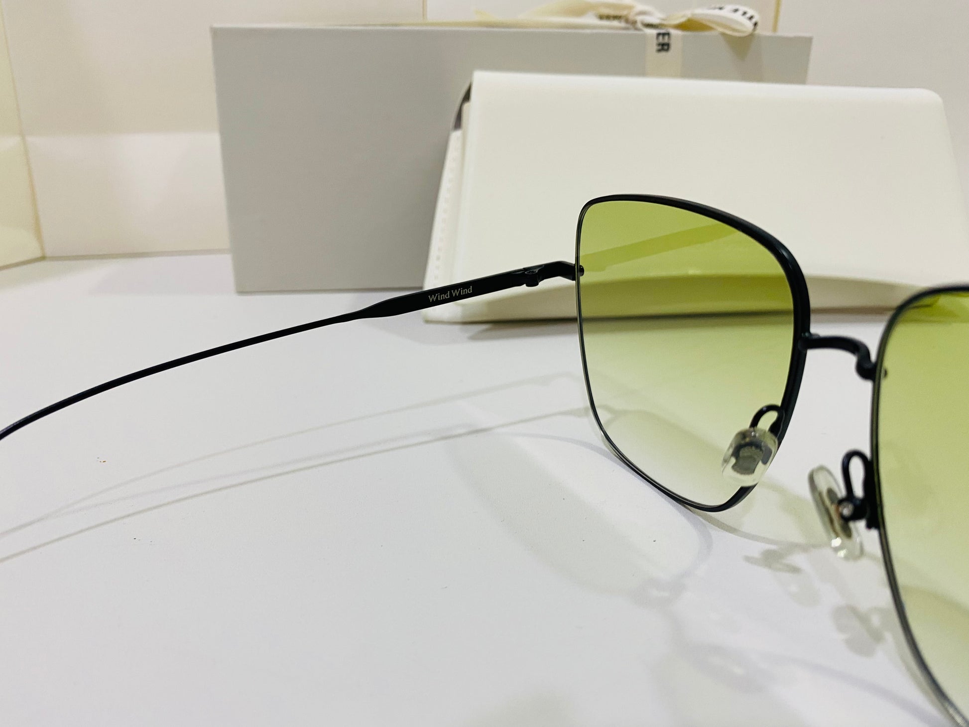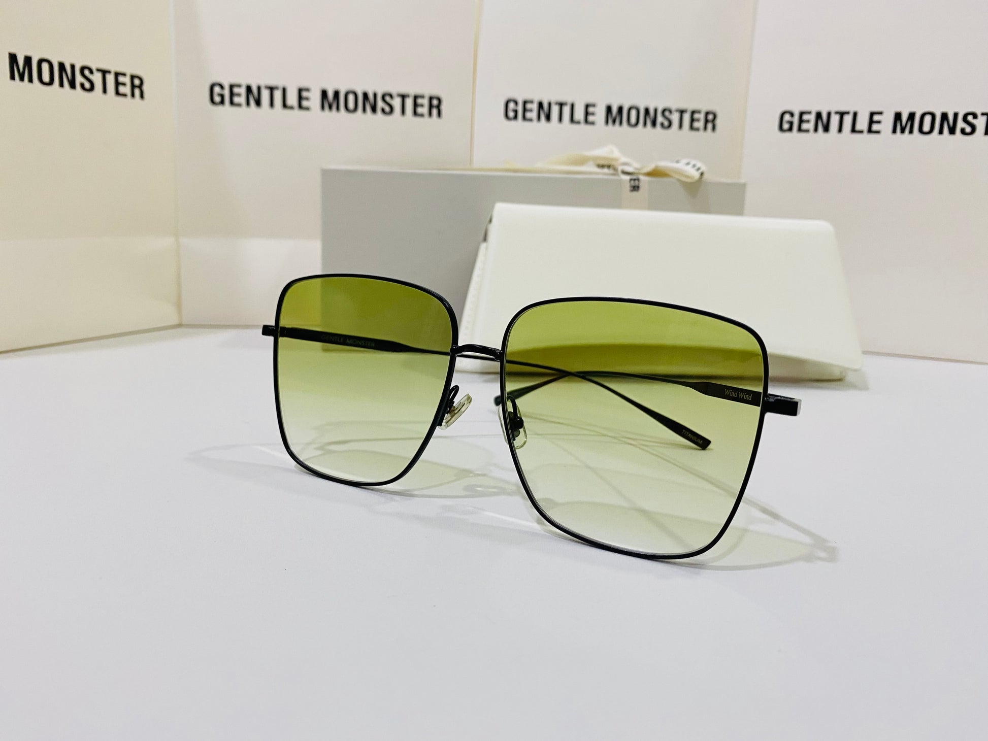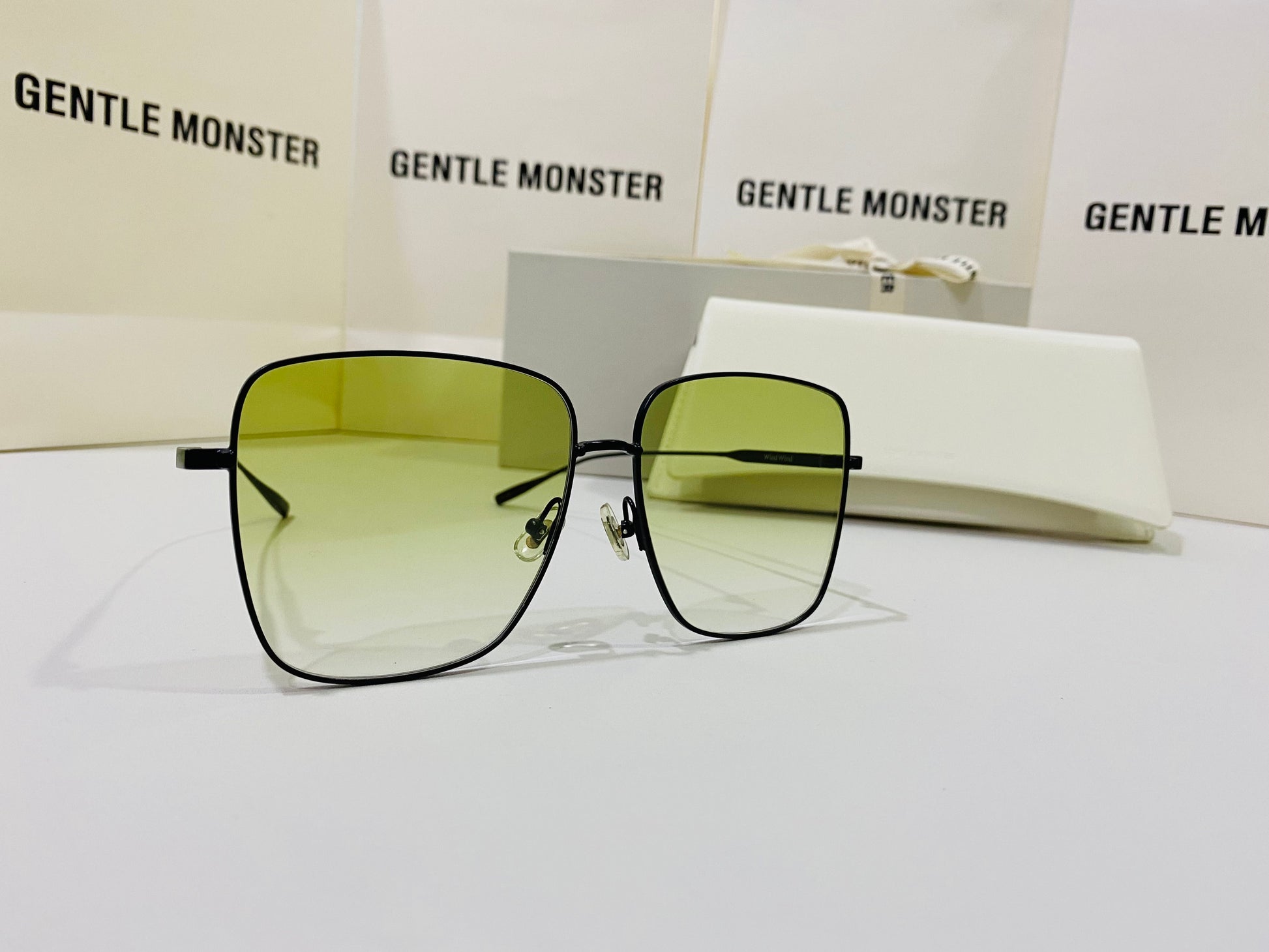 Wind Wind M01 features flat green gradient lenses in an oversized square metal frame to create a retro silhouette. This frame is complemented with 99.9% UV protected lenses and black temples engraved with Gentle Monster.